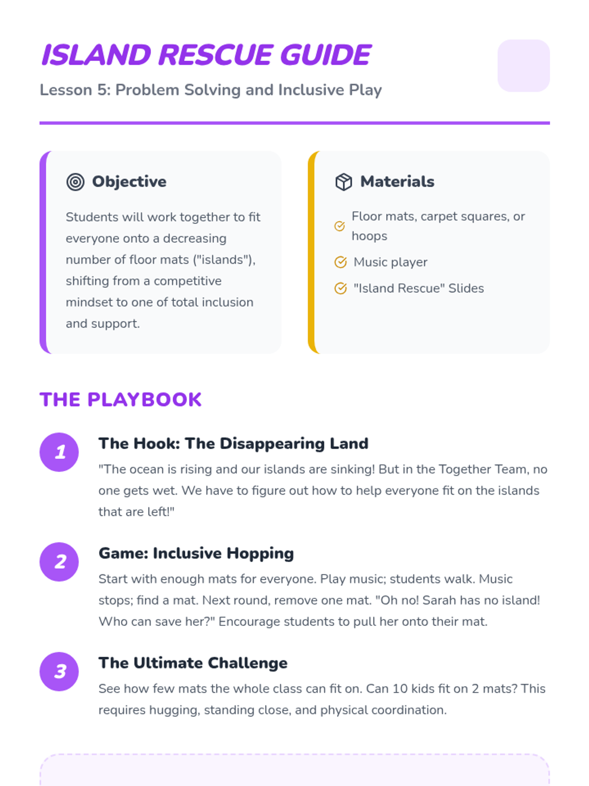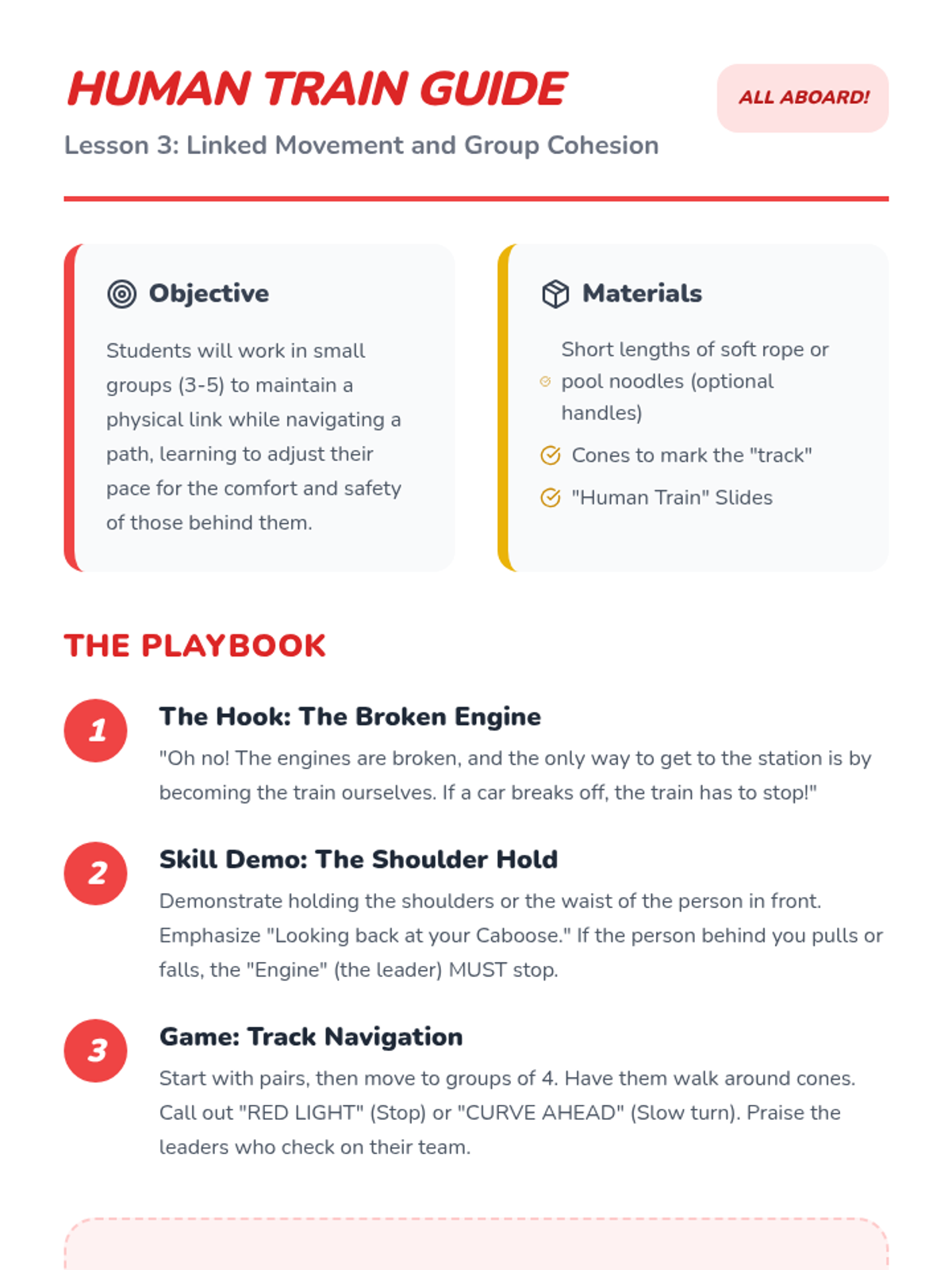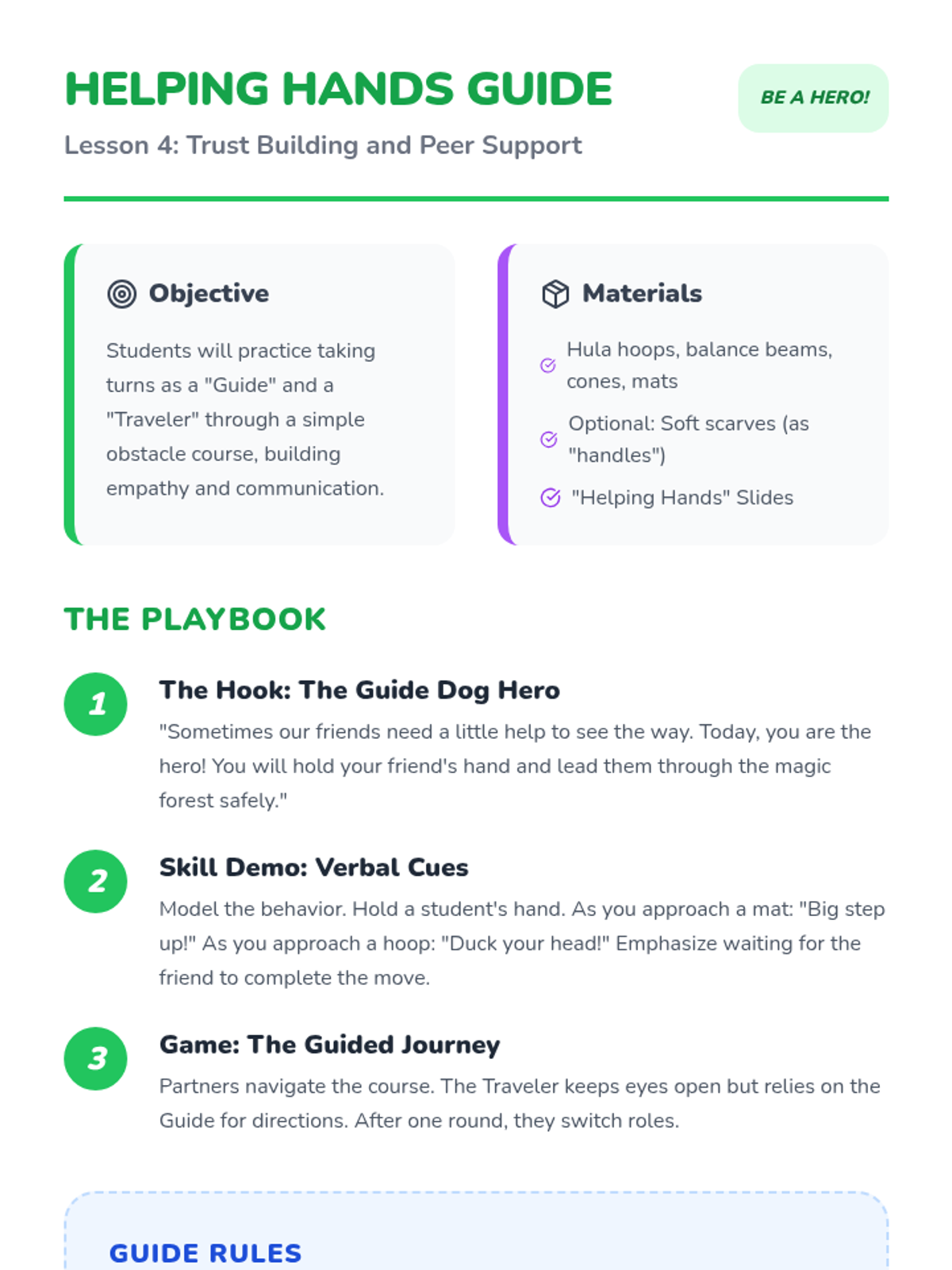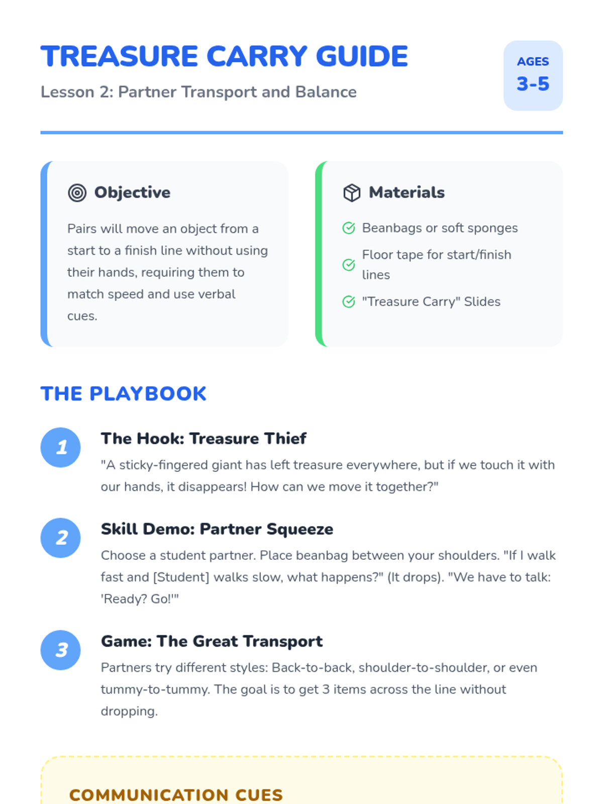 This sequence focuses on building interpersonal communication and trust through partner and small-group physical challenges. Pre-K students learn to verbalize needs, offer physical assistance, and coordinate movements to achieve shared objectives in a cooperative environment.