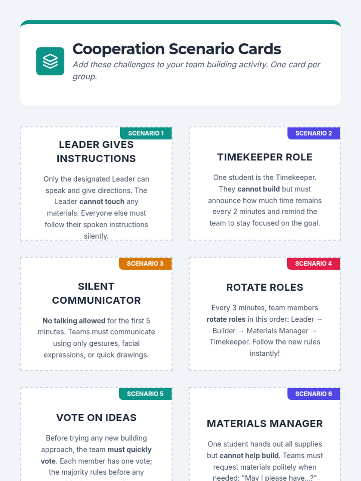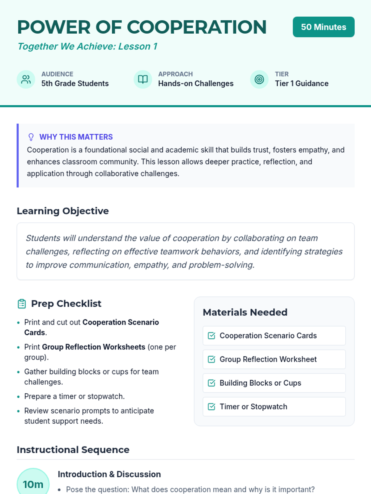 A two-part social skills sequence for 5th graders focusing on cooperation and effective communication to strengthen classroom community through hands-on challenges and role-play.