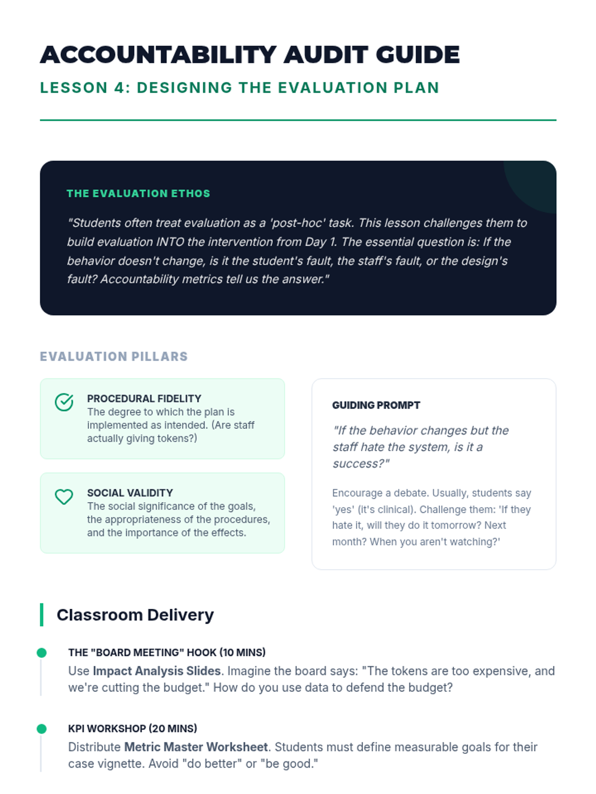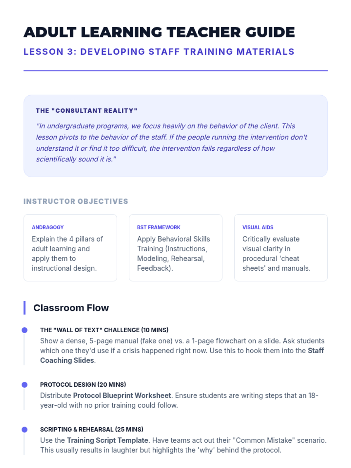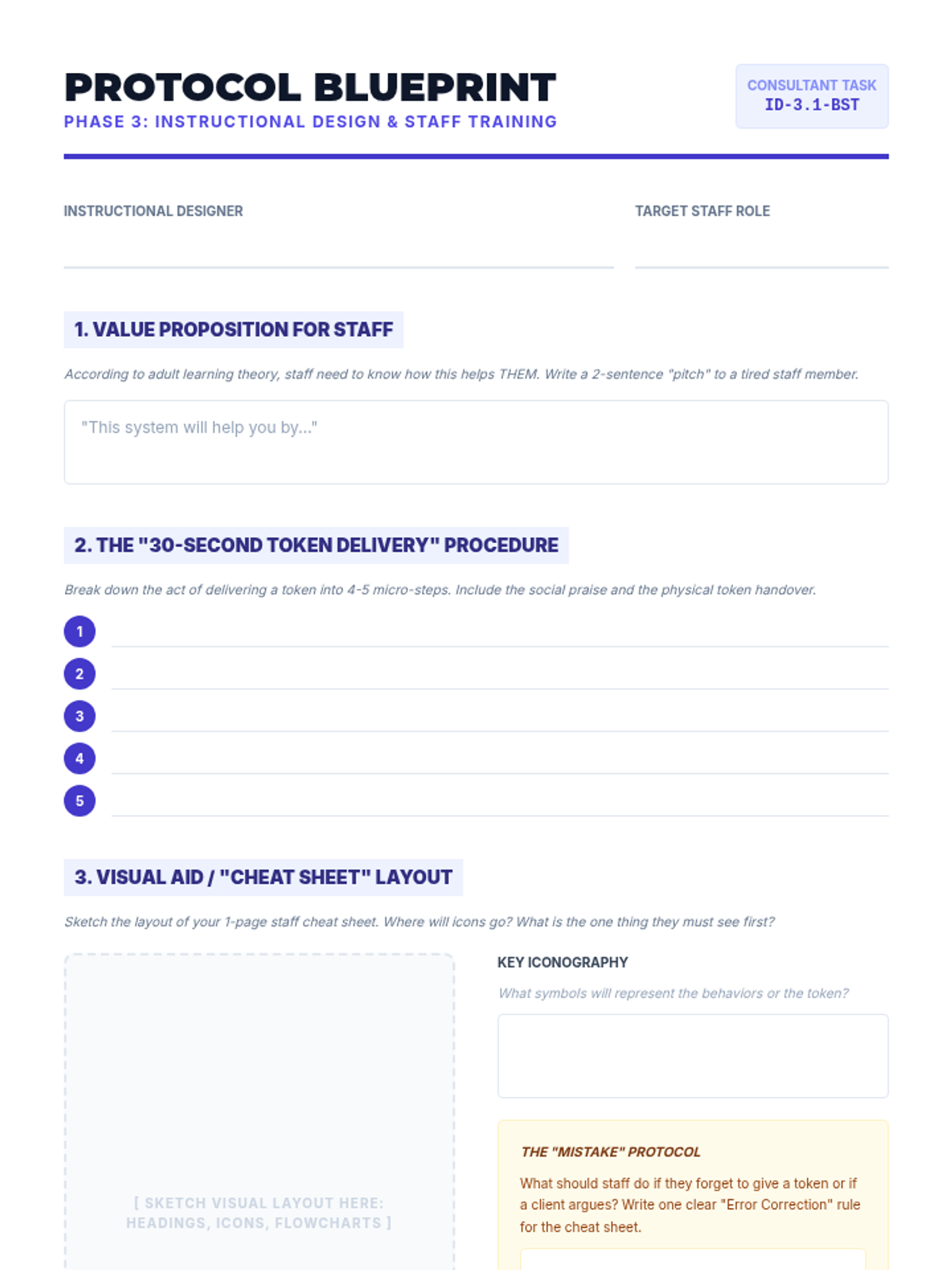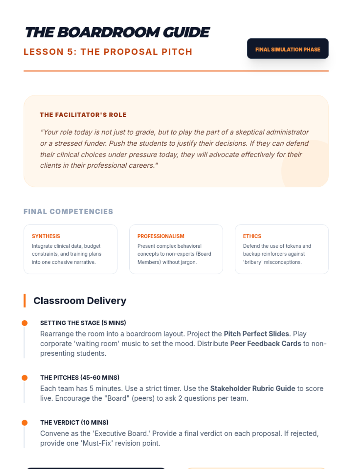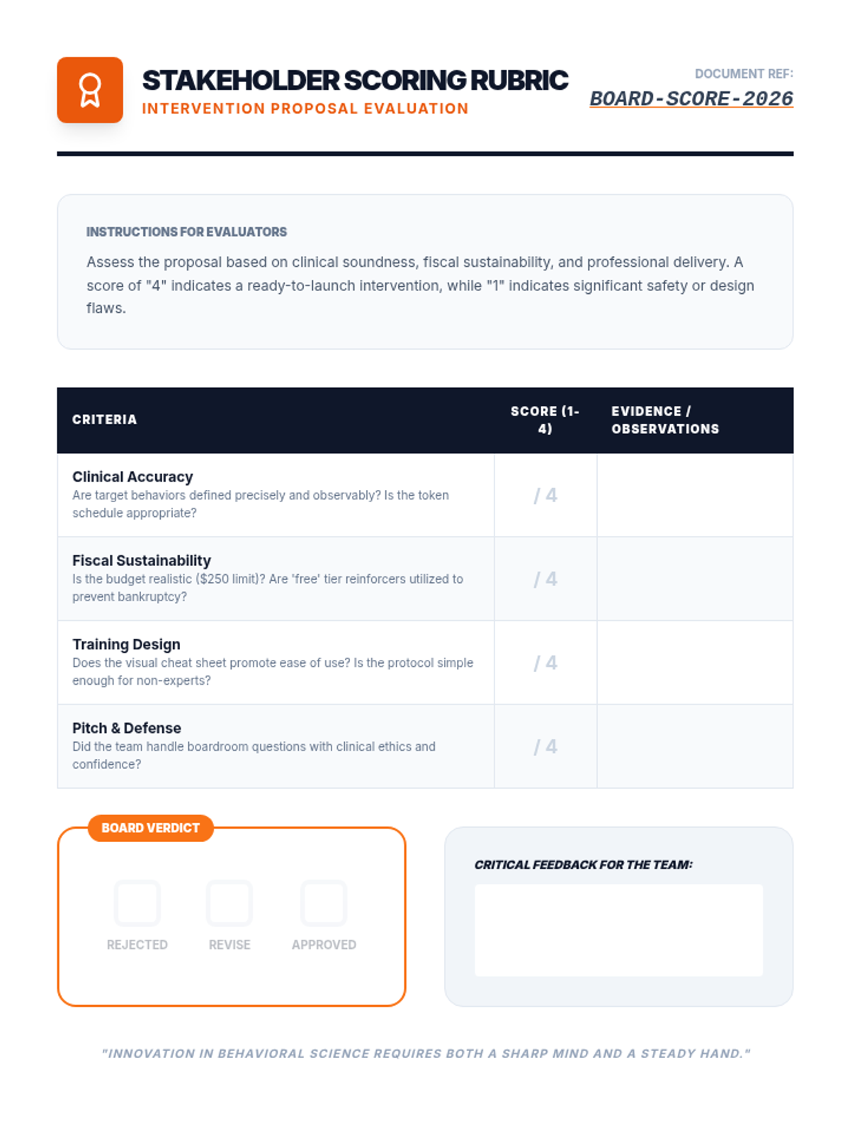 A professional, project-based sequence where students act as behavioral consultants to design, budget, and pitch a comprehensive token economy intervention. Students analyze complex cases, manage resources, and develop staff training protocols to ensure sustainable behavioral change.