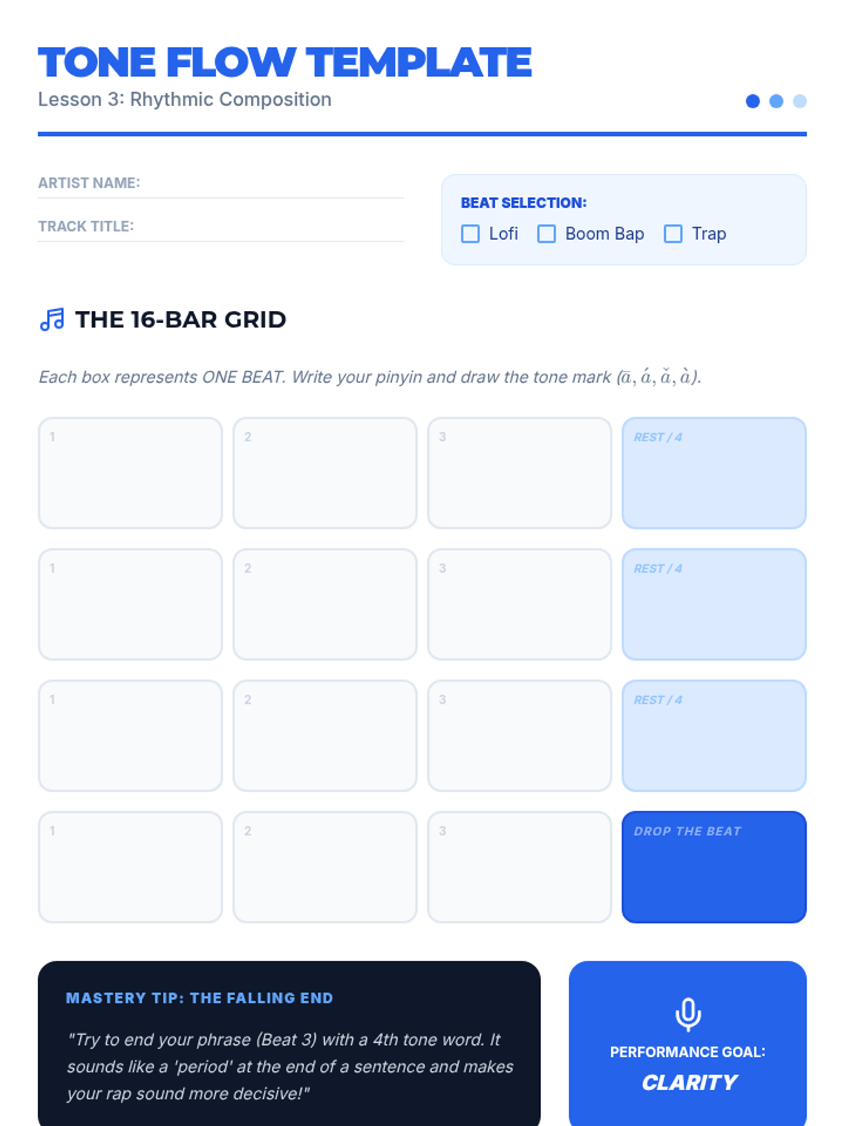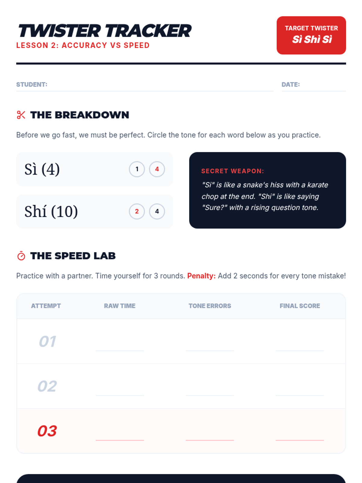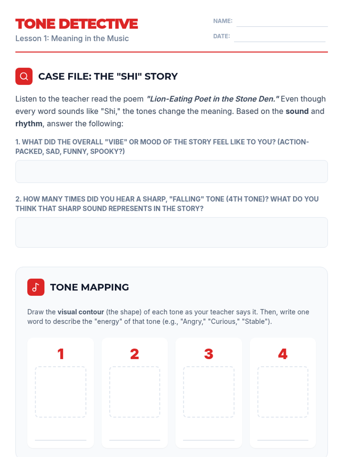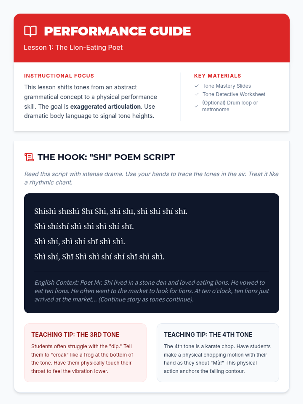 A project-based sequence for 7th graders focusing on Mandarin tones through performance, exaggeration, and rhythmic chanting. Students develop muscle memory and oral fluency by engaging with tongue twisters, poetry, and recording analysis.