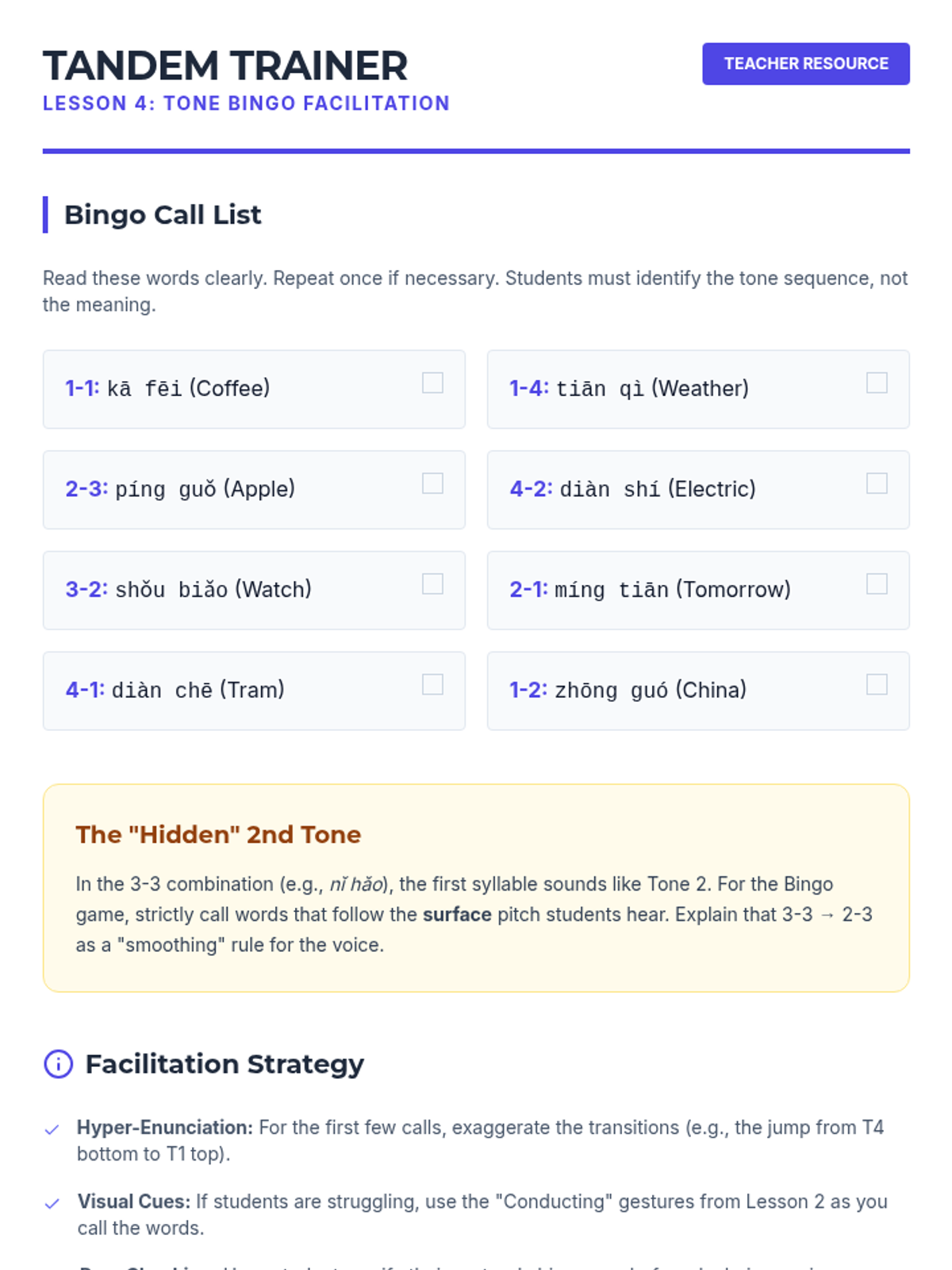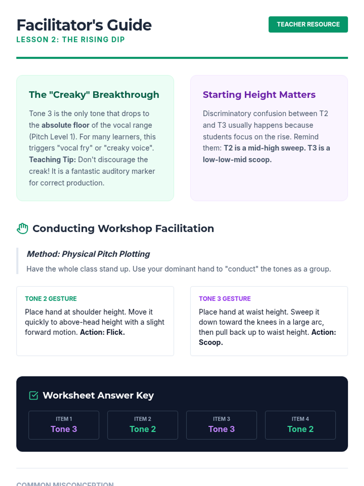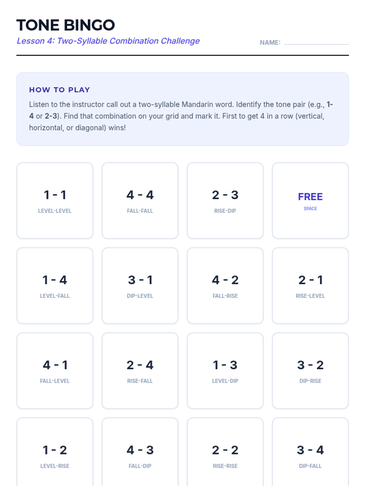 A foundational sequence for Pre-K learners to explore the four tones of Mandarin Chinese through auditory play, physical movement, and vocal exploration. Students learn to associate pitch changes with meaning using relatable sounds like questioning 'Huh?' or firm 'No!' gestures.