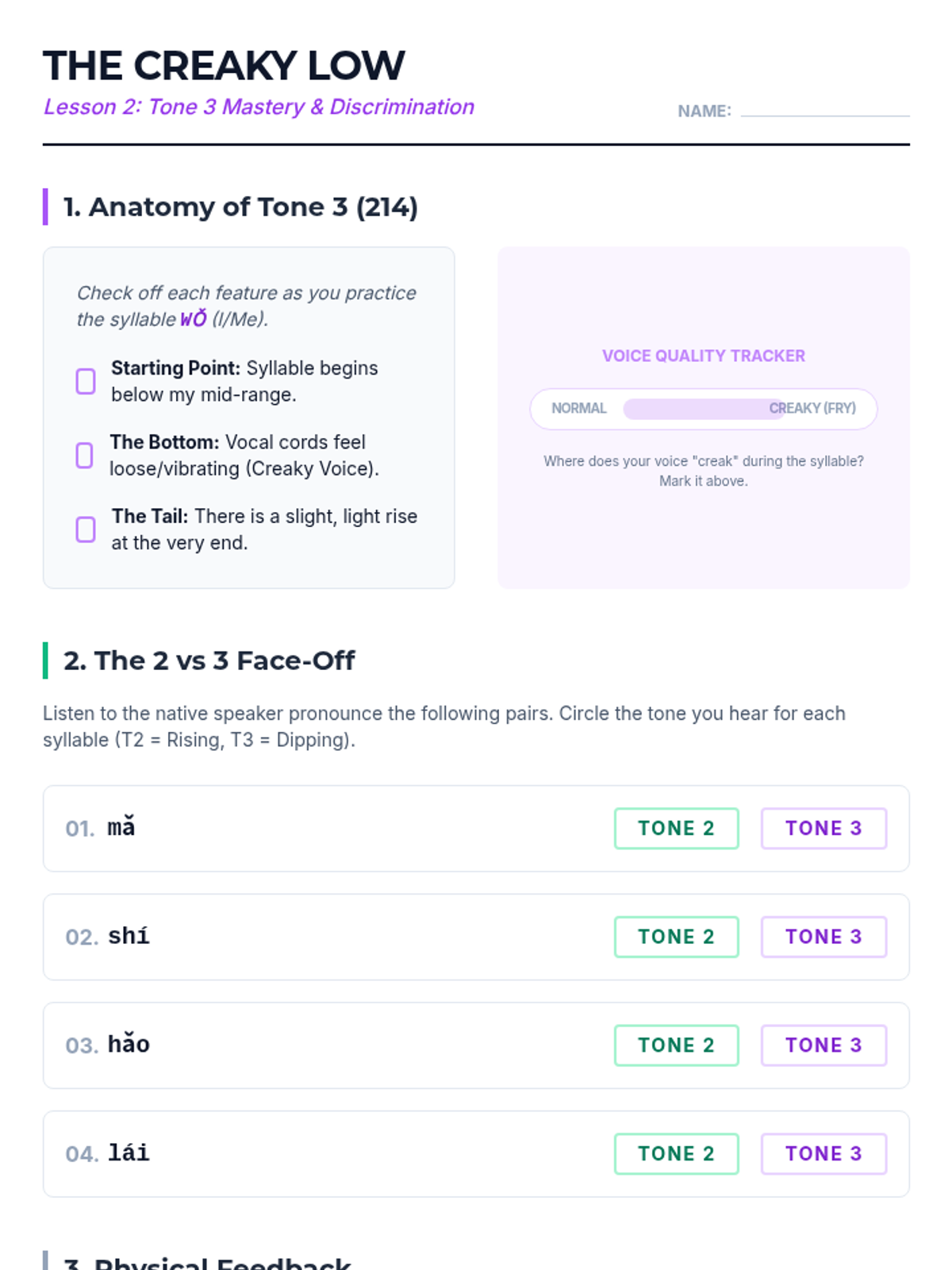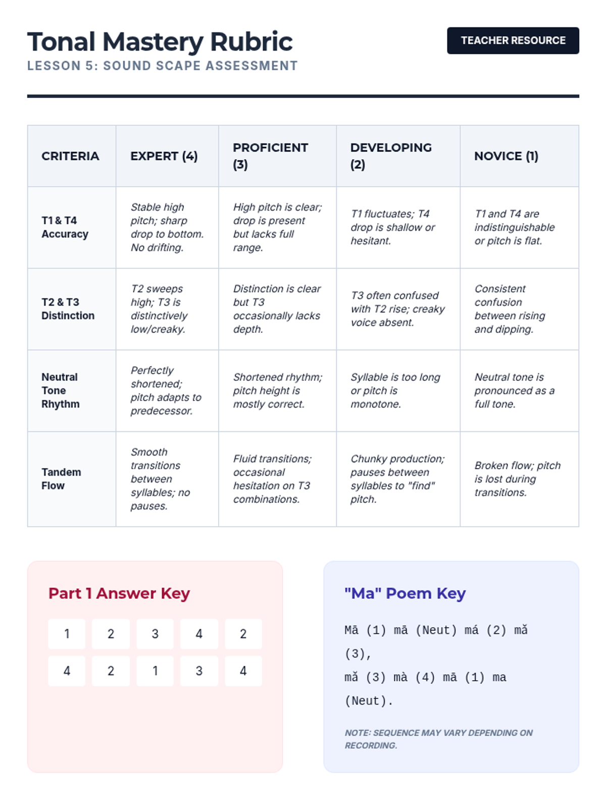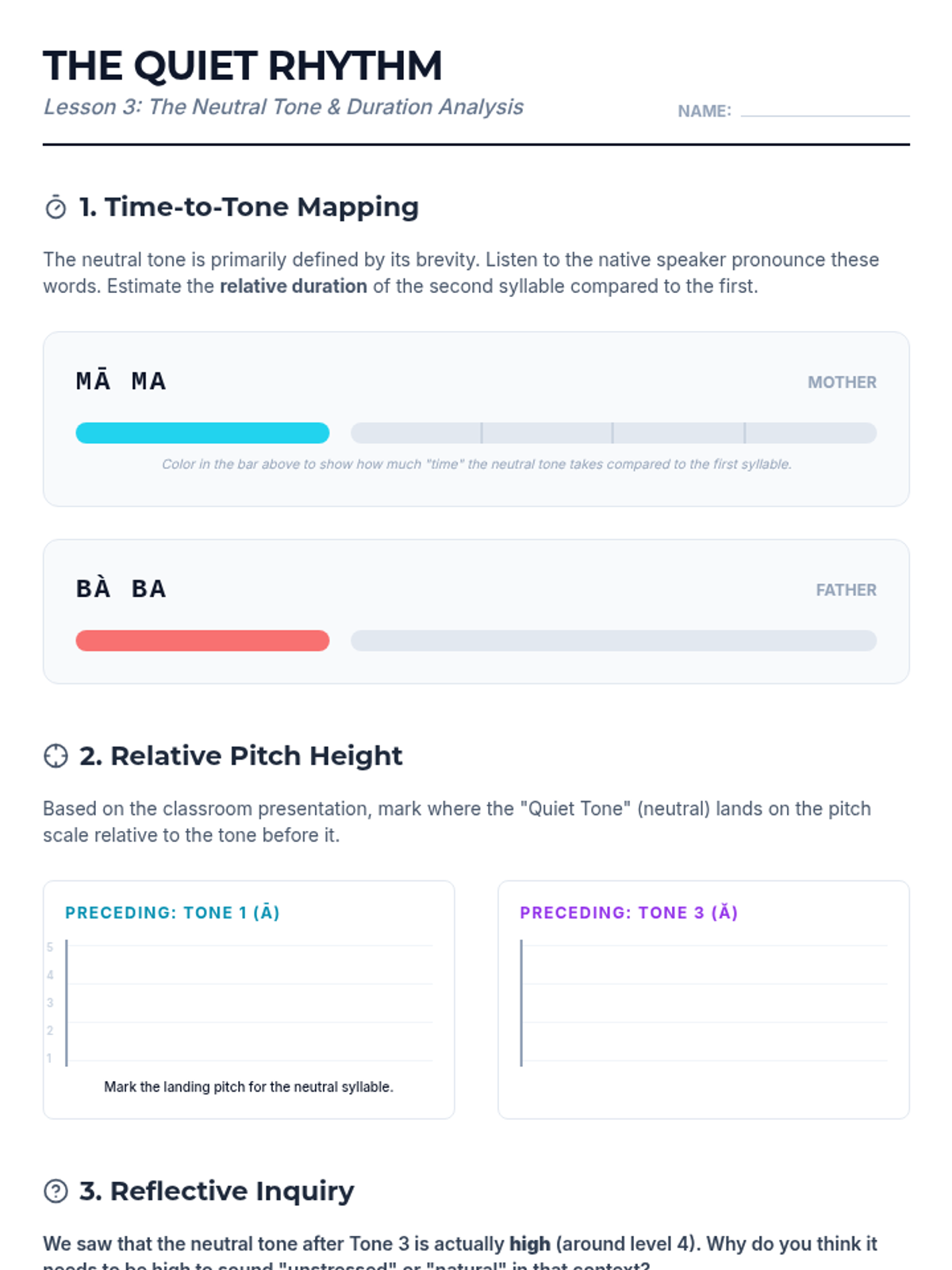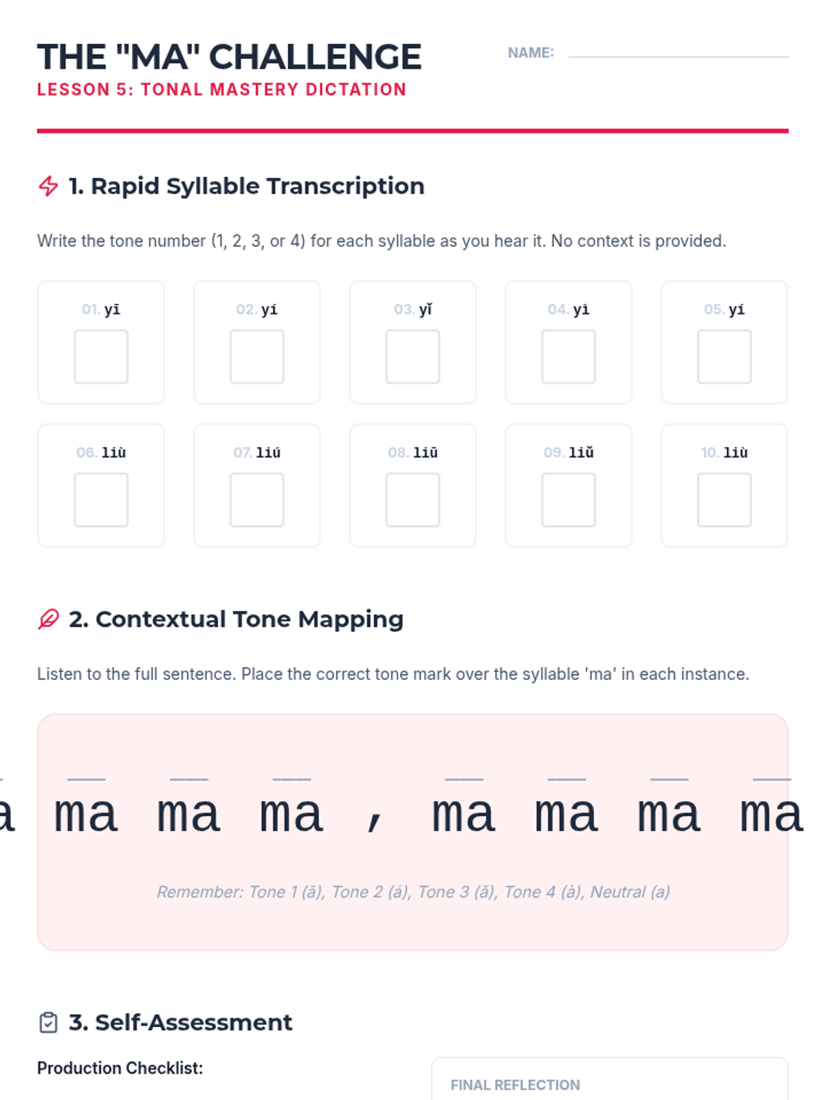 A workshop-style sequence for undergraduate students focusing on the mechanics of Mandarin tonal production. Students use pitch visualization and comparative analysis to master the four main tones and the neutral tone in isolation and context.