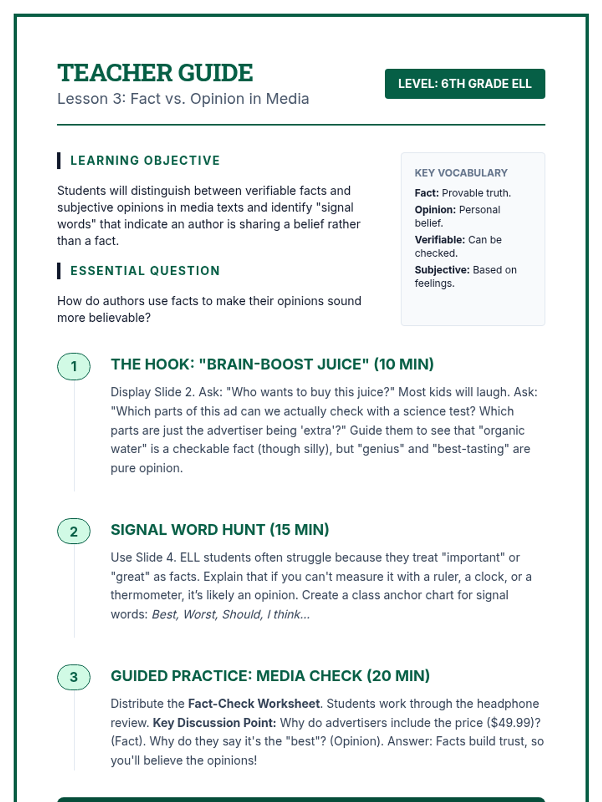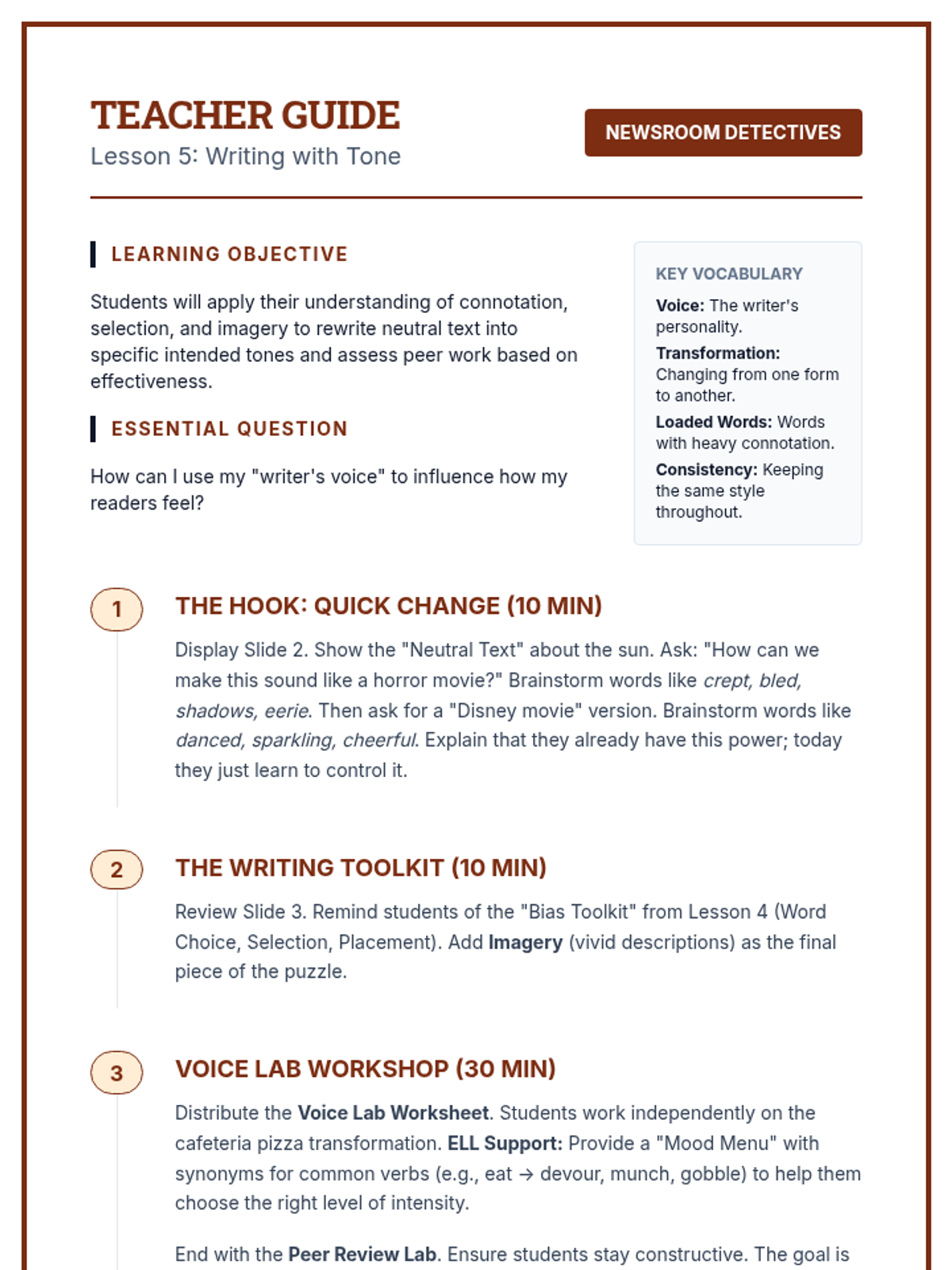 This sequence teaches 6th-grade students to analyze persuasive writing by understanding denotation, connotation, tone, and bias. Students will move from basic vocabulary nuance to complex media literacy skills, learning to identify how authors influence readers through word choice and perspective.