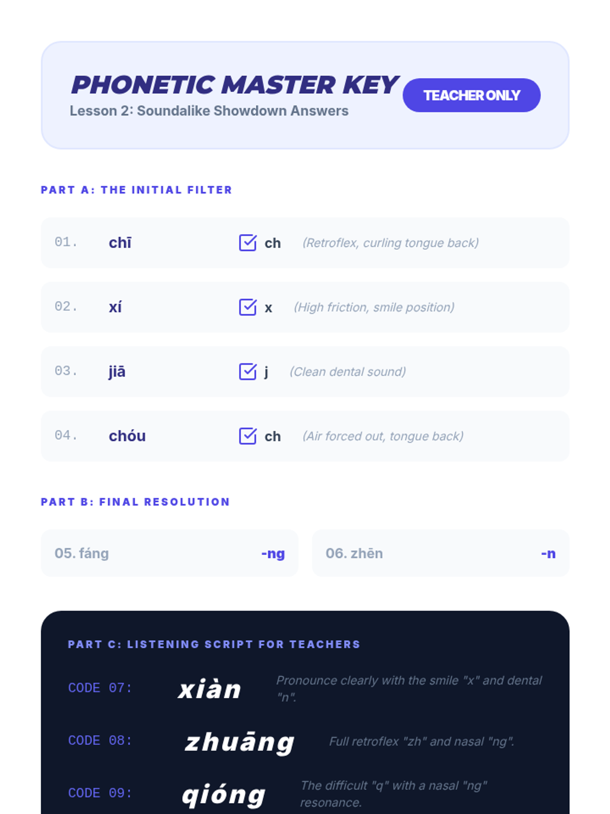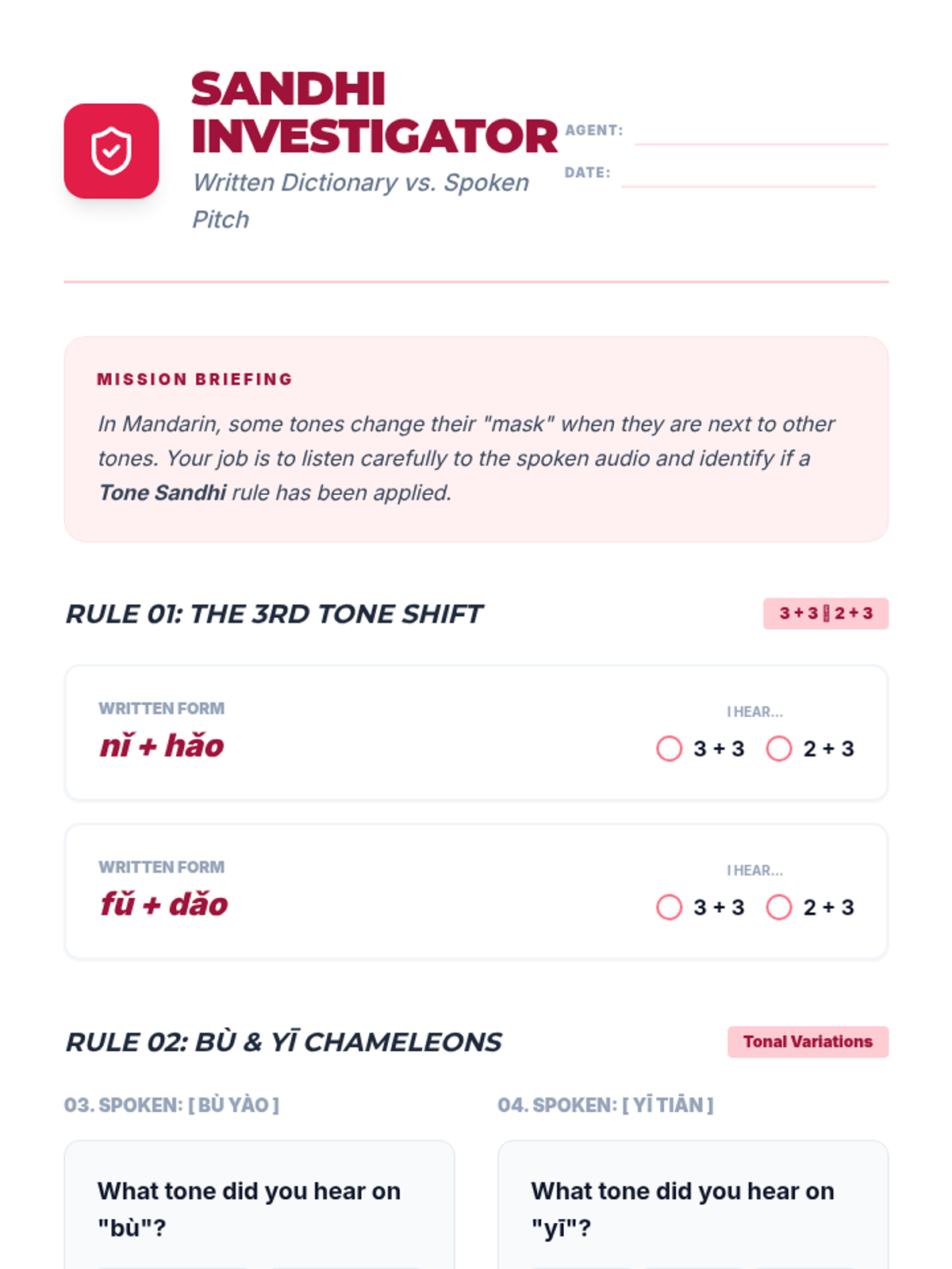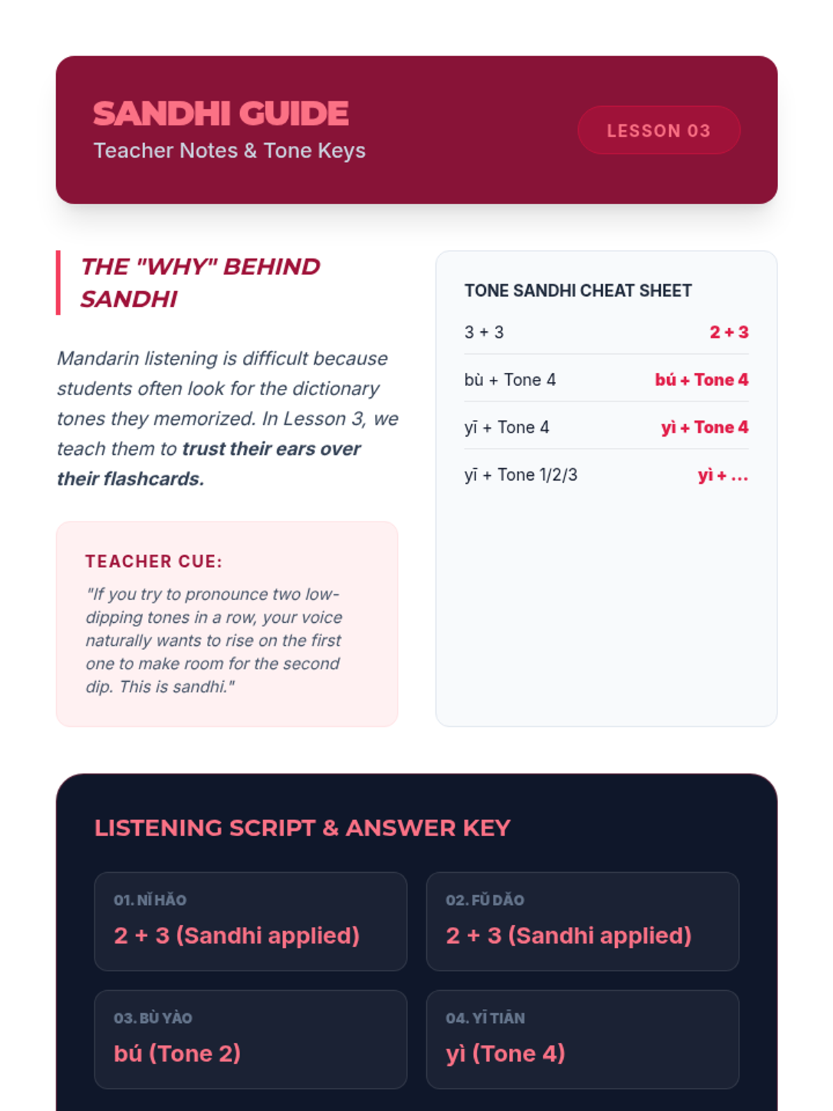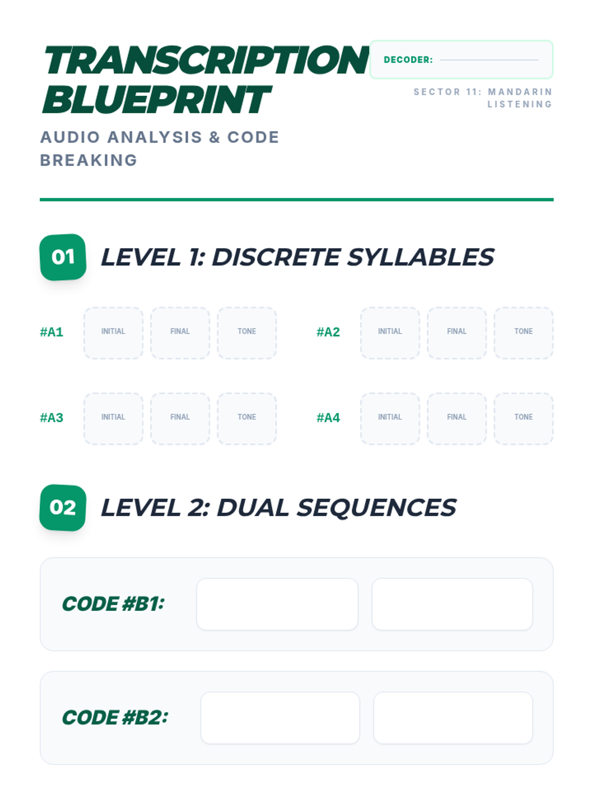 This foundational sequence for 11th-grade Mandarin students focuses on auditory discrimination, tonal accuracy, and Pinyin phonetics. Students move from basic tone recognition to complex sandhi rules and contextual comprehension, emphasizing the critical link between sound and meaning.