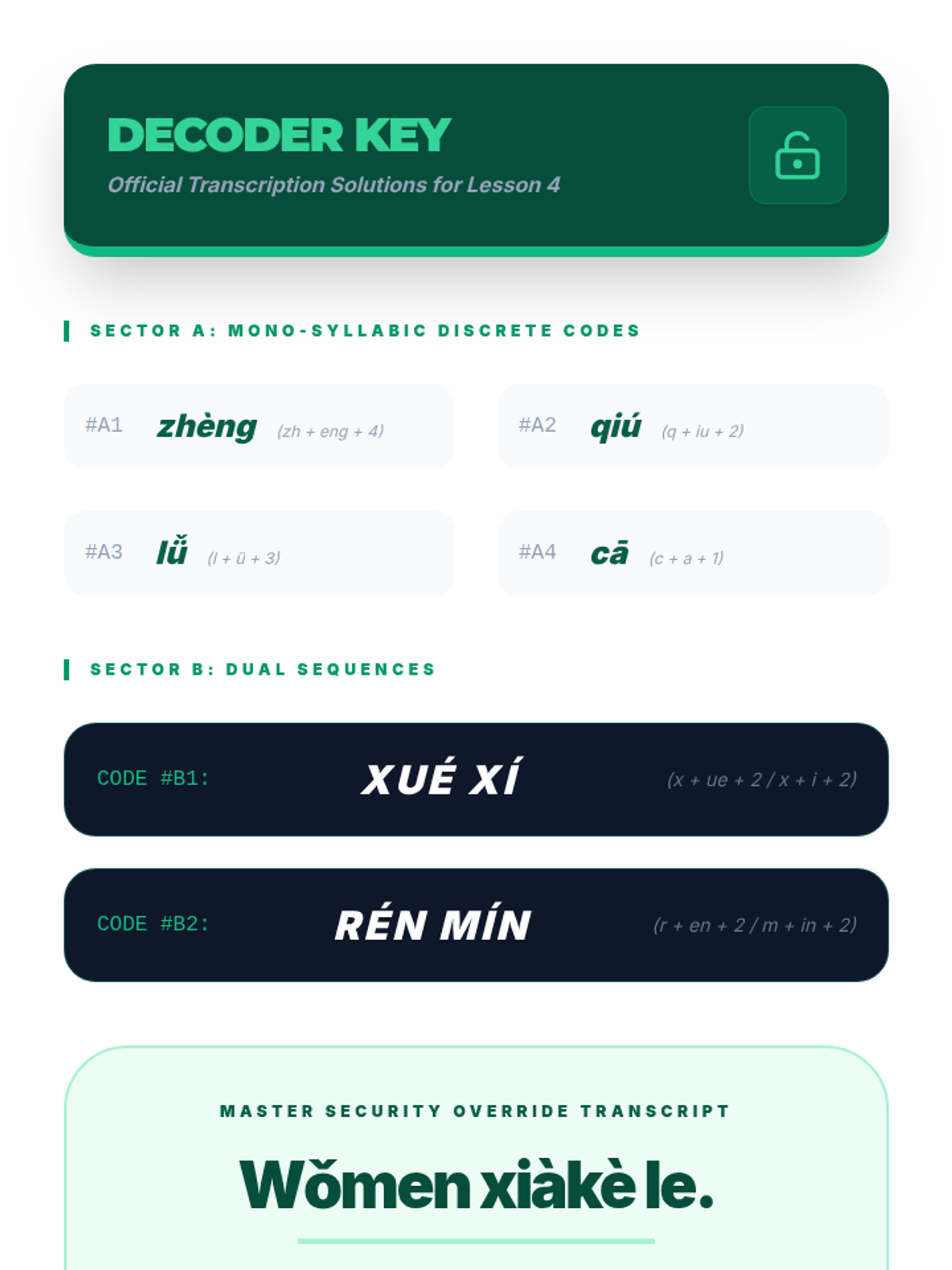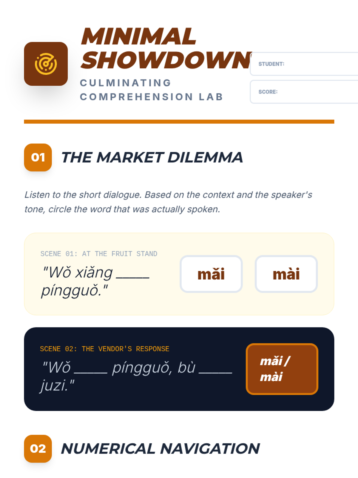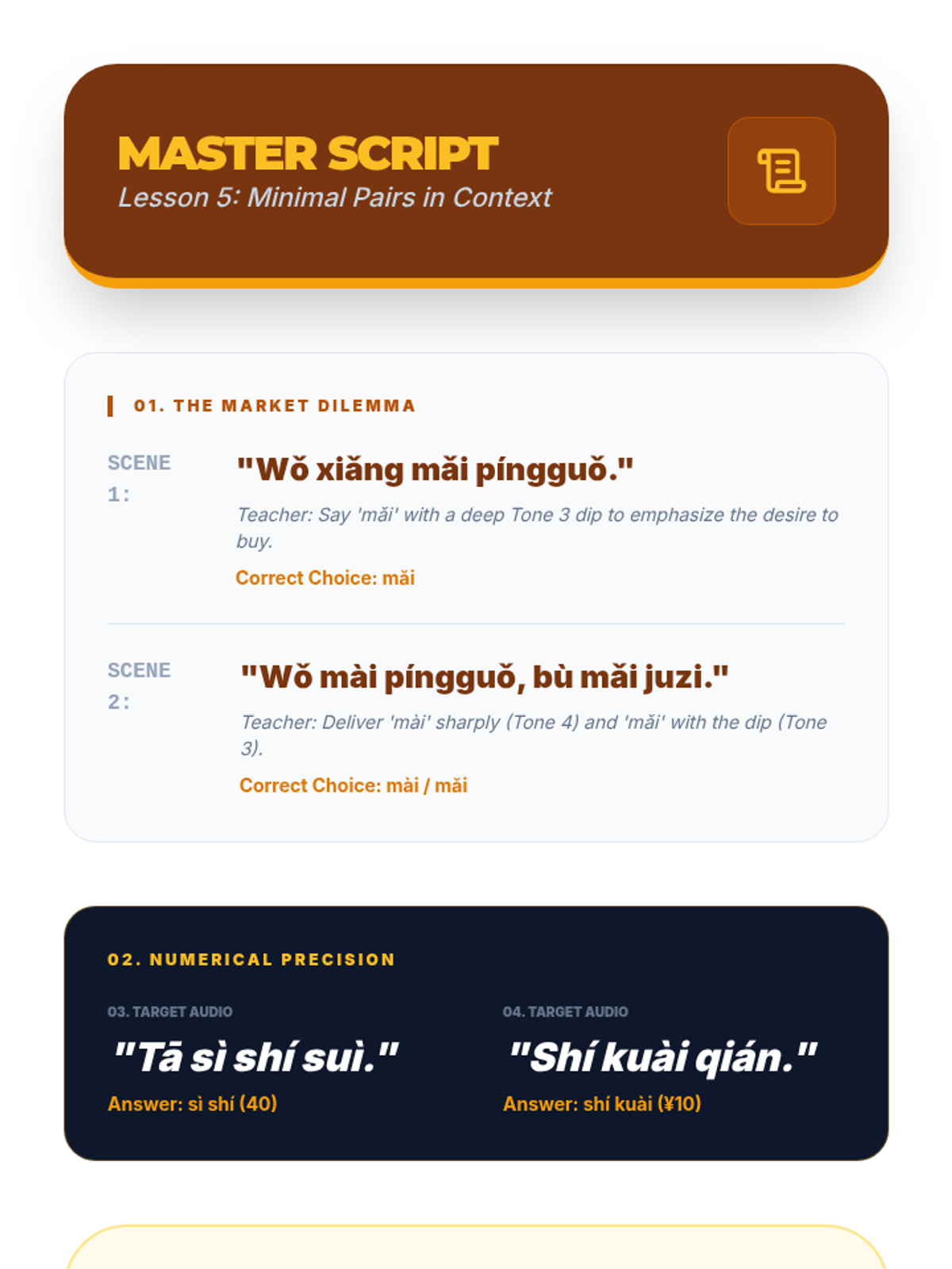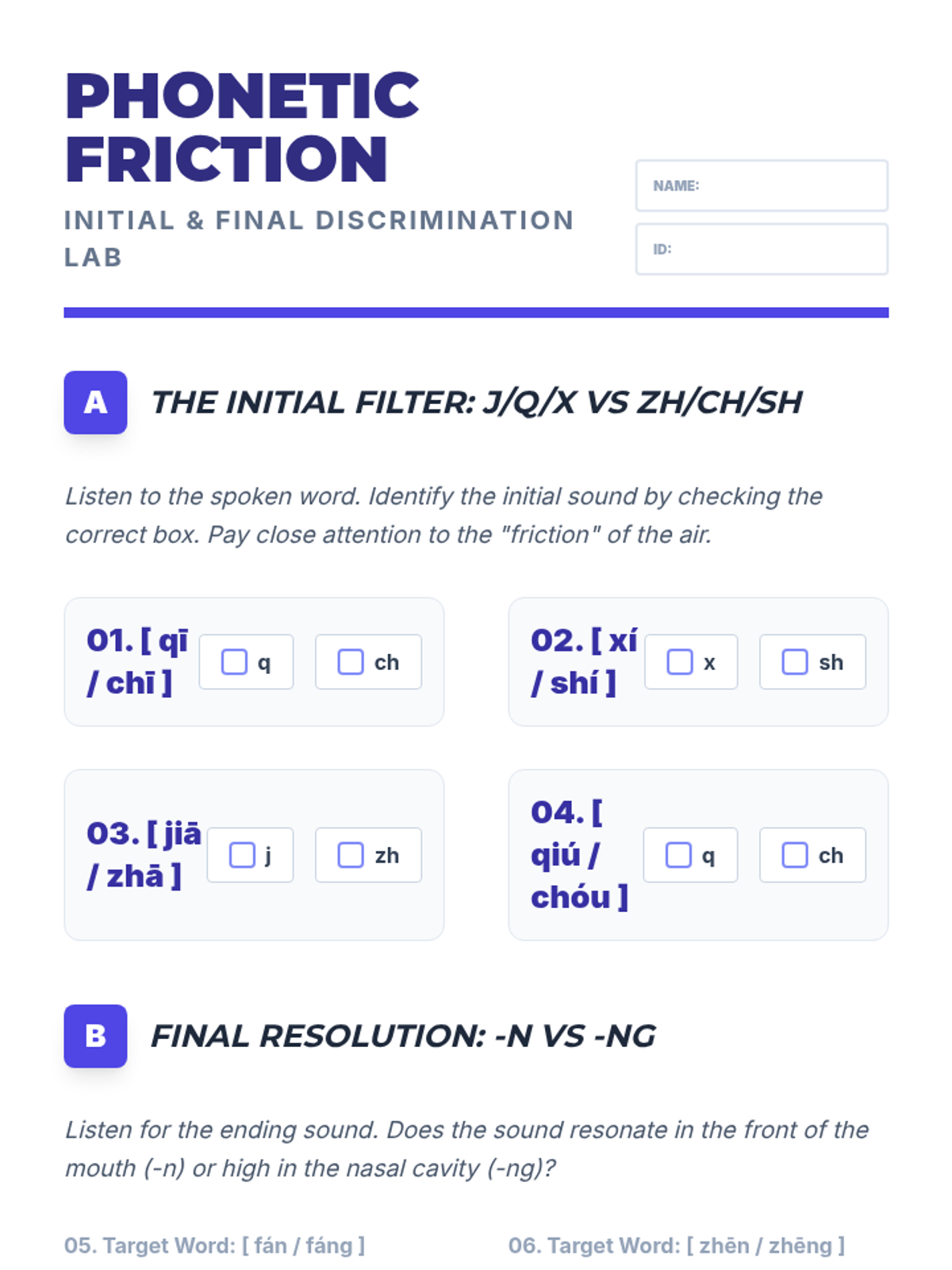 This foundational sequence for 11th-grade Mandarin students focuses on auditory discrimination, tonal accuracy, and Pinyin phonetics. Students move from basic tone recognition to complex sandhi rules and contextual comprehension, emphasizing the critical link between sound and meaning.
