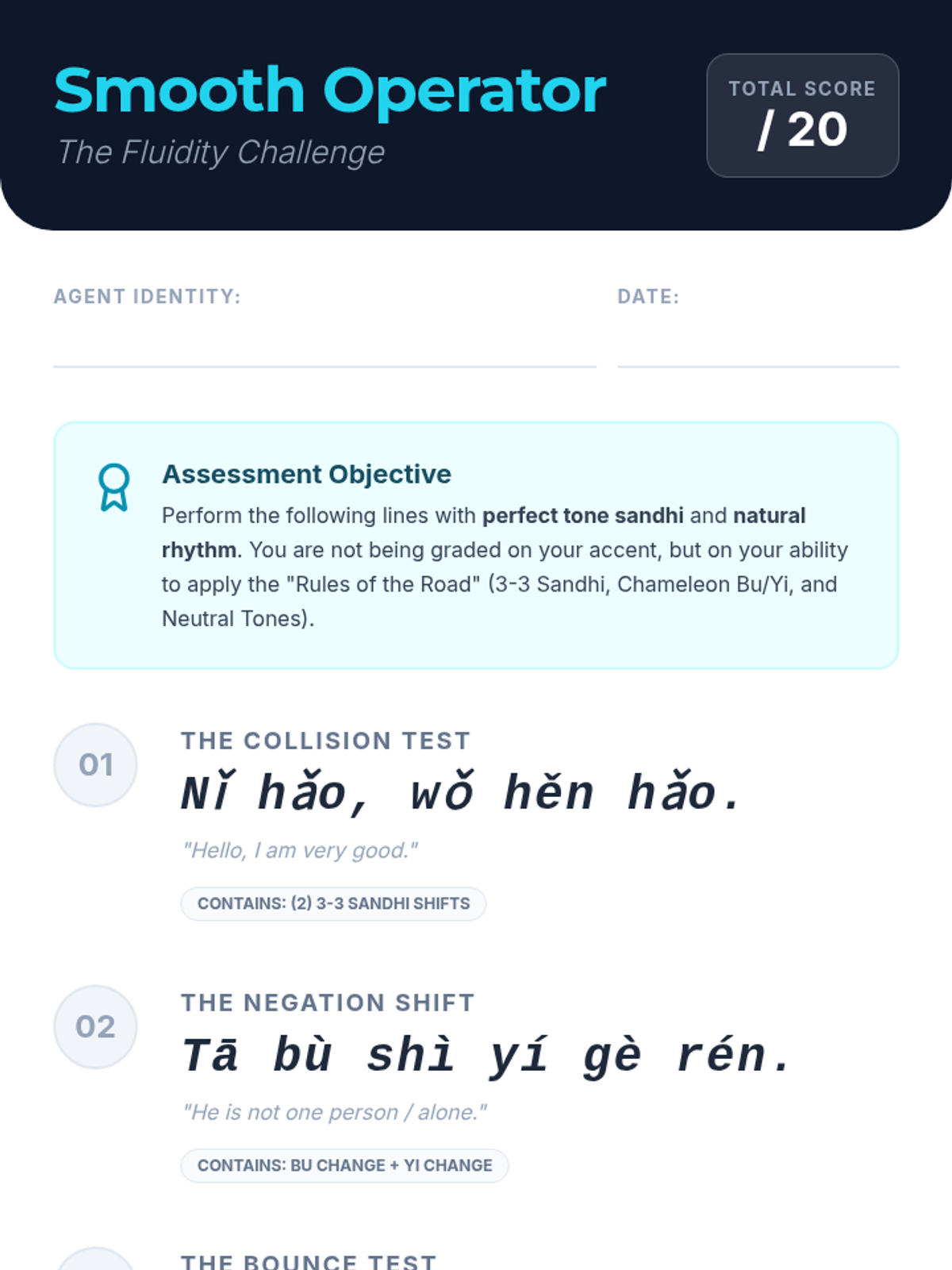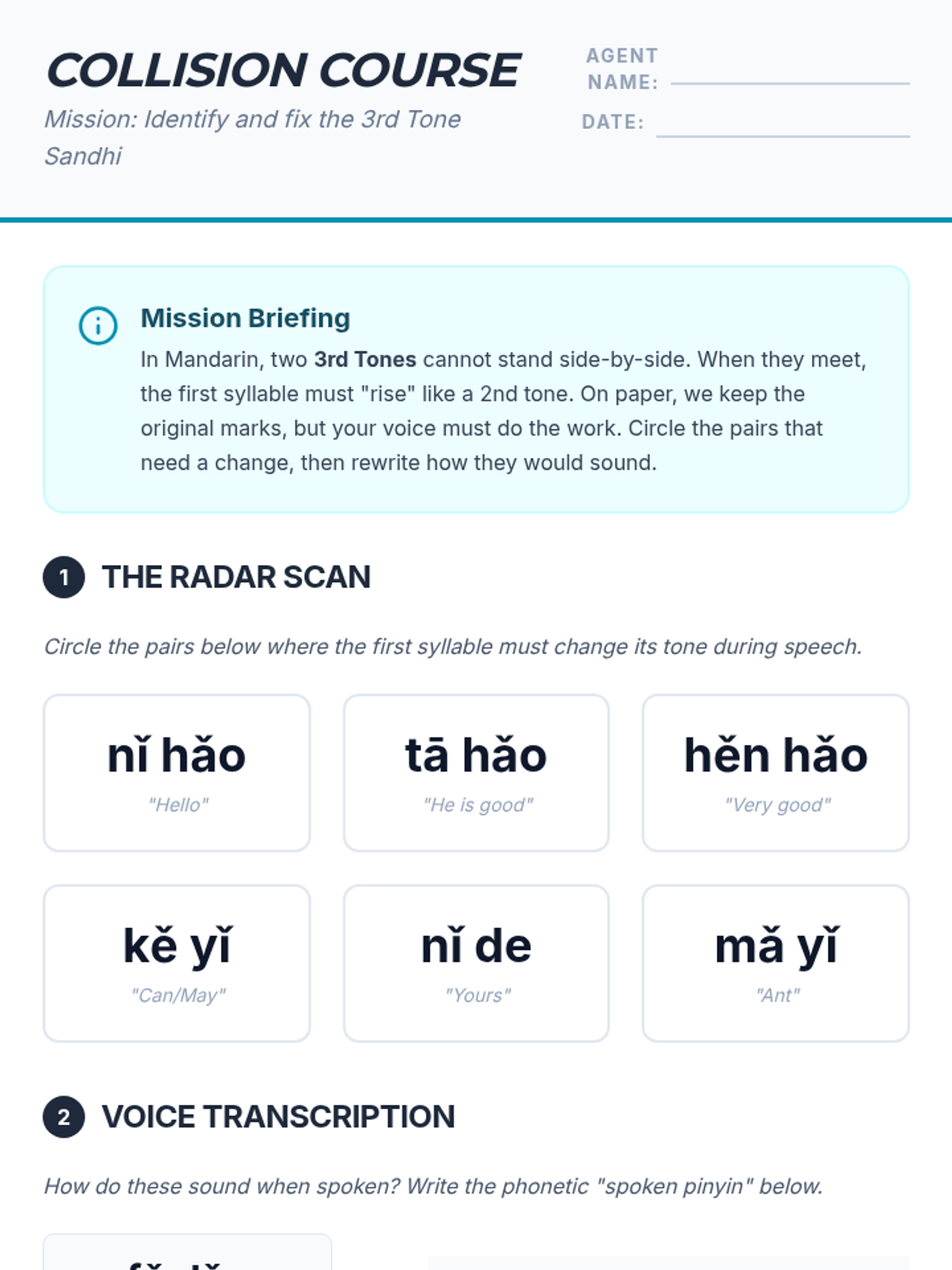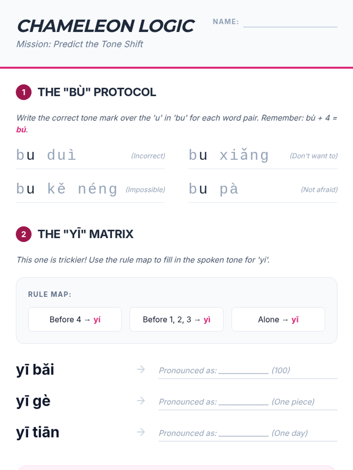 This sequence guides 7th-grade students through the nuanced rules of Mandarin tone changes (Sandhi) and sentence rhythm. Students progress from mastering the 3rd tone shift and neutral tone to navigating the 'chameleon' changes of 'Bu' and 'Yi', culminating in natural sentence prosody and a fluidity assessment.