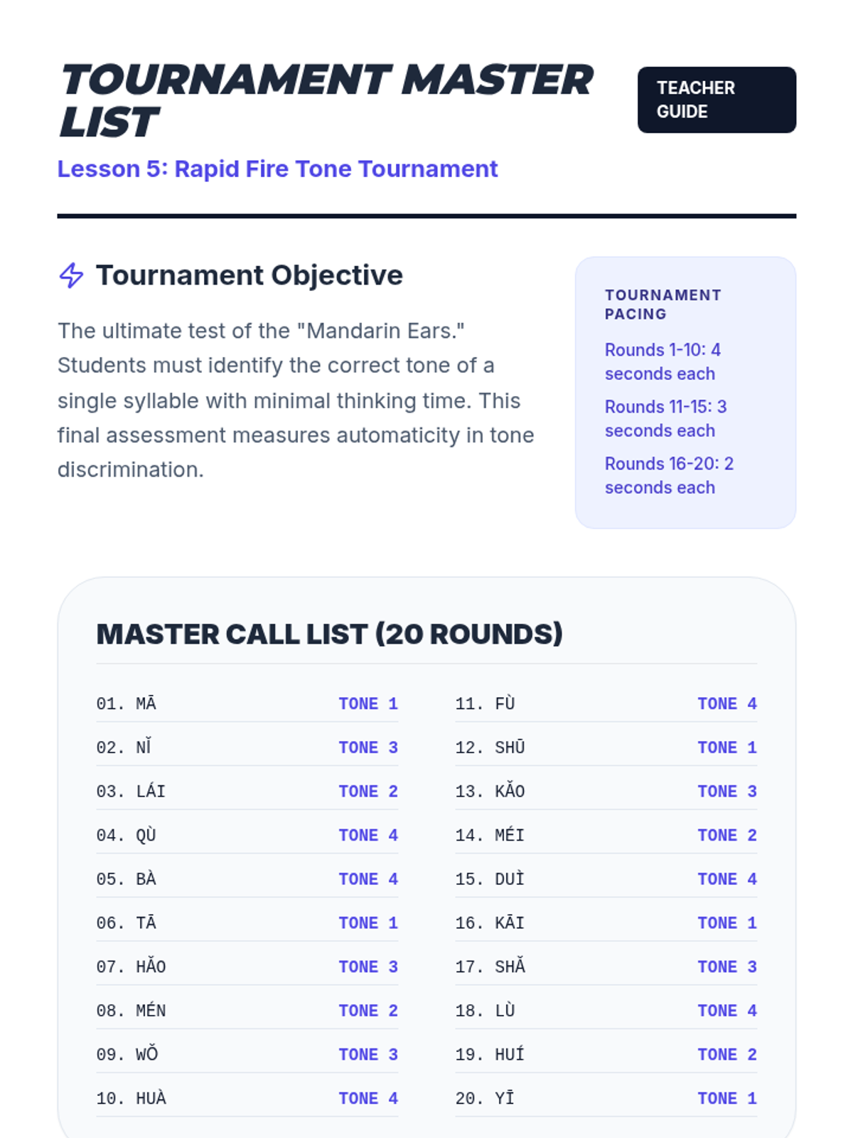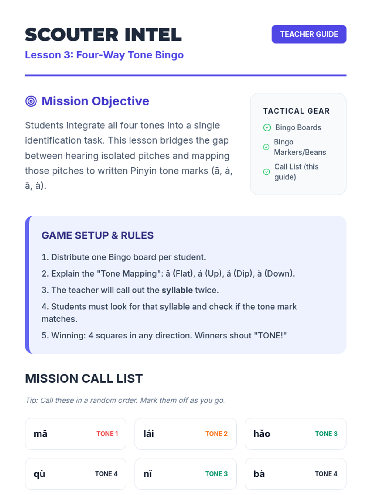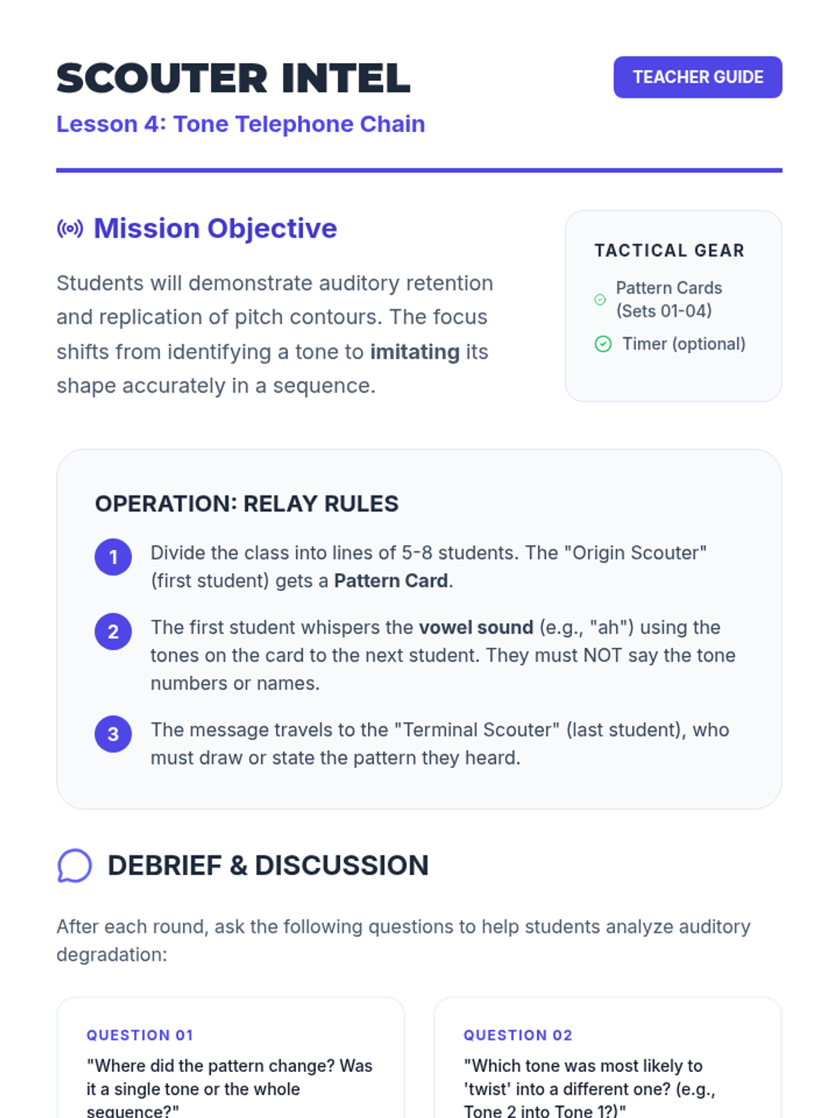 A comprehensive ear-training sequence for 6th-grade Mandarin beginners, focusing on auditory discrimination of the four Mandarin tones through games, simulations, and rapid-fire identification tasks.