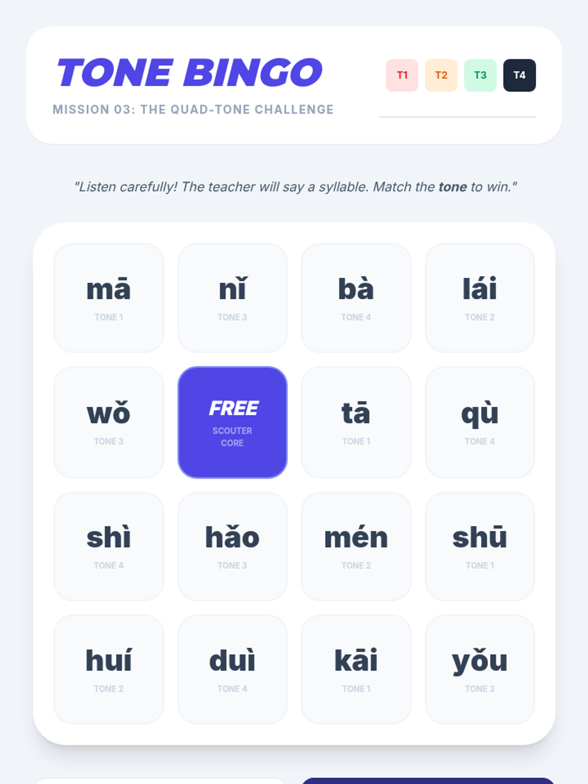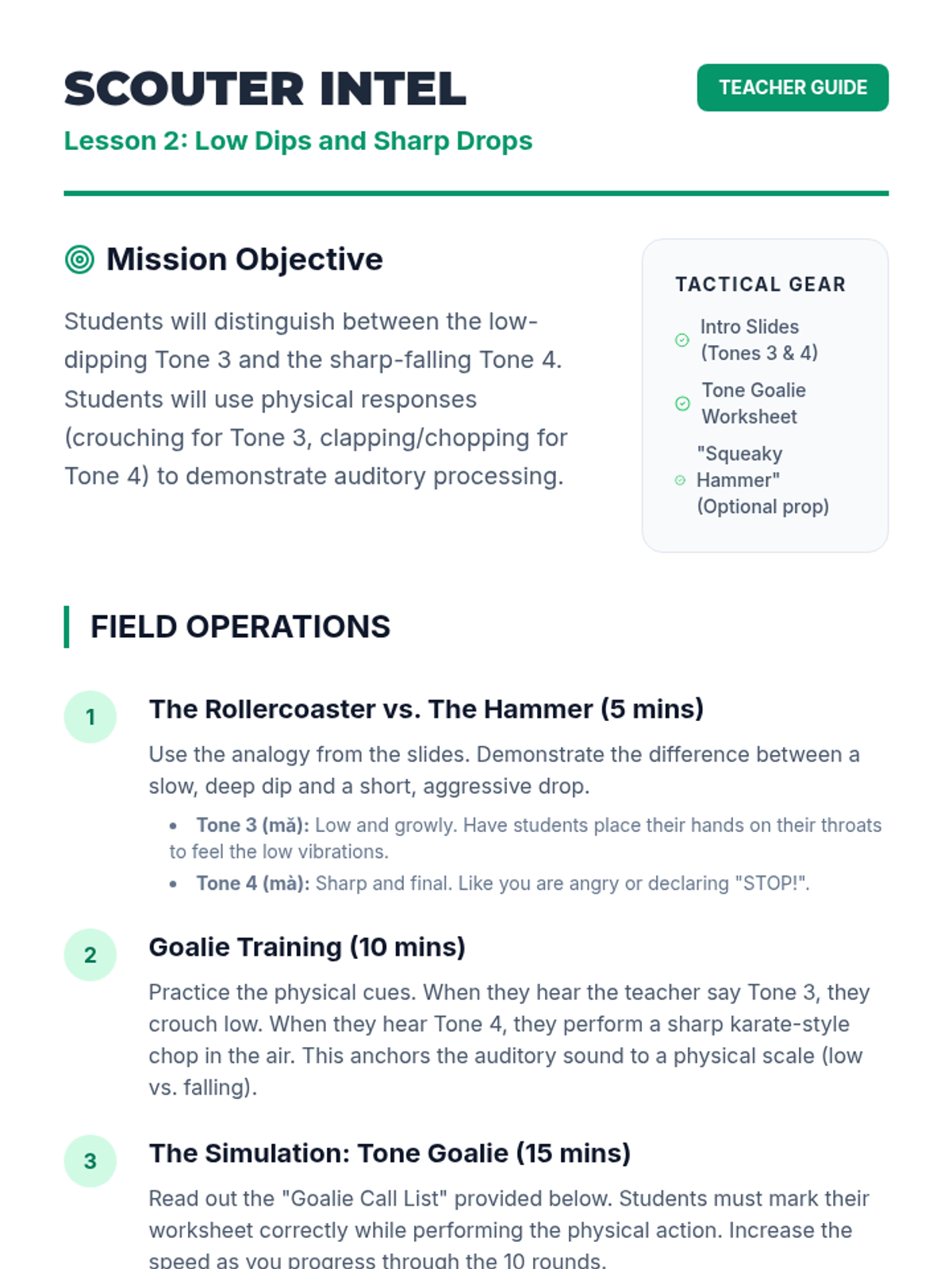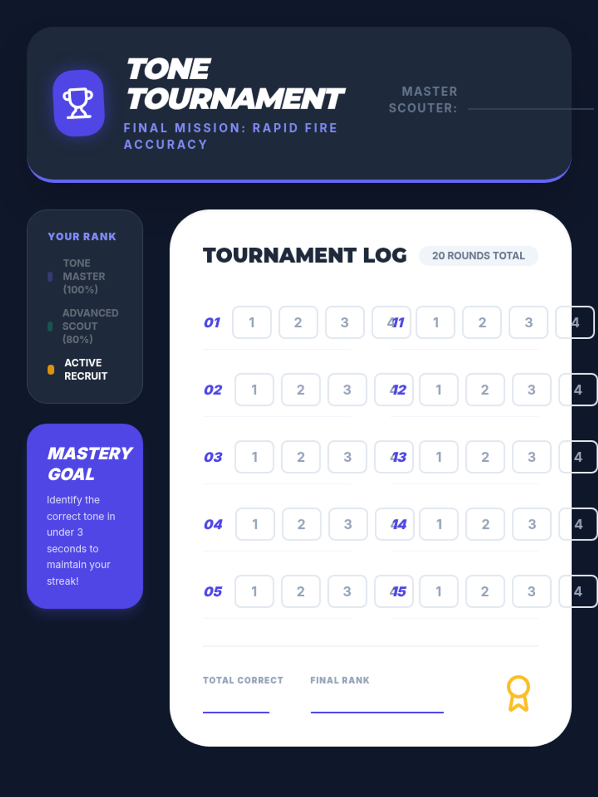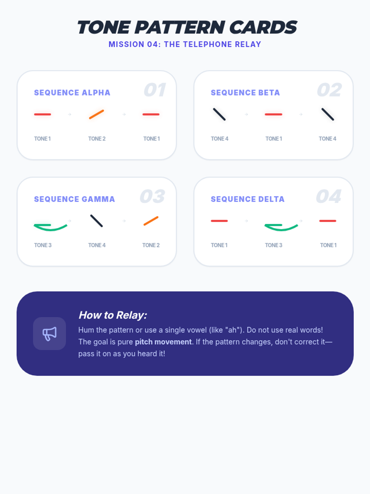 A comprehensive ear-training sequence for 6th-grade Mandarin beginners, focusing on auditory discrimination of the four Mandarin tones through games, simulations, and rapid-fire identification tasks.