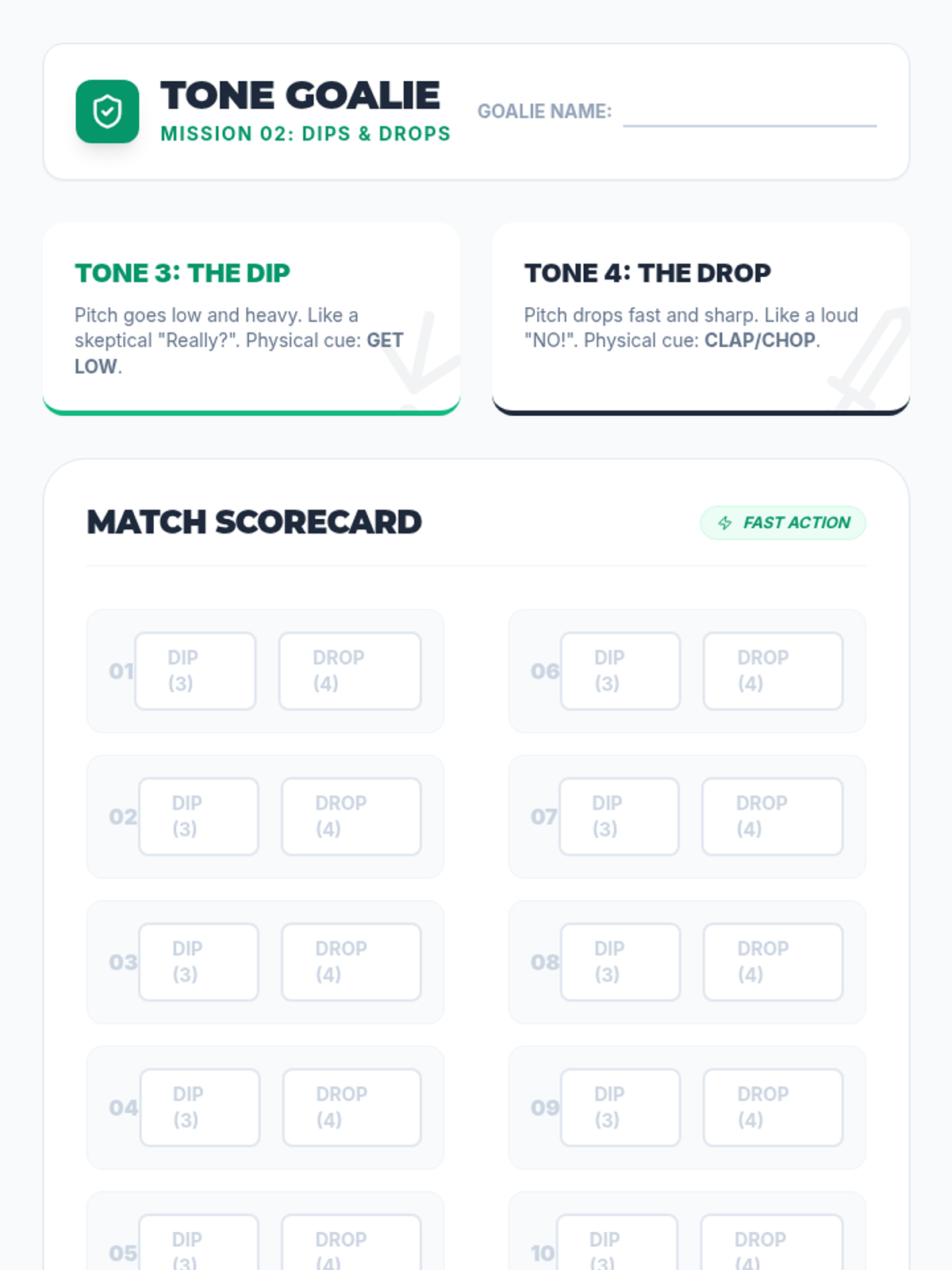 A foundational sequence for Pre-K learners to explore the four tones of Mandarin Chinese through auditory play, physical movement, and vocal exploration. Students learn to associate pitch changes with meaning using relatable sounds like questioning 'Huh?' or firm 'No!' gestures.