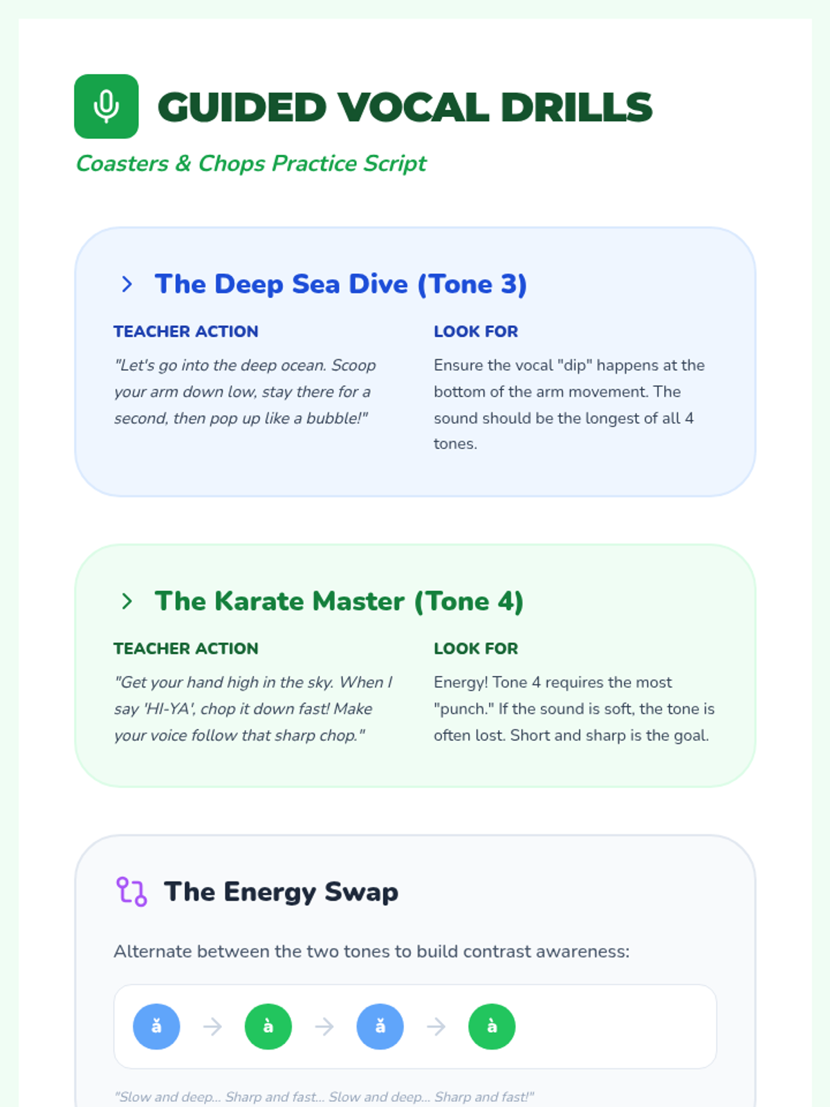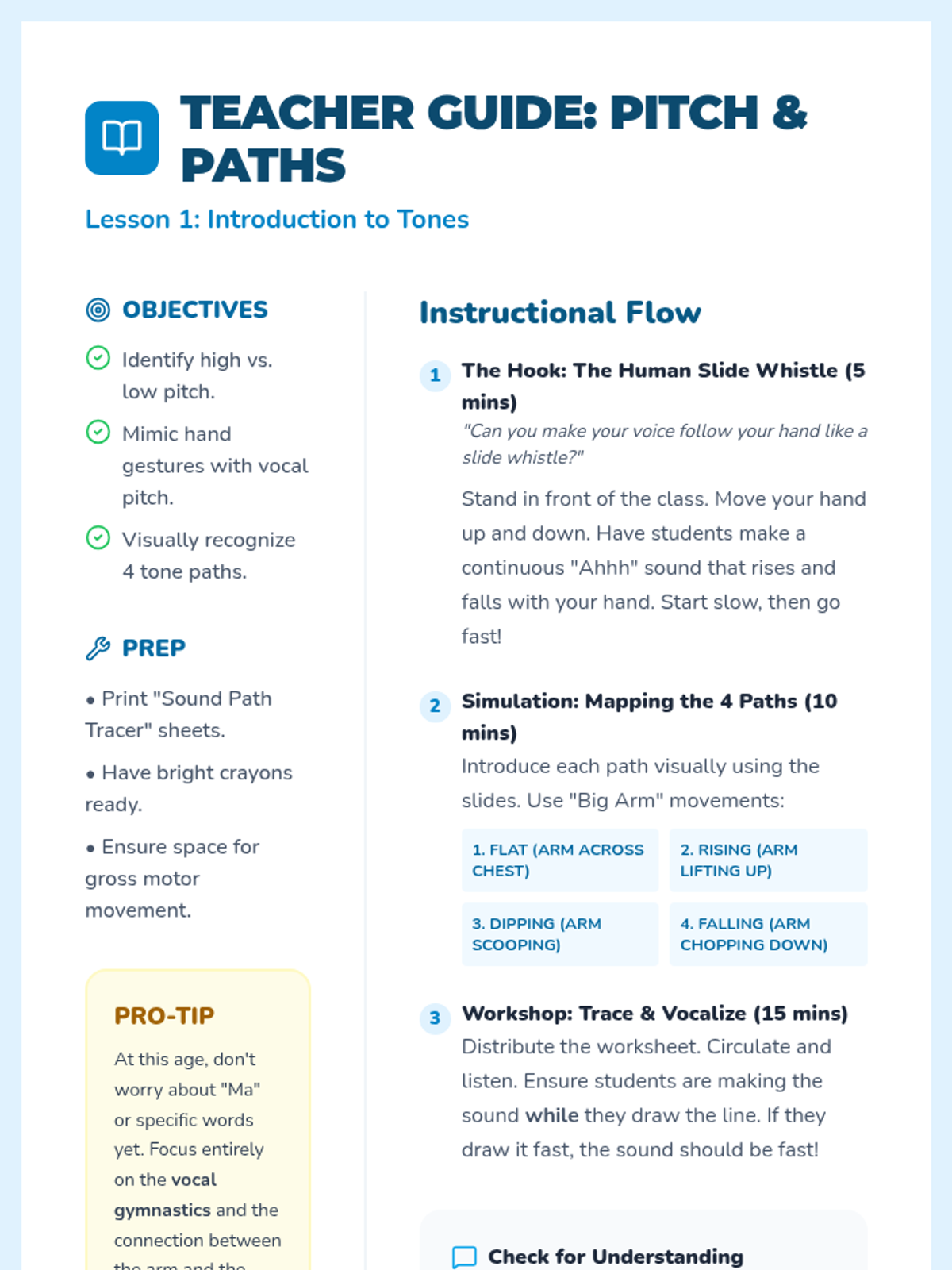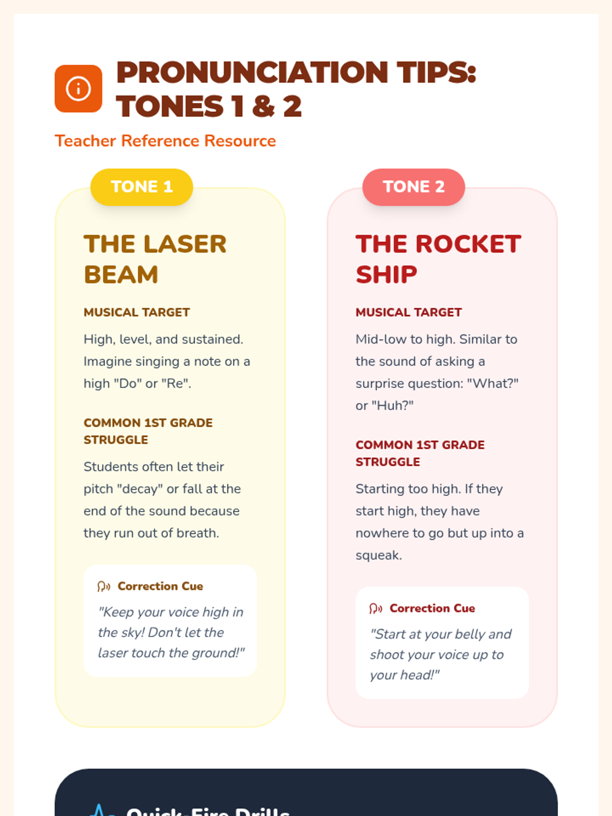 A 1st-grade sequence introducing Mandarin tones through Total Physical Response (TPR), mapping vocal pitch to gross motor movements like lasers, rockets, and karate chops.