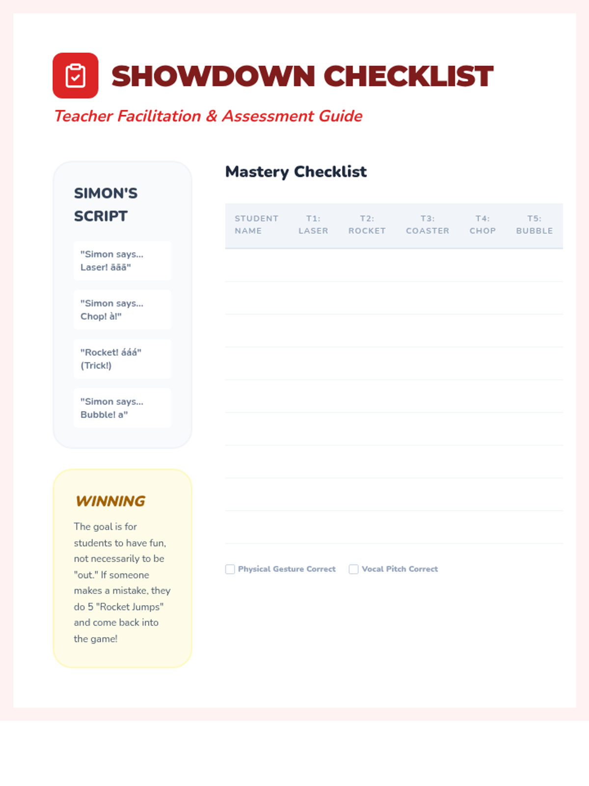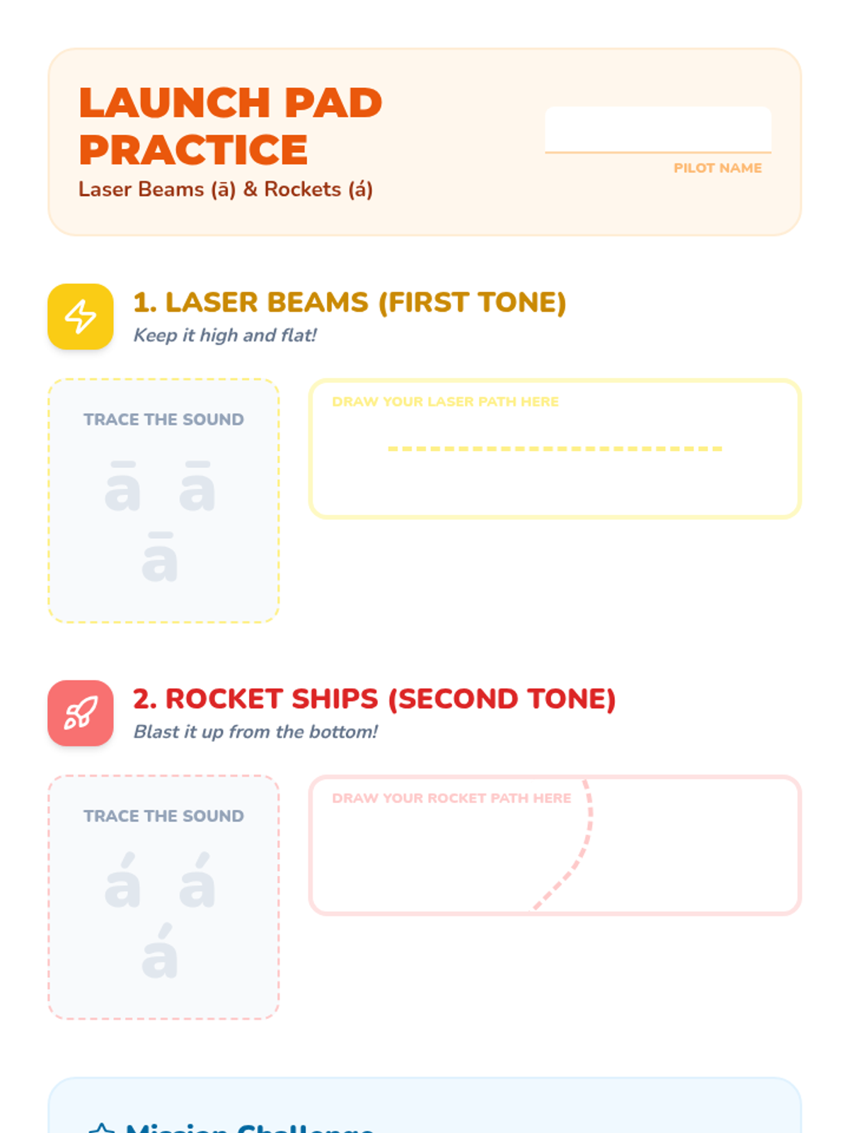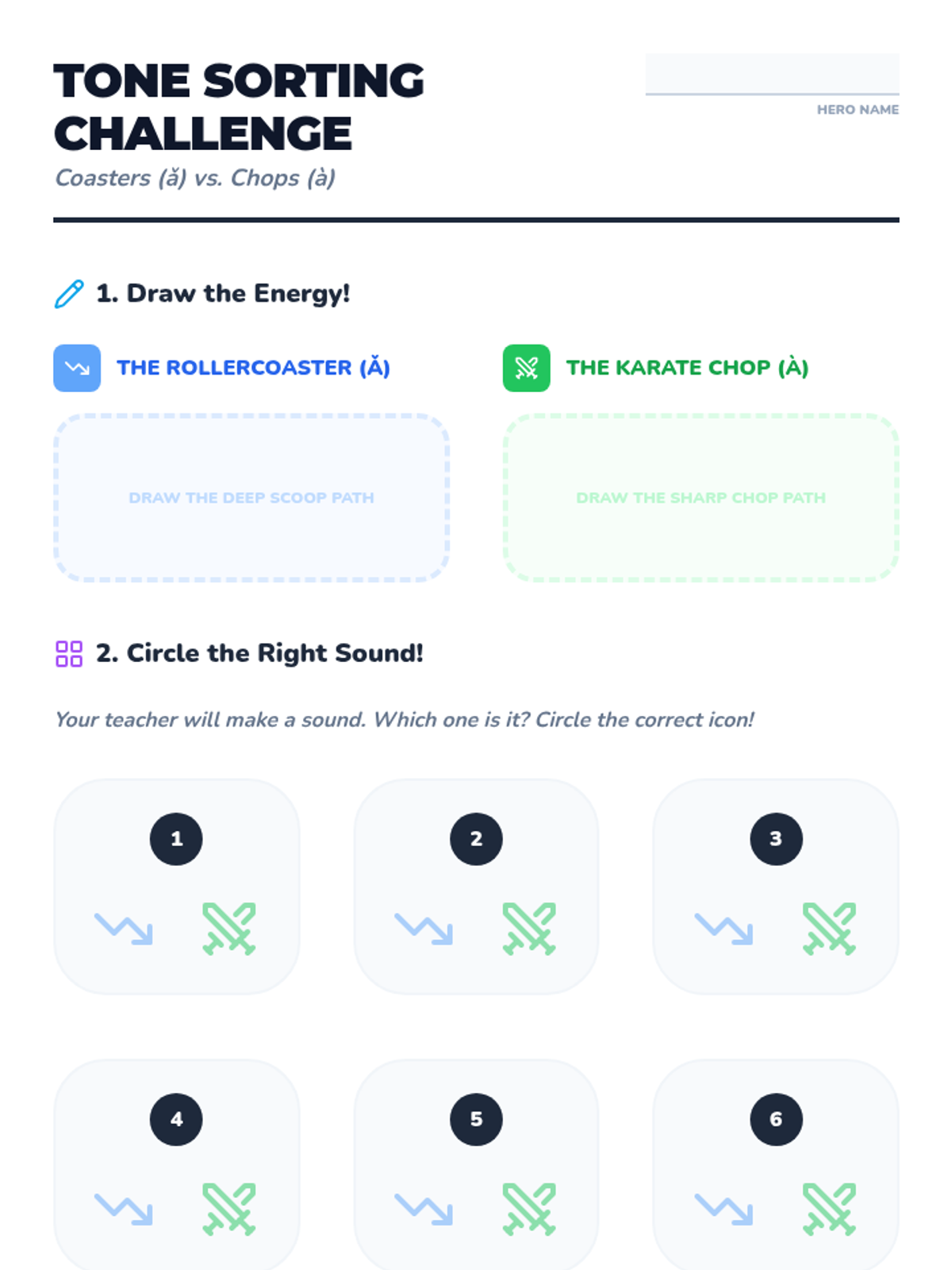 A 1st-grade sequence introducing Mandarin tones through Total Physical Response (TPR), mapping vocal pitch to gross motor movements like lasers, rockets, and karate chops.