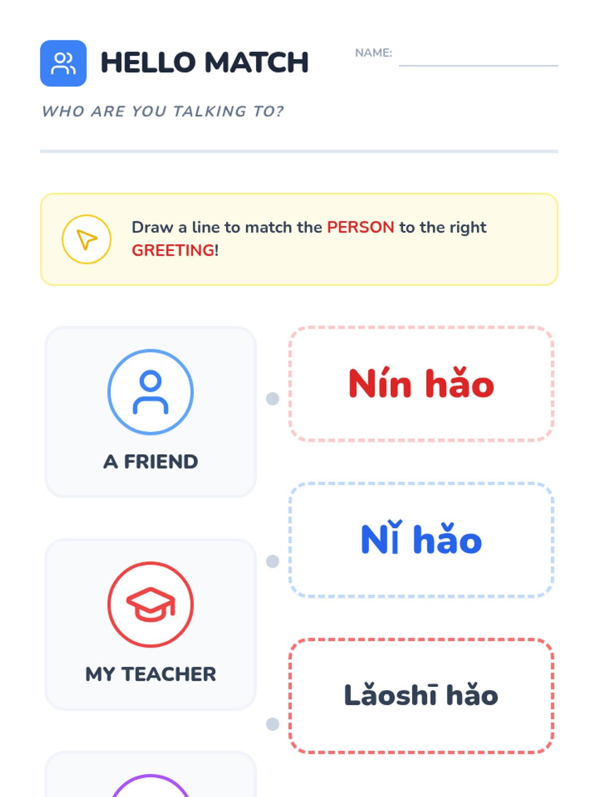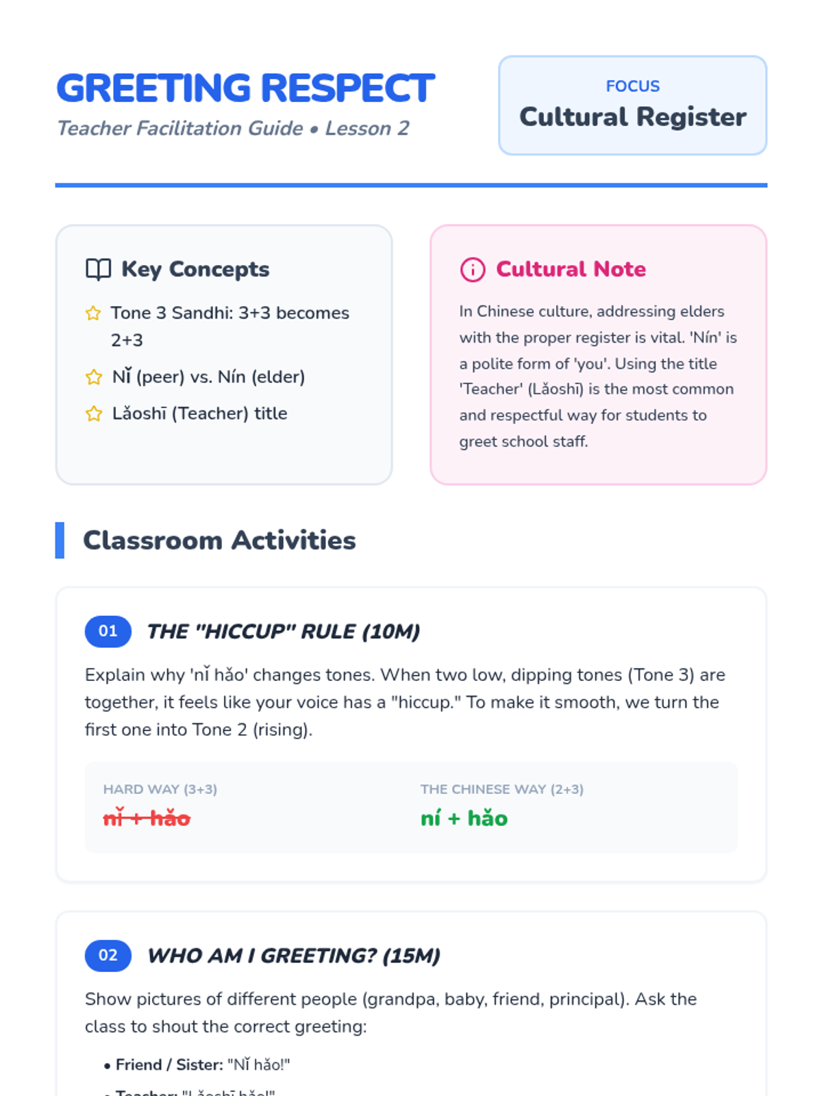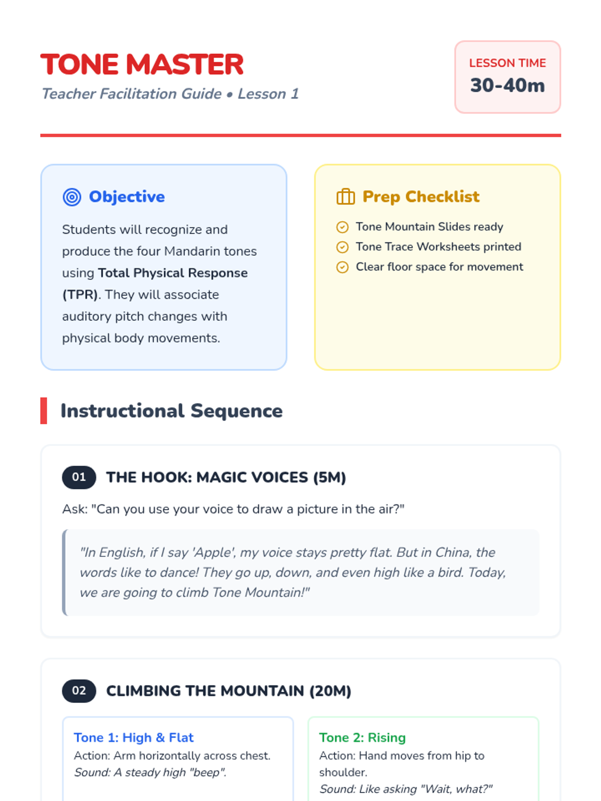 A foundational Mandarin Chinese sequence for 1st graders focusing on the four tones and basic greetings through physical movement, music, and role-play. Students transition from auditory recognition to active interpersonal communication.