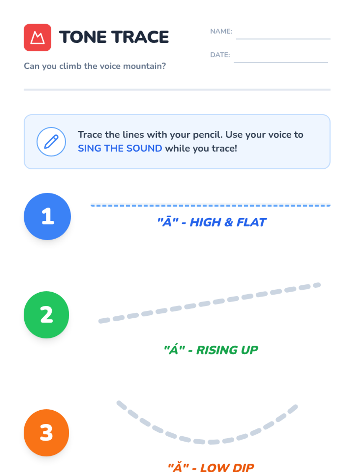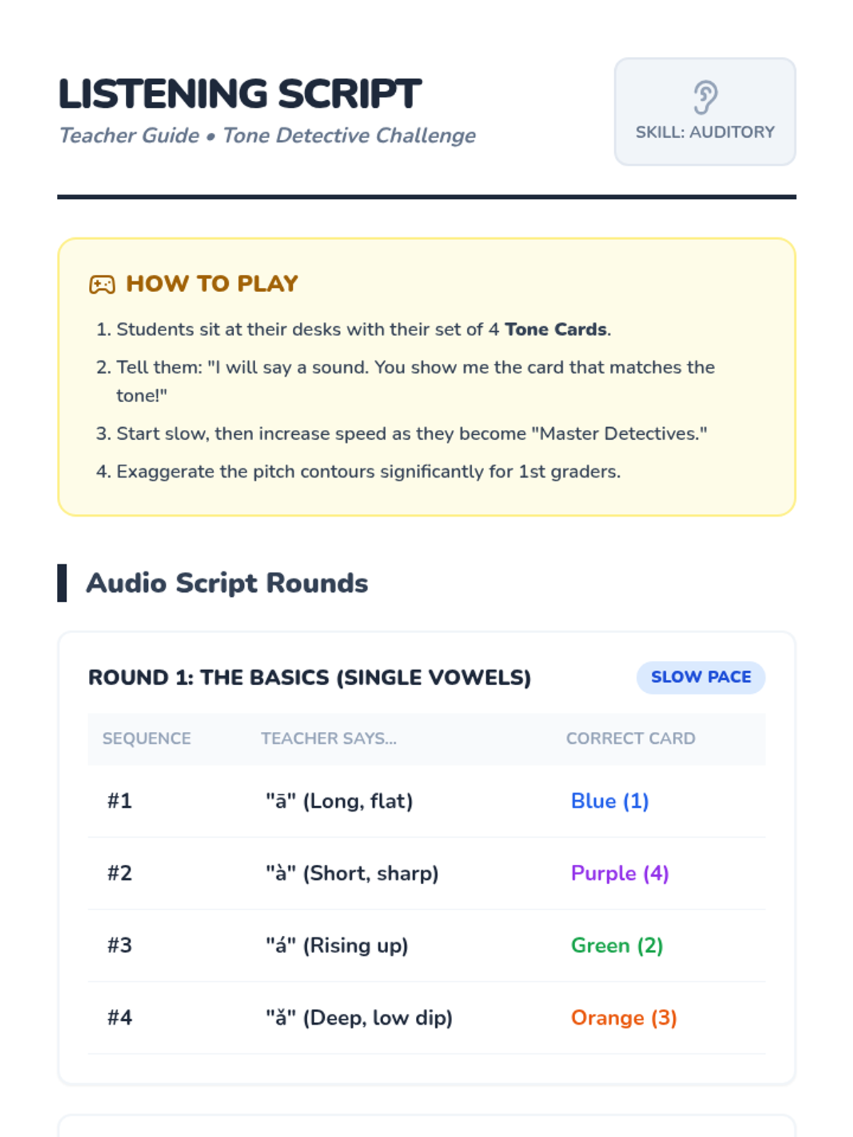 A foundational sequence for Pre-K learners to explore the four tones of Mandarin Chinese through auditory play, physical movement, and vocal exploration. Students learn to associate pitch changes with meaning using relatable sounds like questioning 'Huh?' or firm 'No!' gestures.