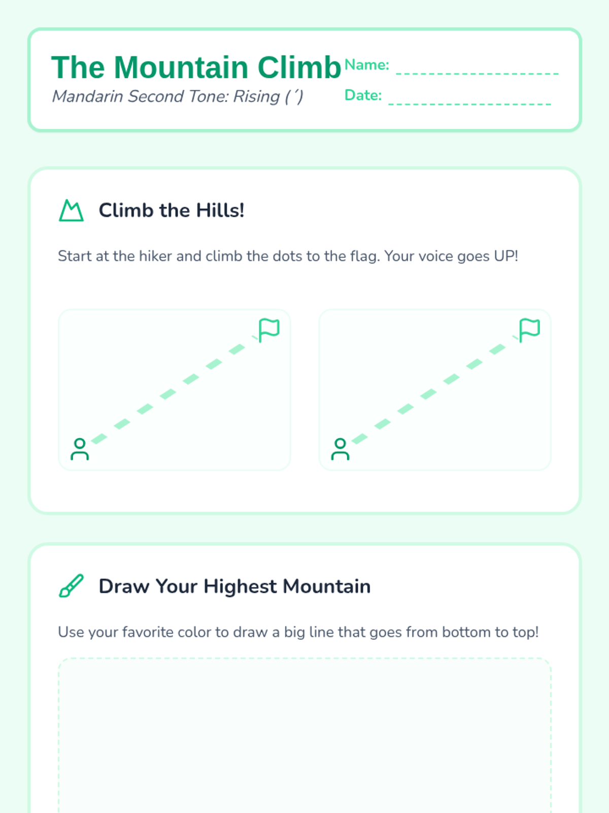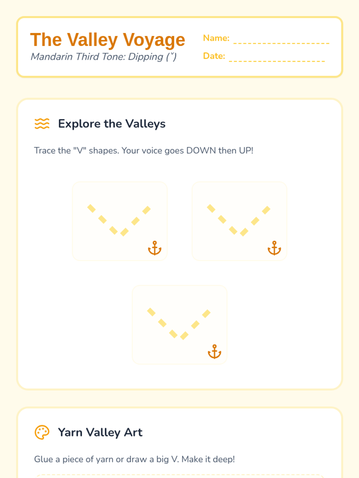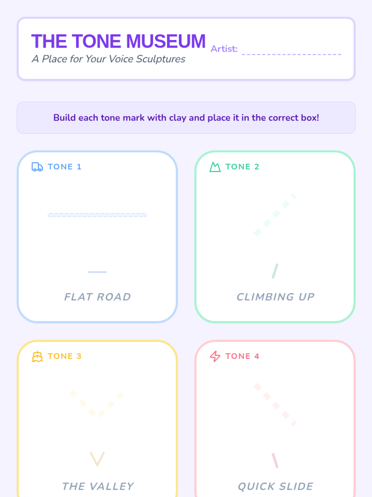This Pre-K sequence introduces Mandarin Chinese tones through visual pathways and tactile art. Students explore the four tones as 'roads' for their voices, using finger paints, yarn, and playdough to connect visual symbols with auditory pitch.