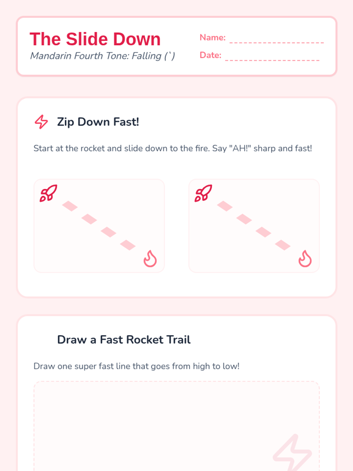 A foundational sequence for Pre-K learners to explore the four tones of Mandarin Chinese through auditory play, physical movement, and vocal exploration. Students learn to associate pitch changes with meaning using relatable sounds like questioning 'Huh?' or firm 'No!' gestures.