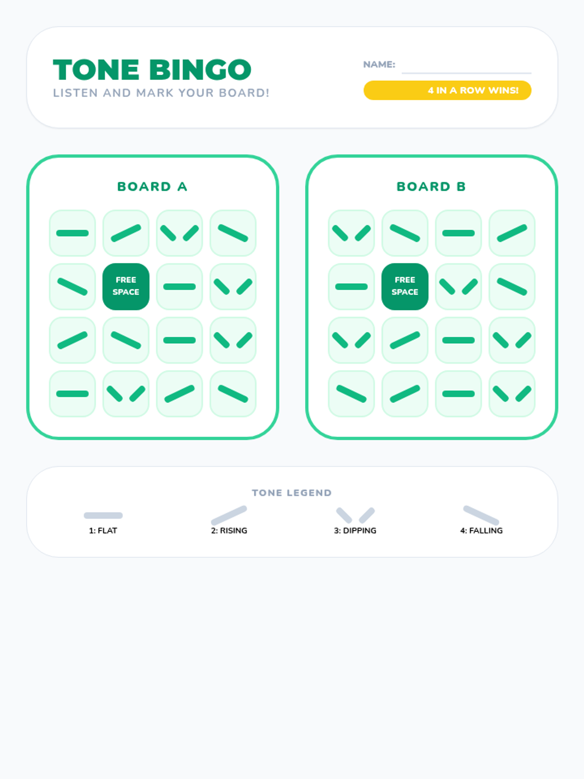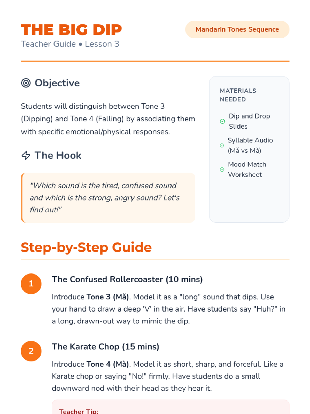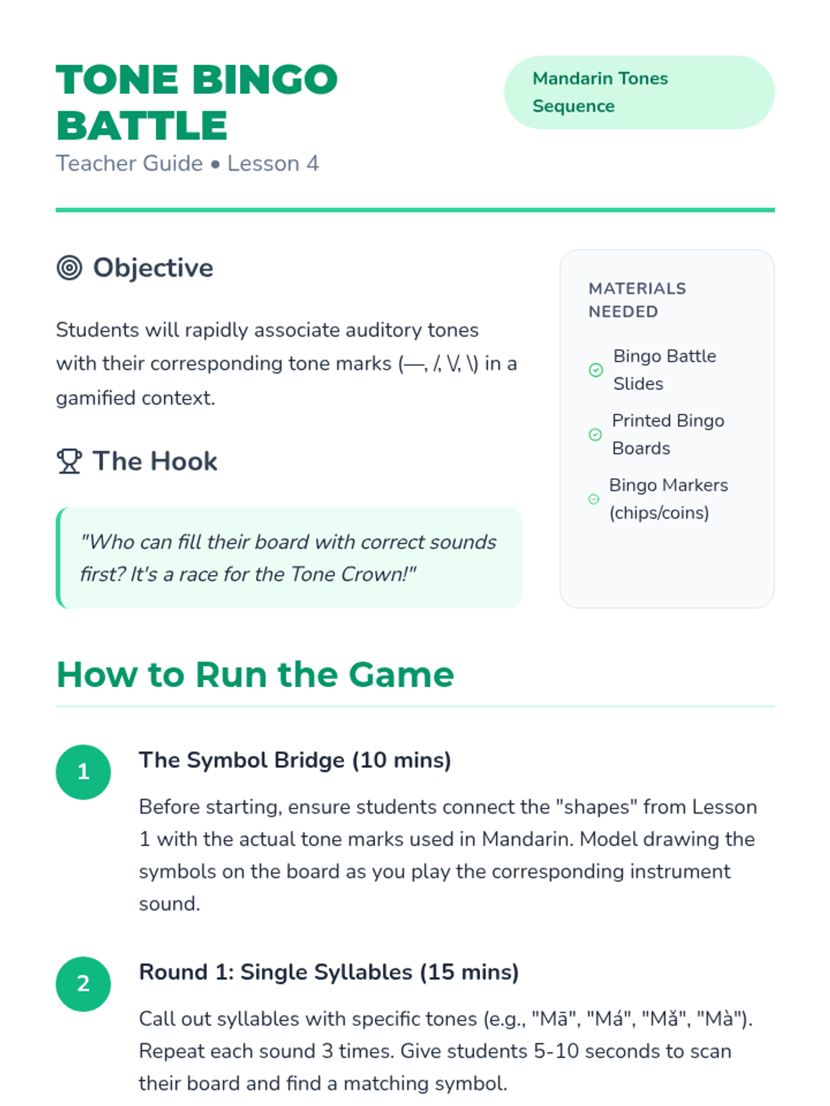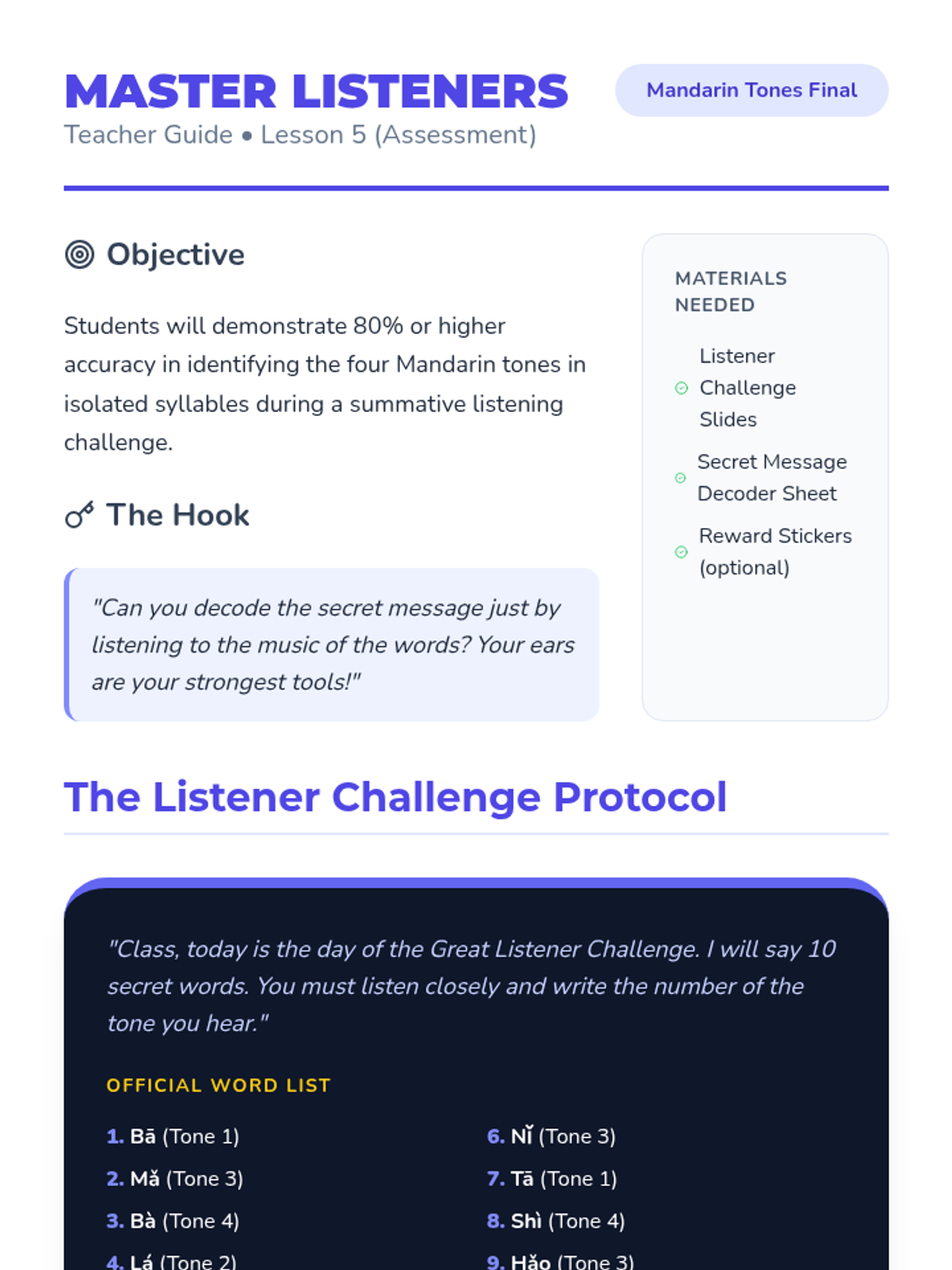 A 1st-grade sequence focused on developing auditory discrimination for the four Mandarin Chinese tones. Students move from identifying pitch contours in music to recognizing them in spoken syllables through games, sorting activities, and listening challenges.