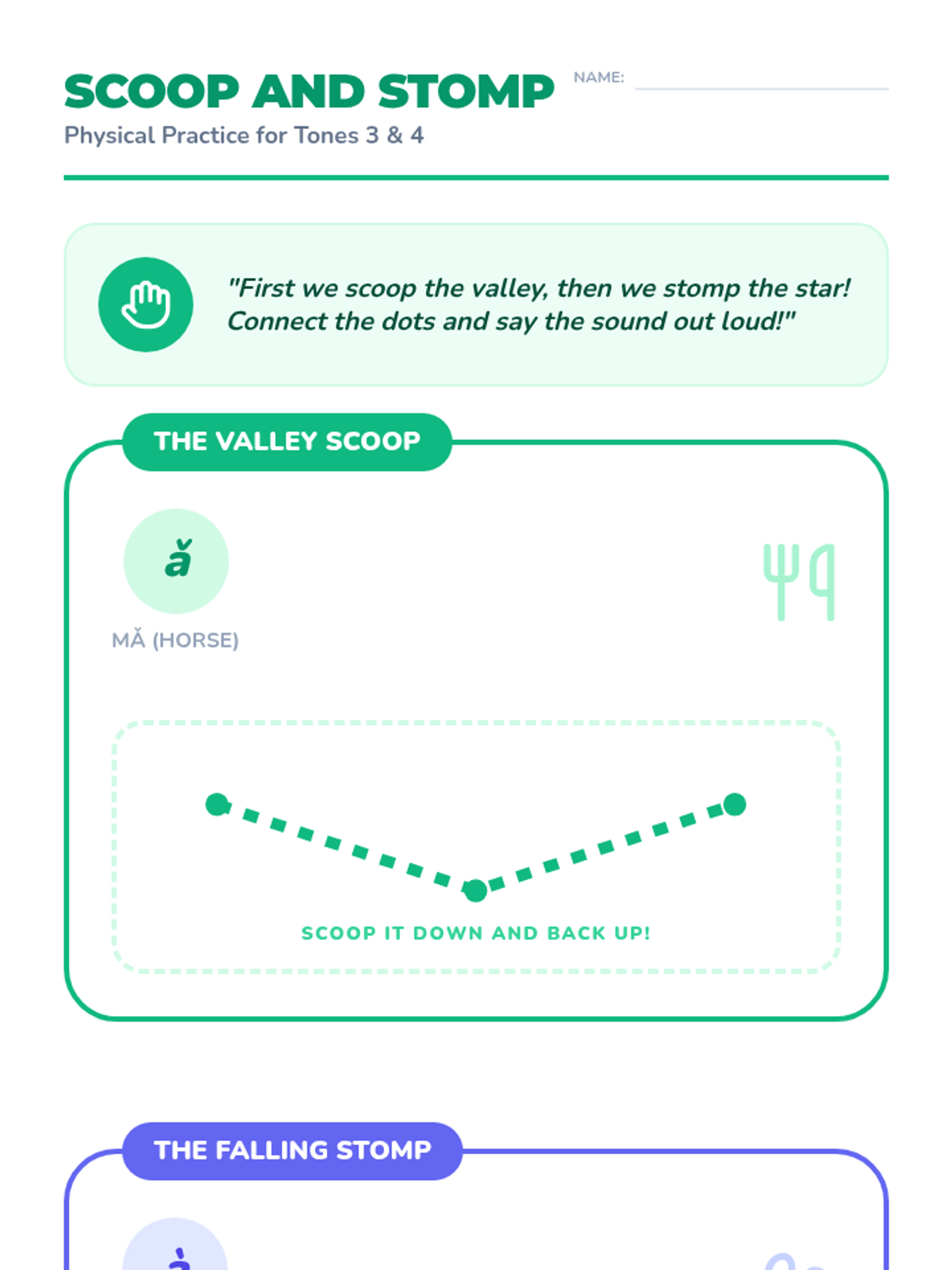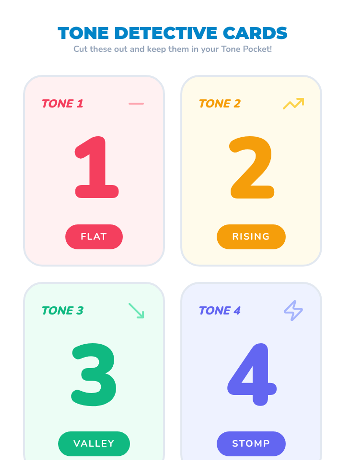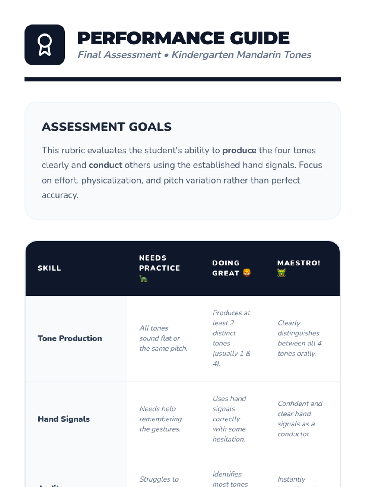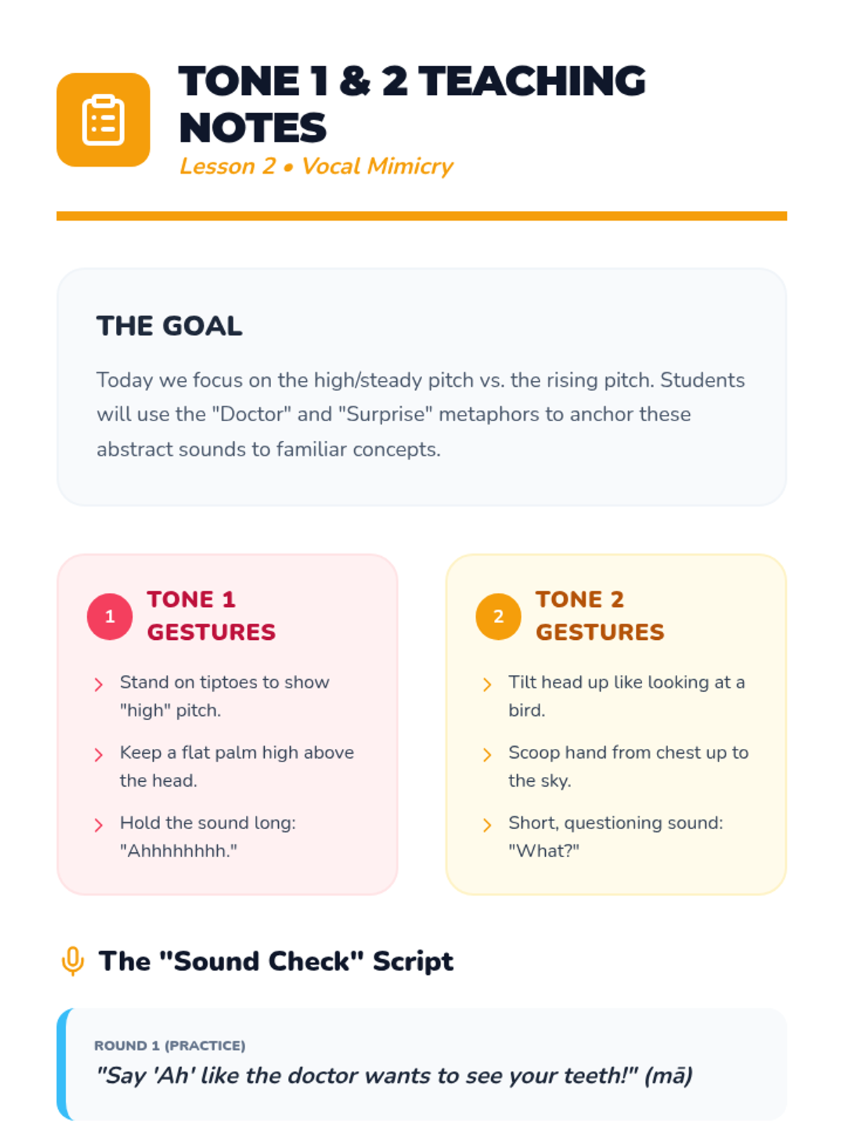 A physical and auditory introduction to the four Mandarin tones for Pre-K learners, using movement, animal analogies, and games to make pitch concrete.