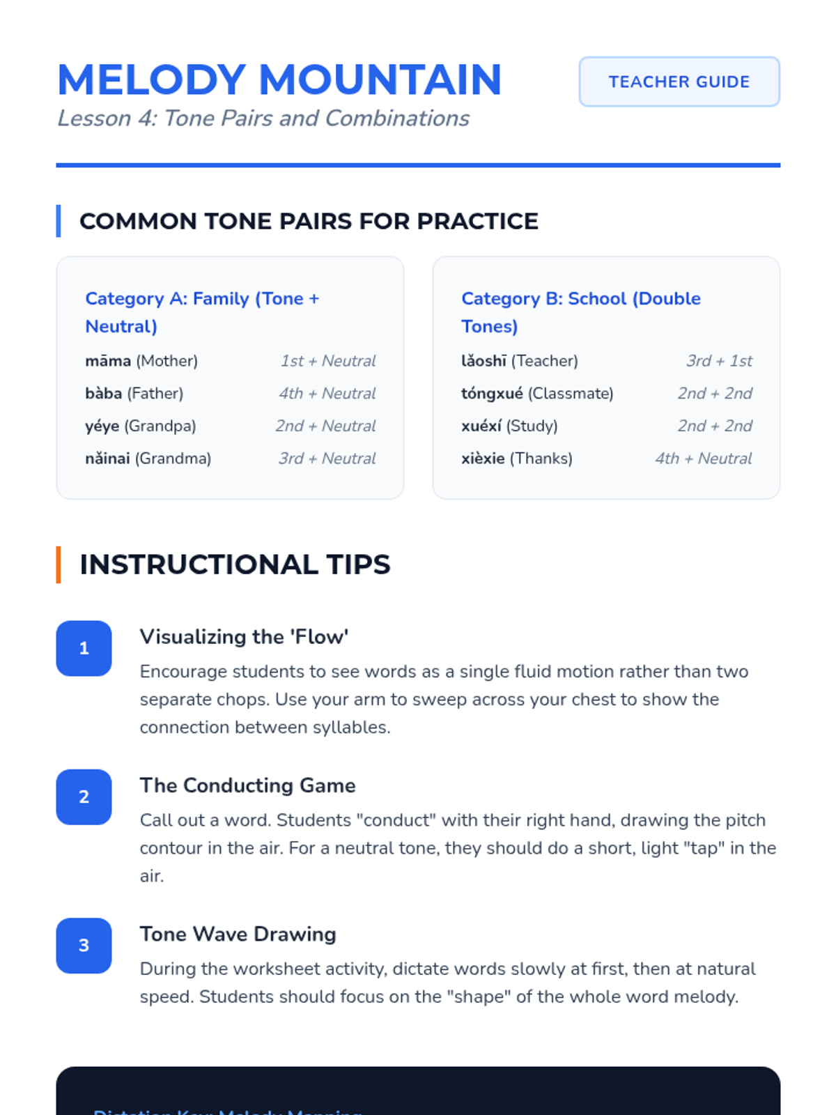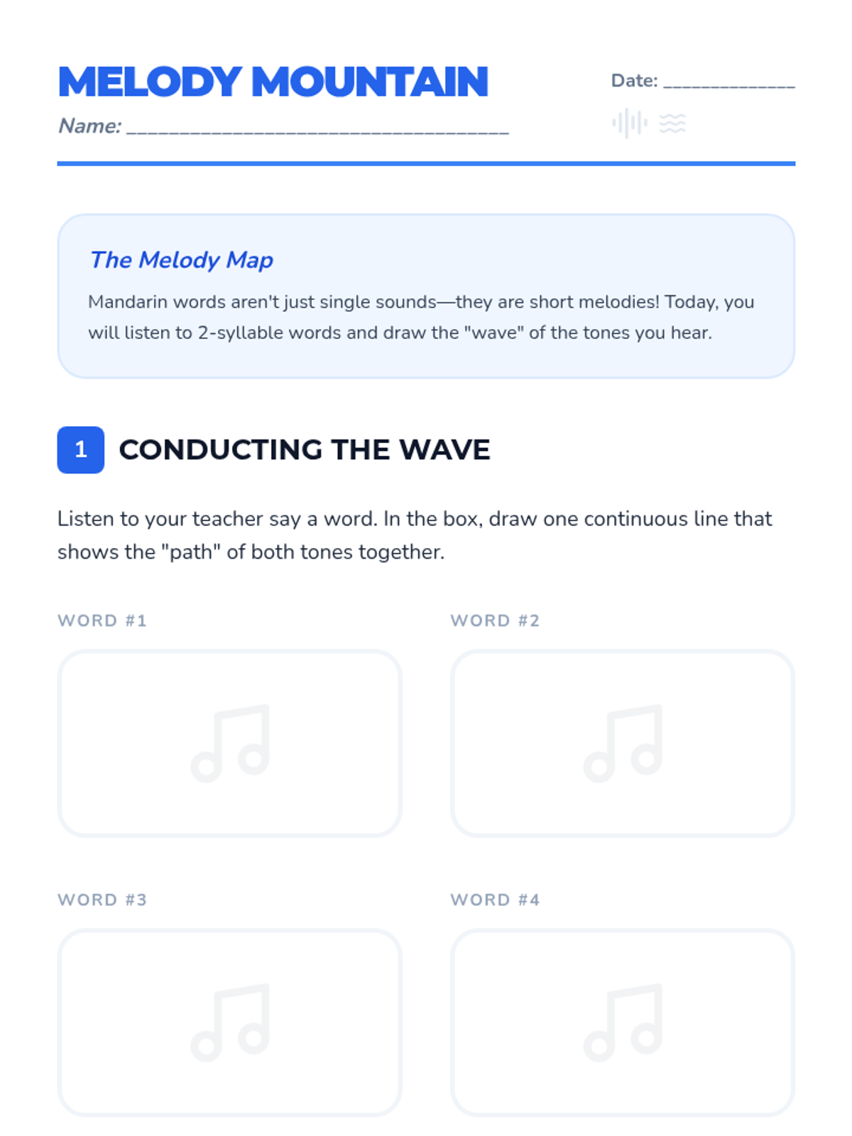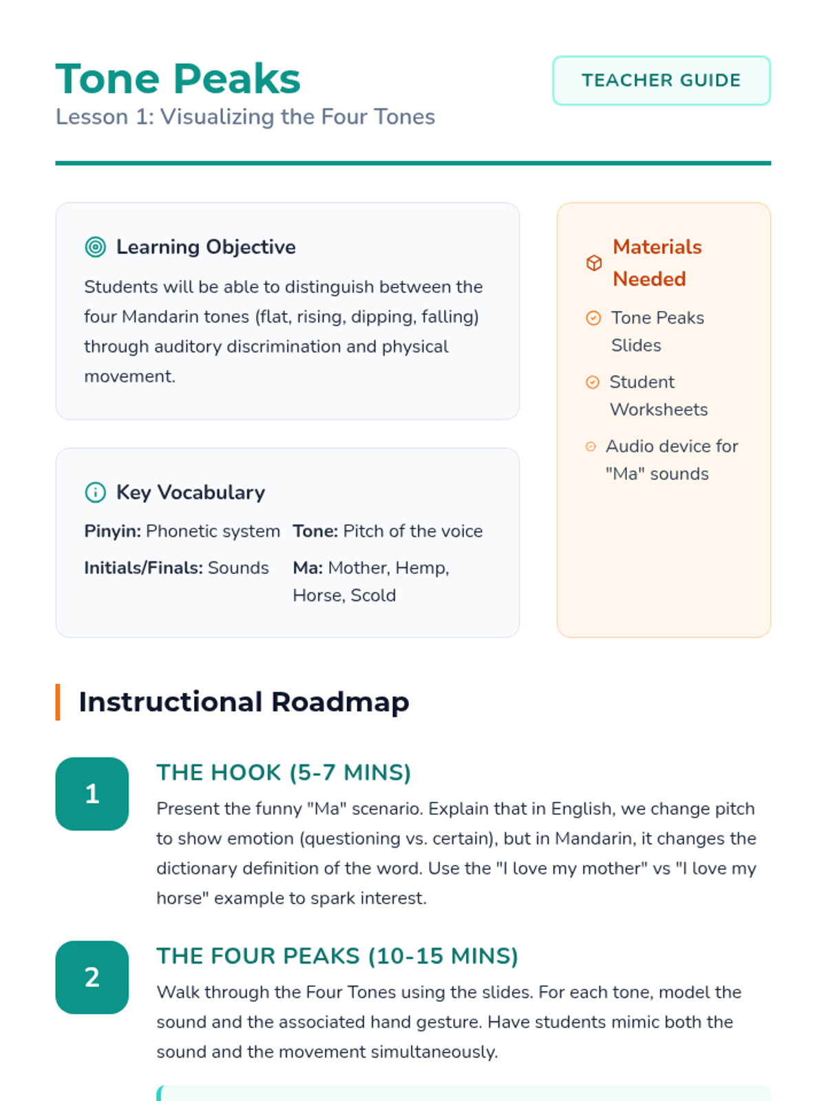 A foundational sequence for 4th graders to master Mandarin Chinese tones and Pinyin phonetics through auditory discrimination, visualization, and transcription. Students explore the 'melody' of the language to understand how pitch changes meaning.