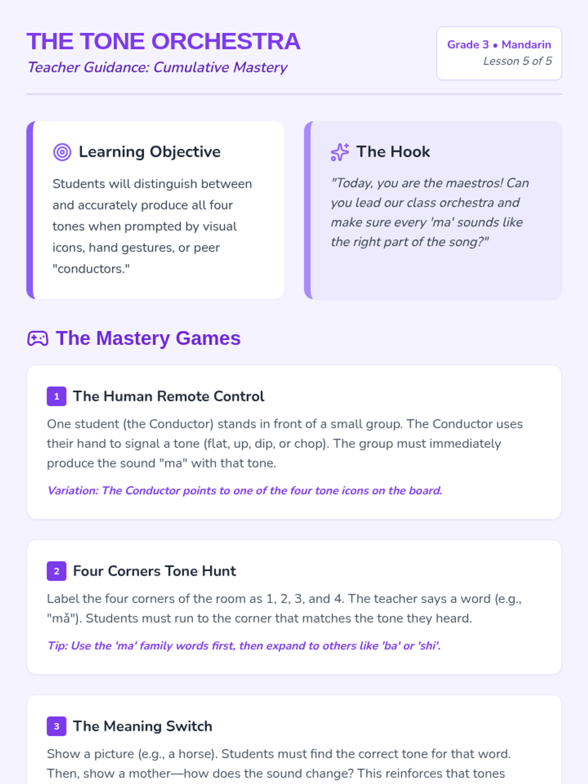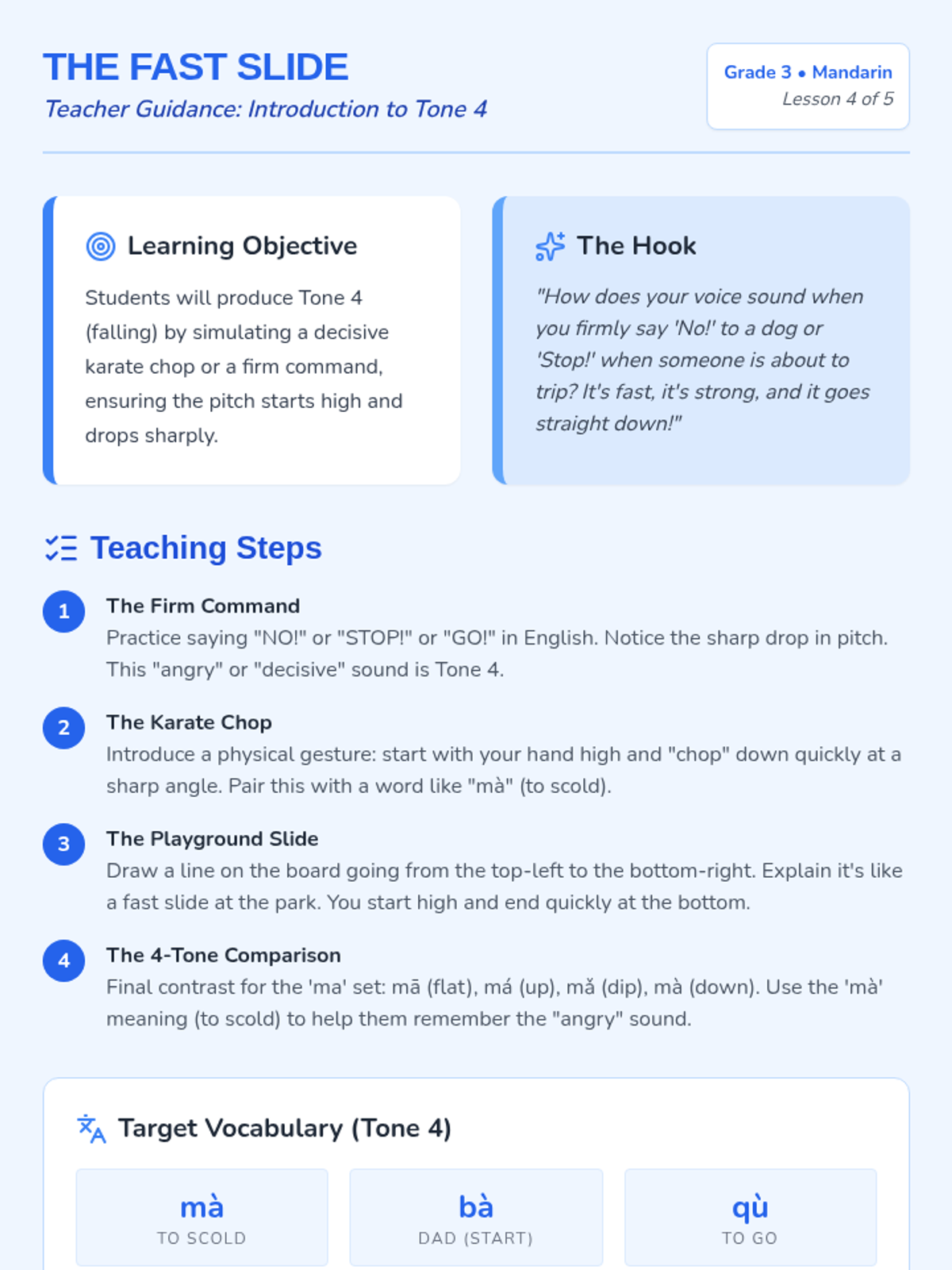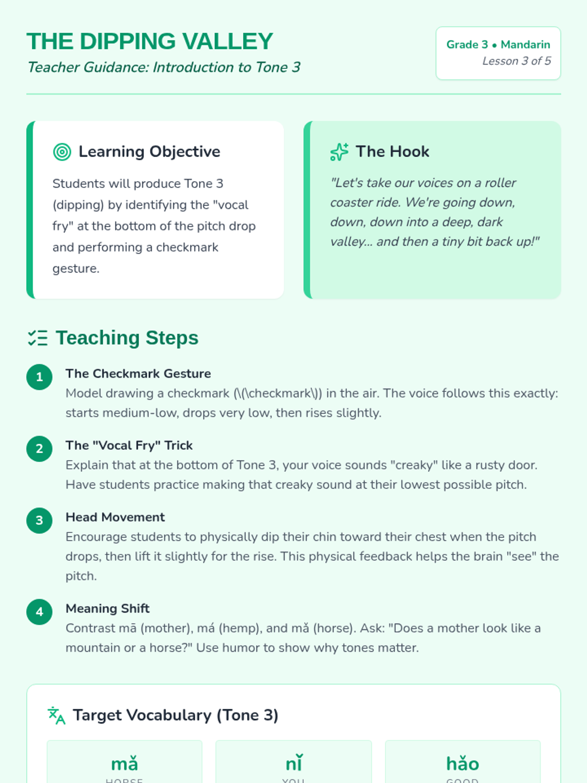 A kinetic and musical introduction to the four Mandarin tones for 3rd graders, using physical movement and pitch visualization to build foundational speaking and listening skills.