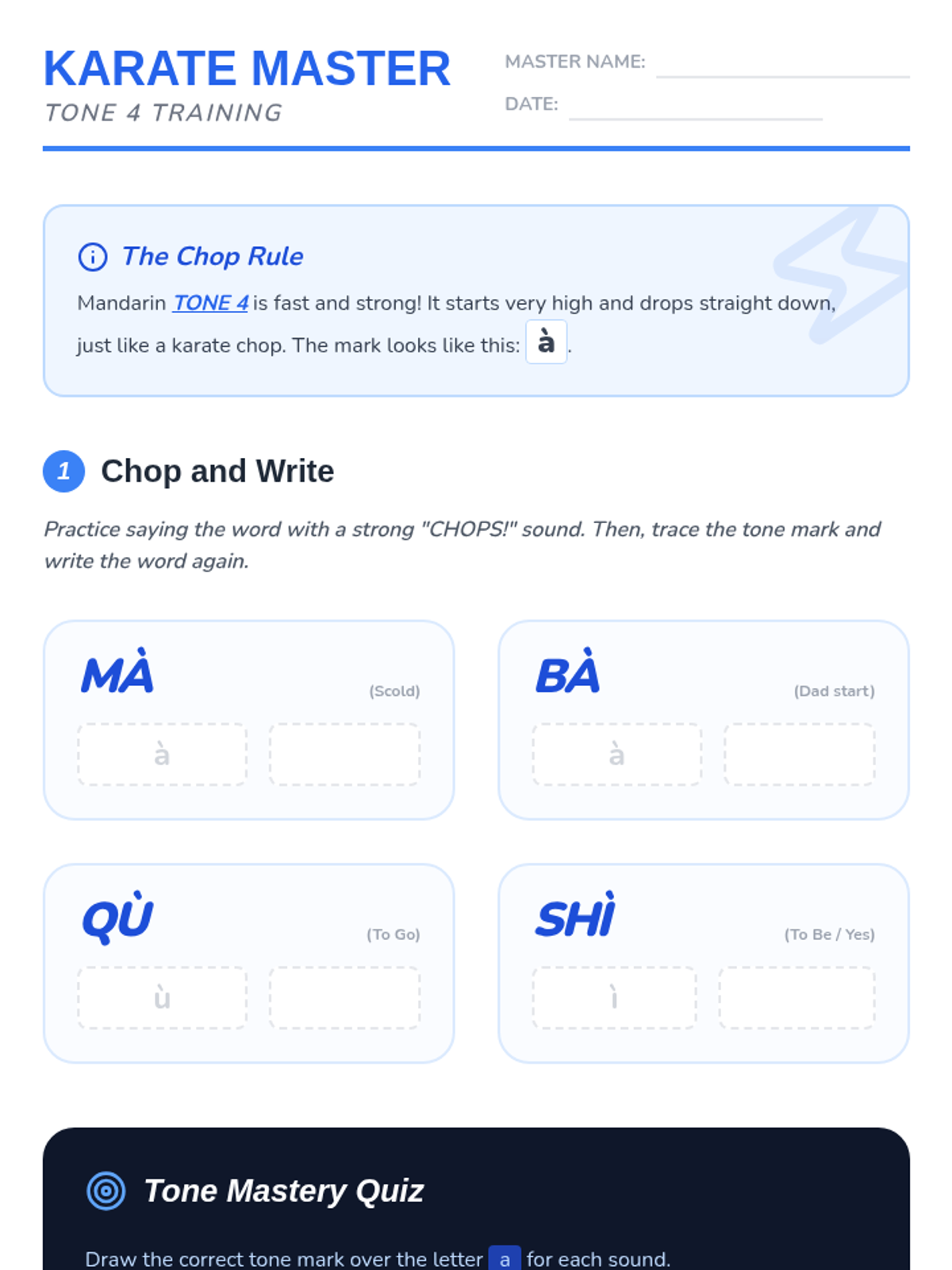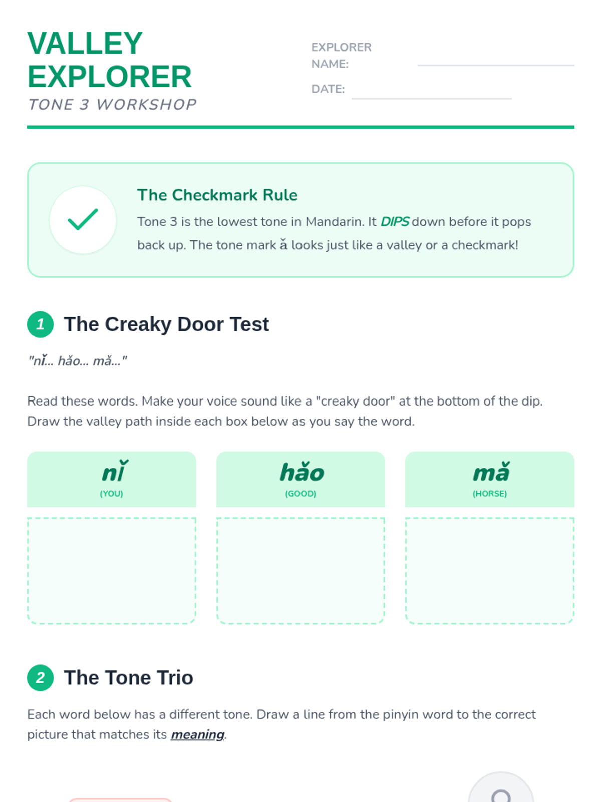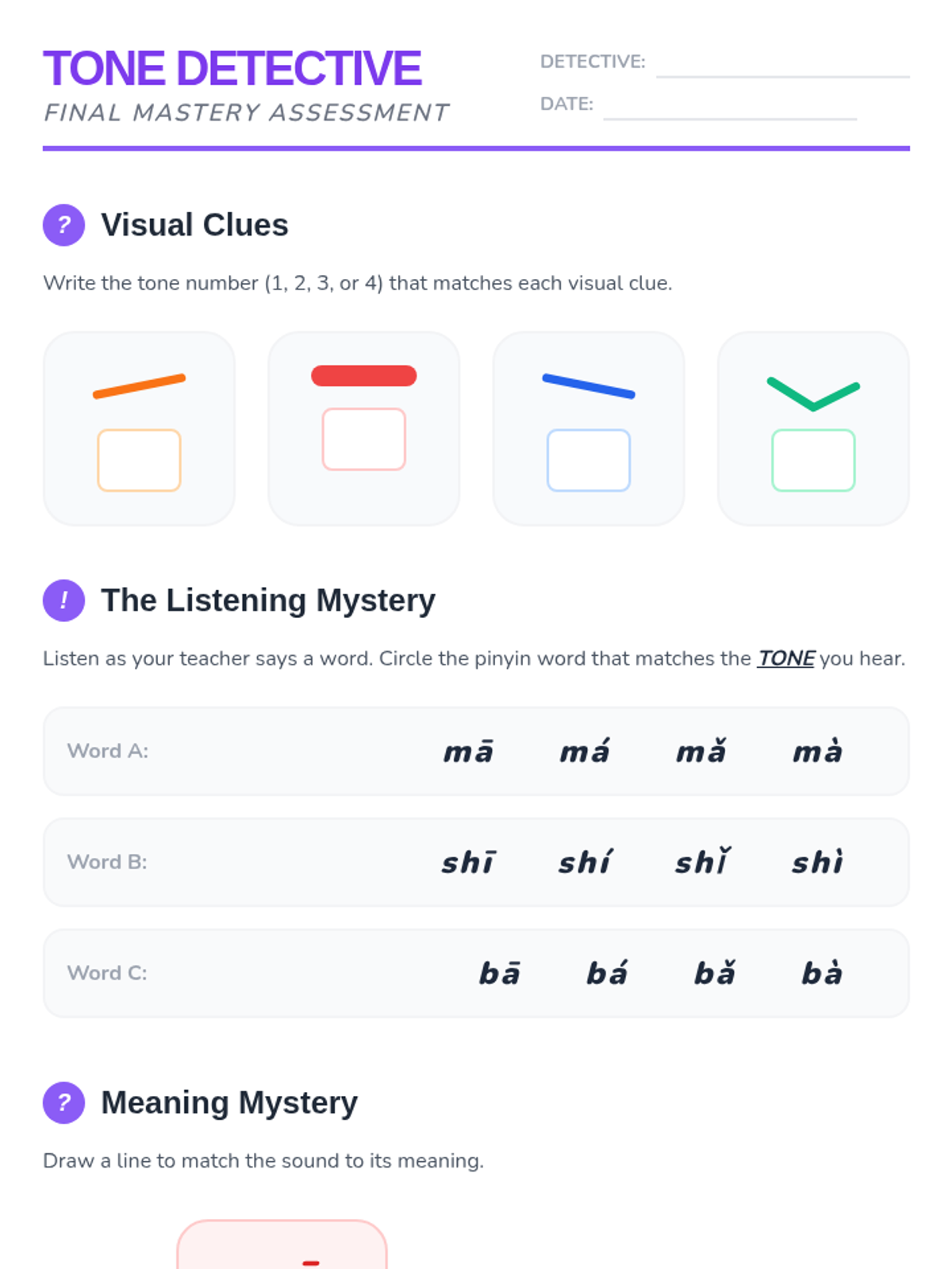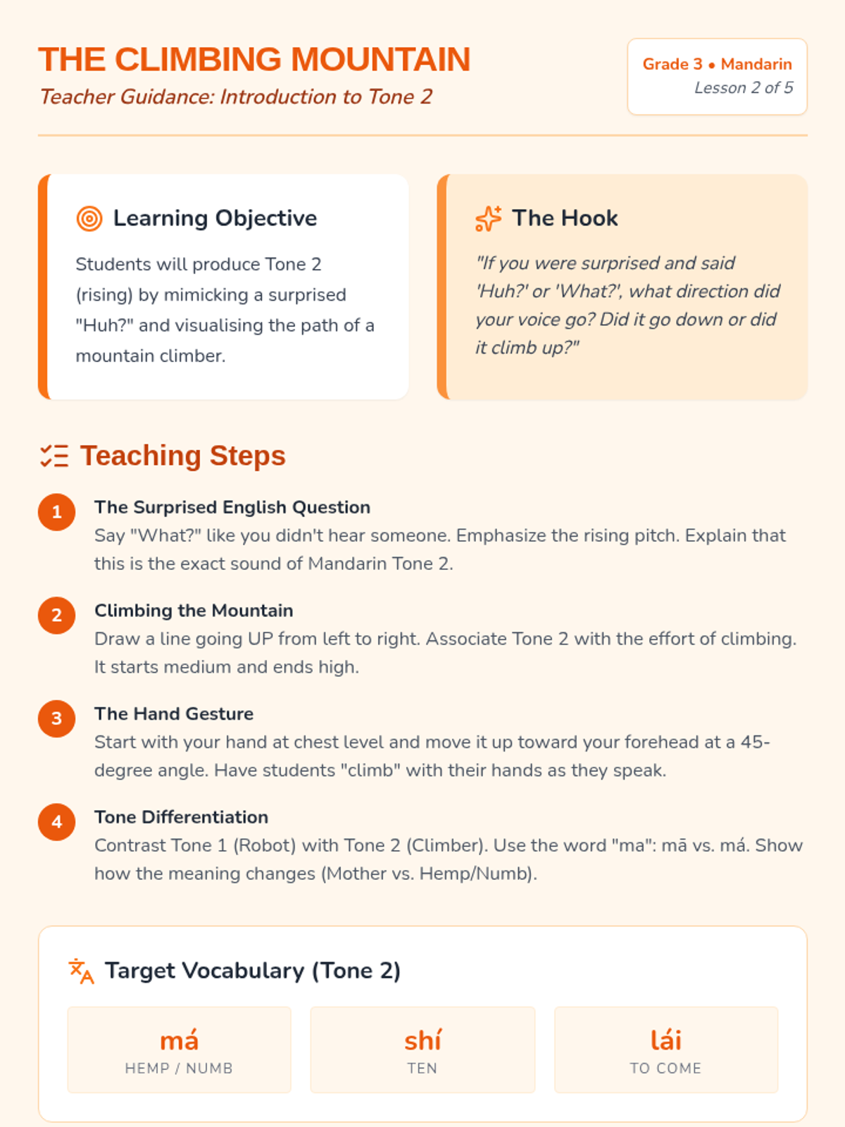 A kinetic and musical introduction to the four Mandarin tones for 3rd graders, using physical movement and pitch visualization to build foundational speaking and listening skills.