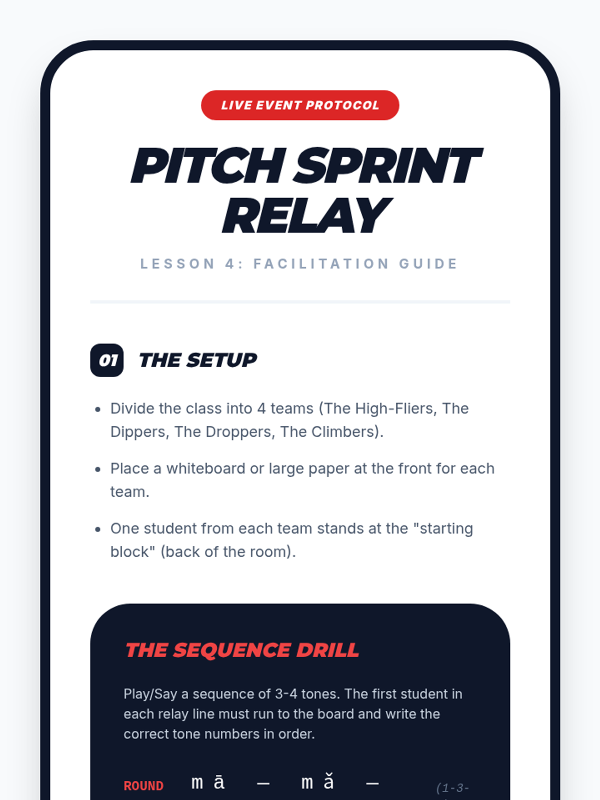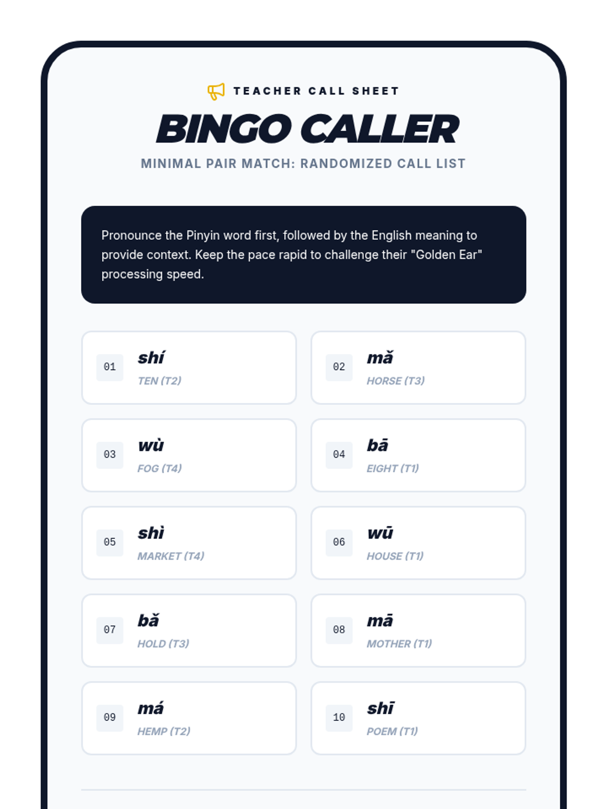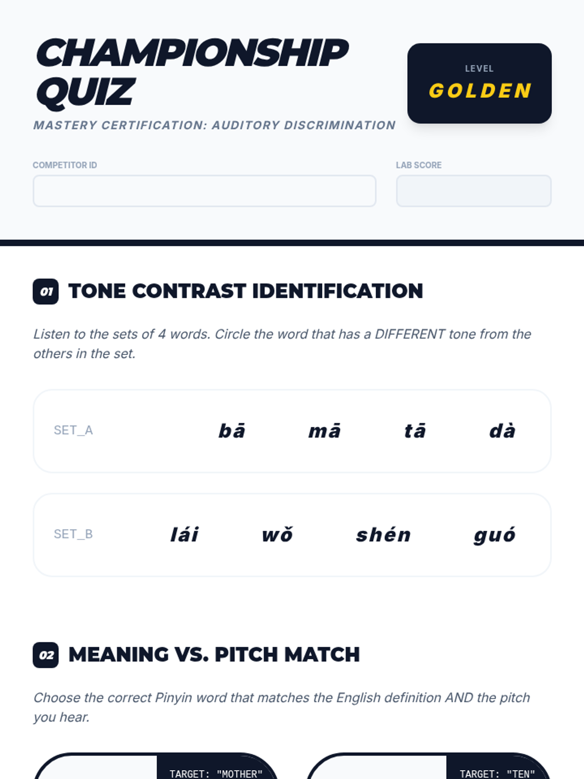 A gamified sequence for 9th-grade Mandarin beginners focused on auditory discrimination of the four Chinese tones. Students progress from basic contrasts to complex minimal pairs and sequential processing through competitive drills and ear training.