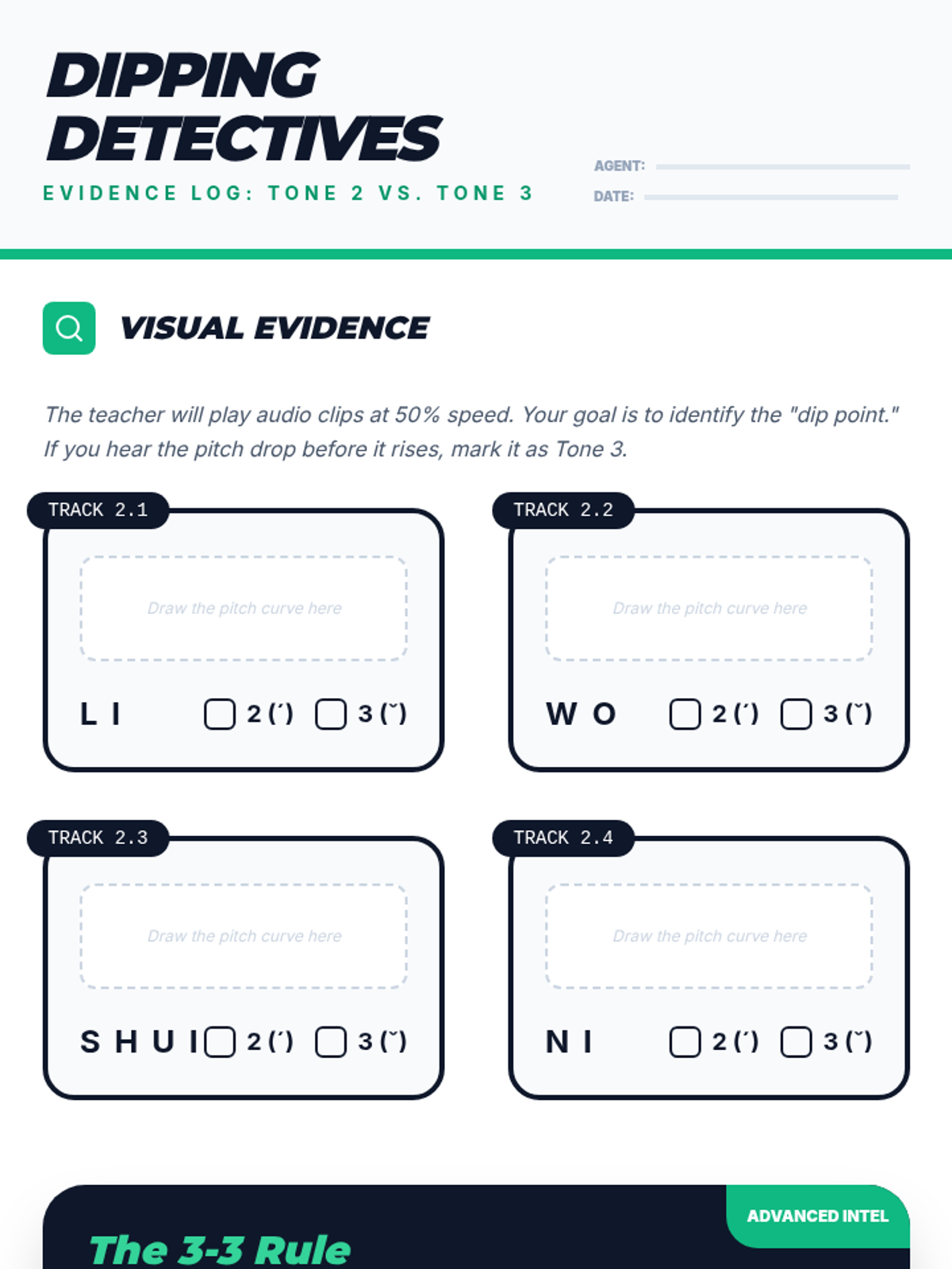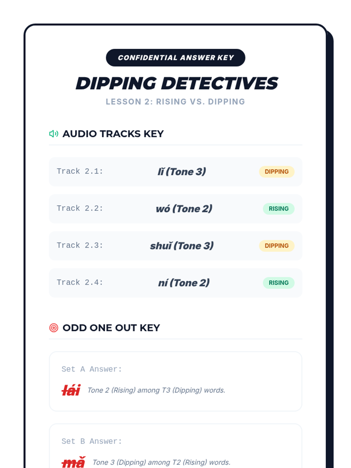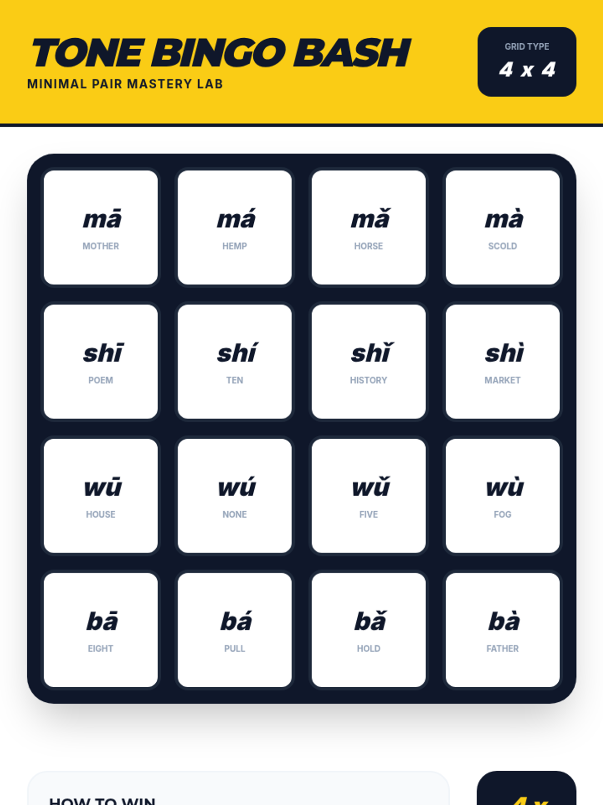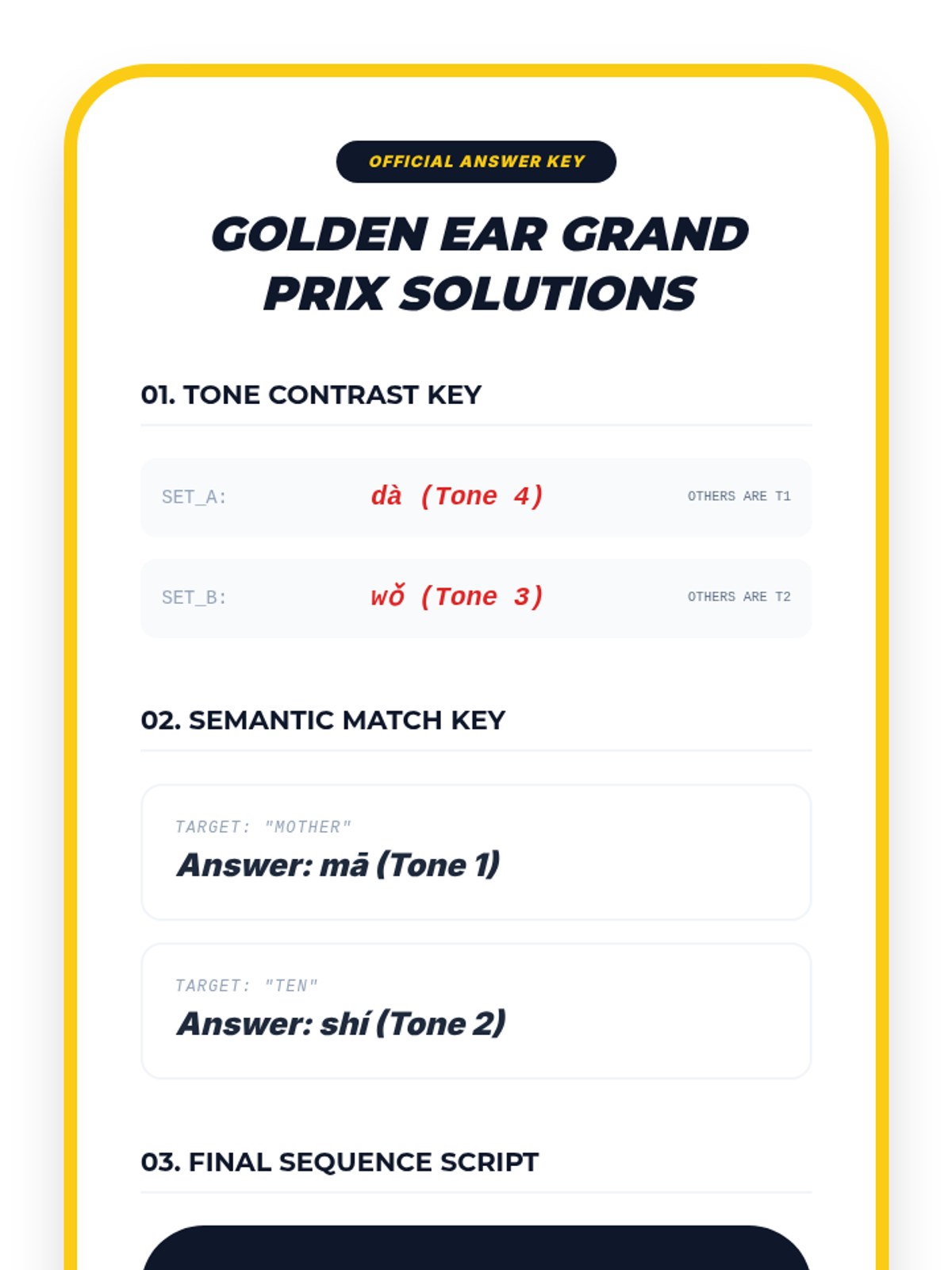 A gamified sequence for 9th-grade Mandarin beginners focused on auditory discrimination of the four Chinese tones. Students progress from basic contrasts to complex minimal pairs and sequential processing through competitive drills and ear training.