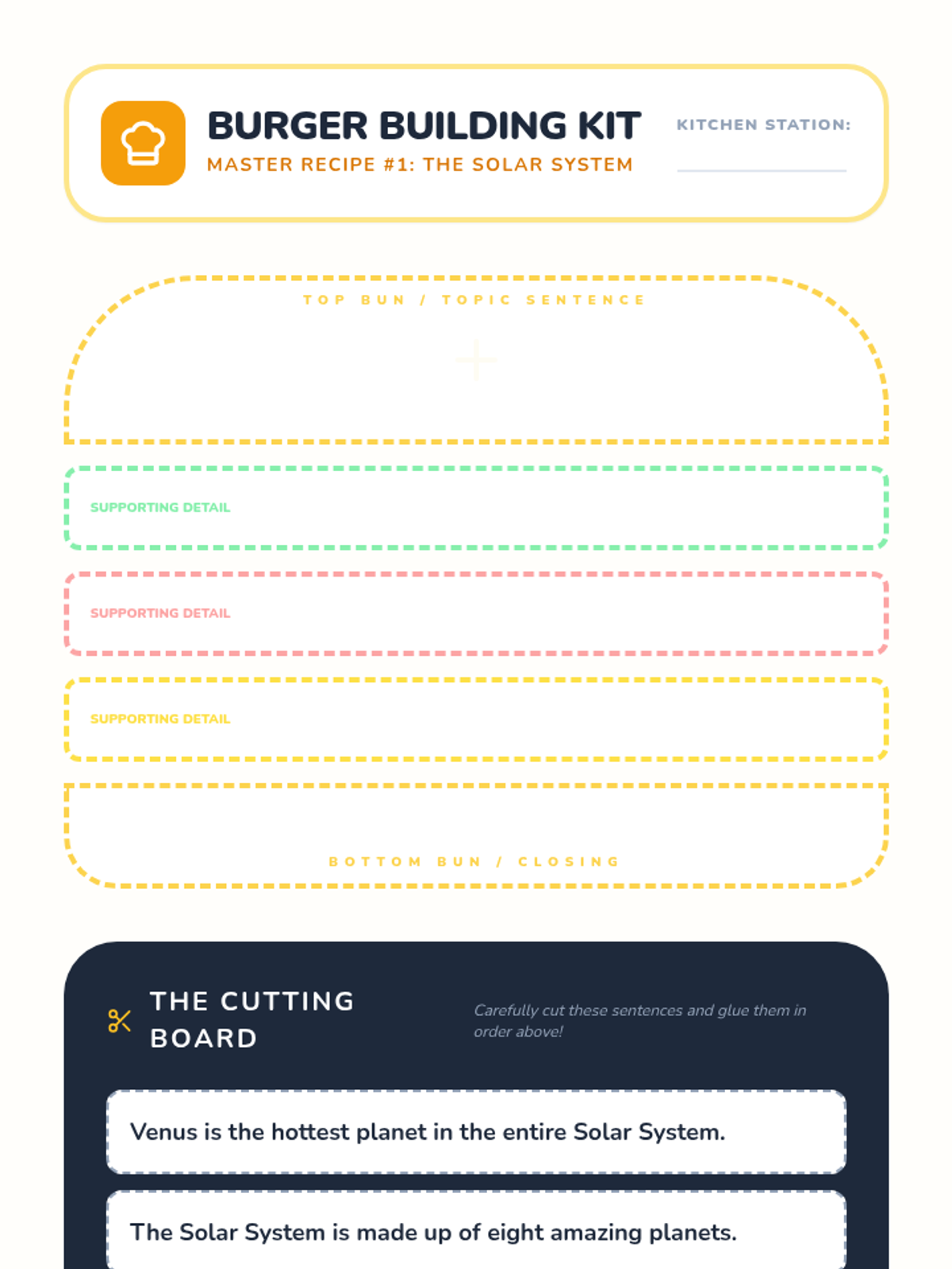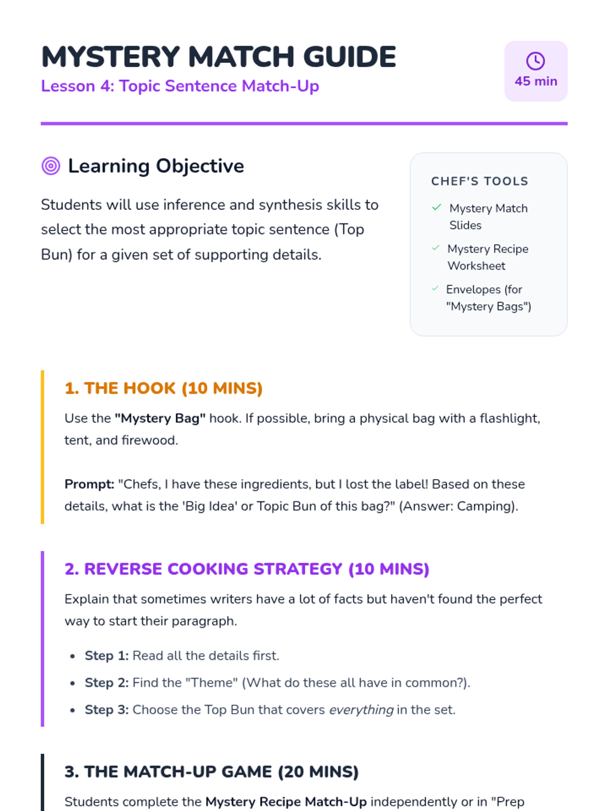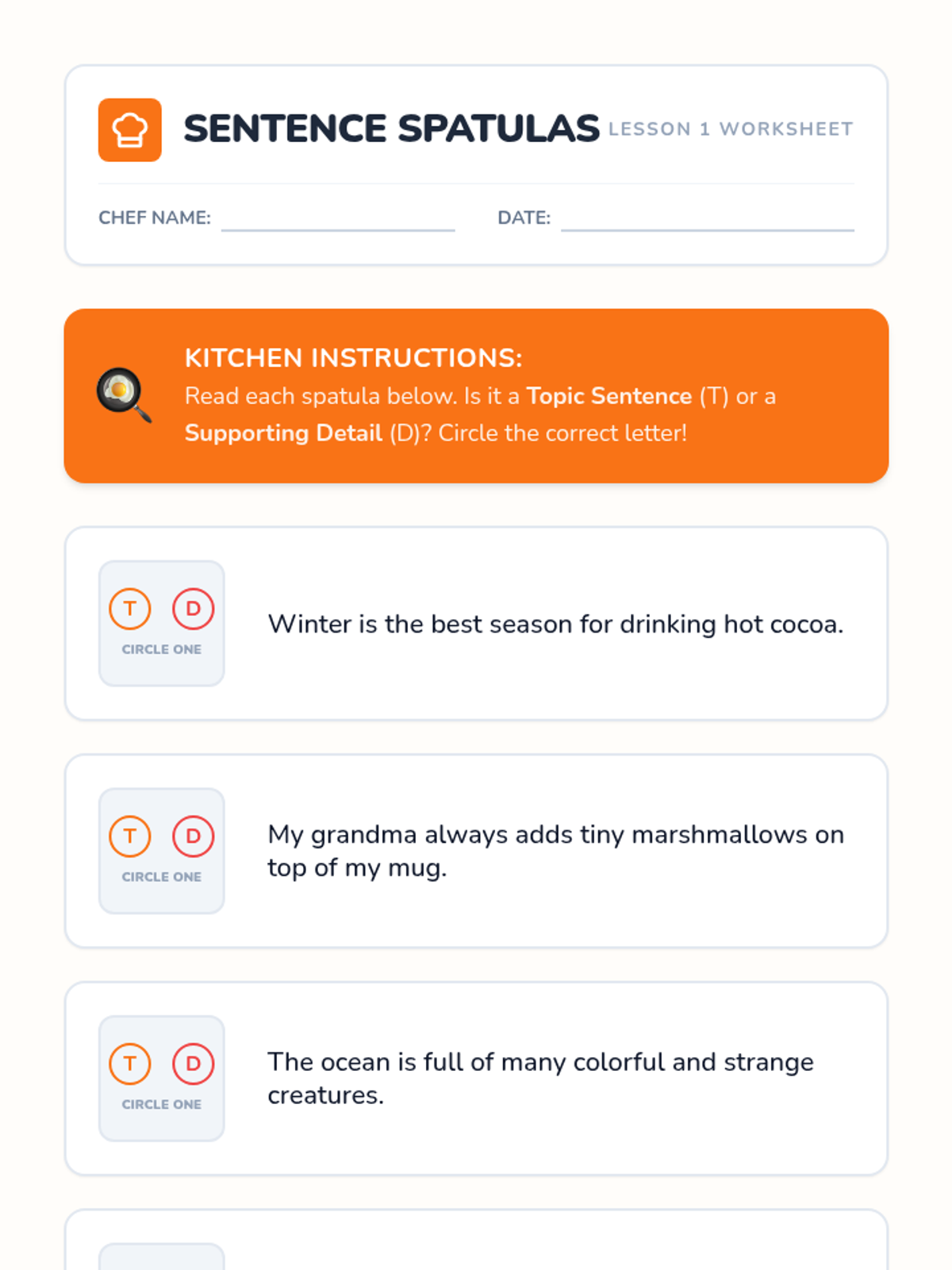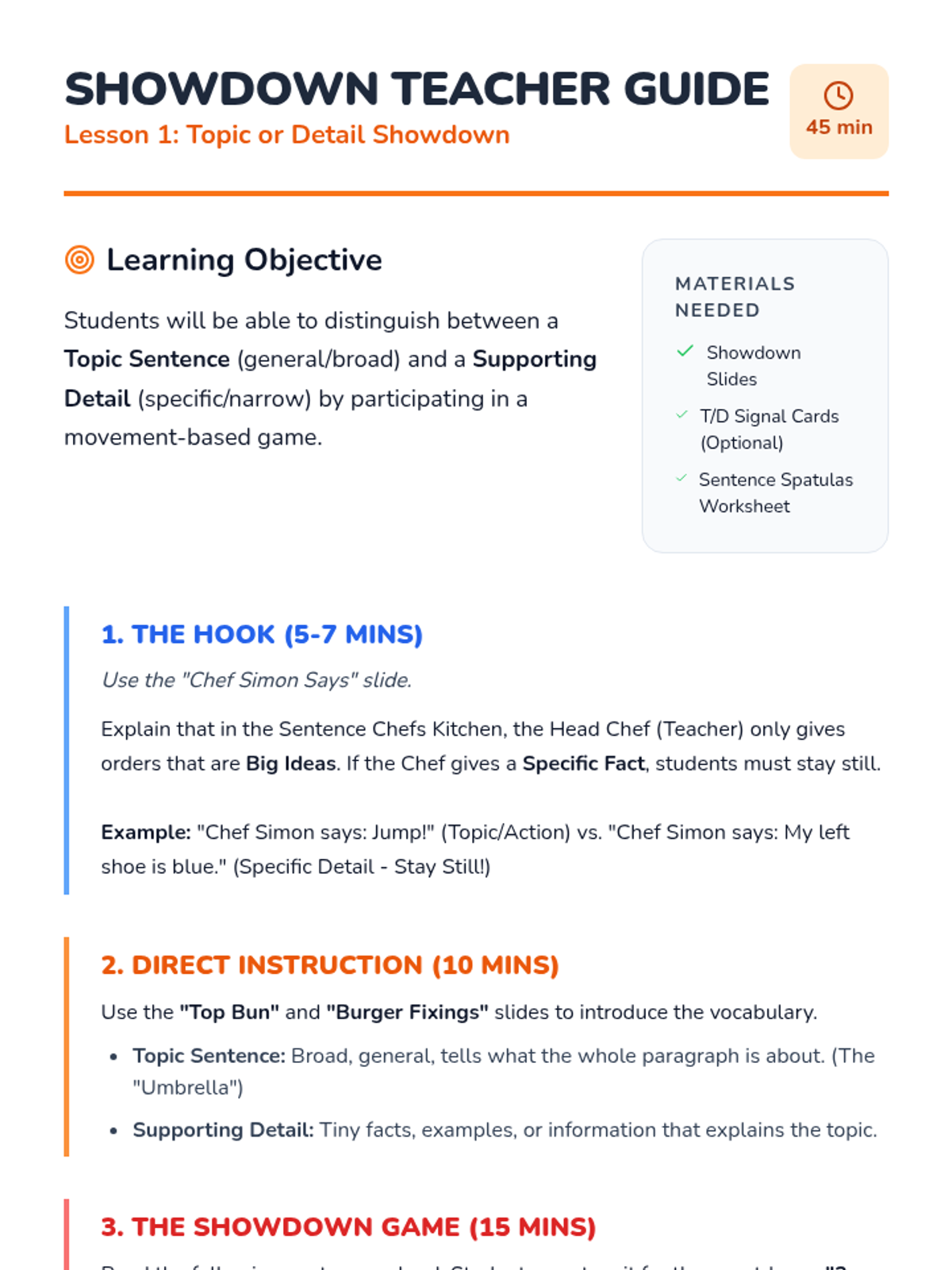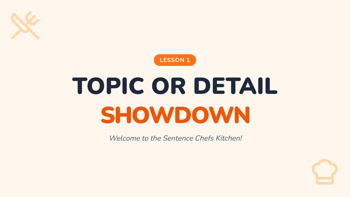 A game-based sequence for 2nd graders to master topic sentences and supporting details through a 'Chef's Kitchen' theme. Students progress from identifying sentence types to building full 'burger' paragraphs and identifying irrelevant details.