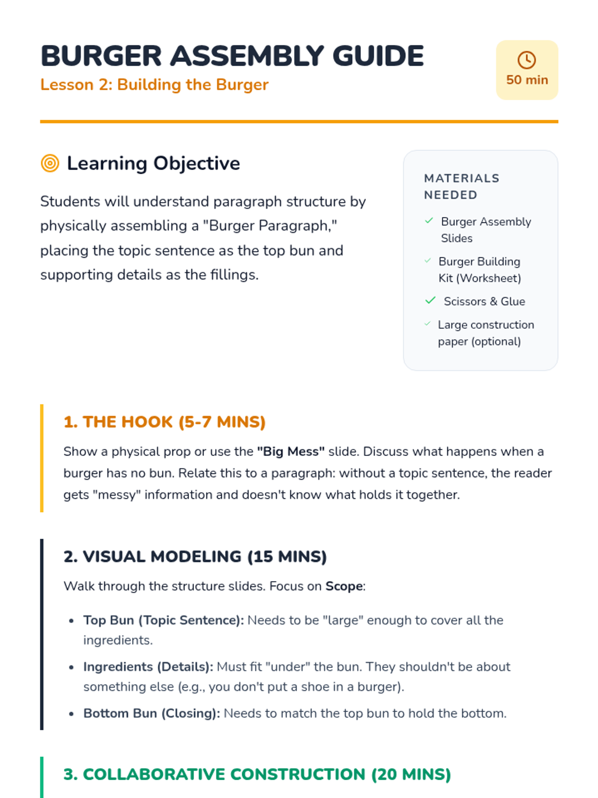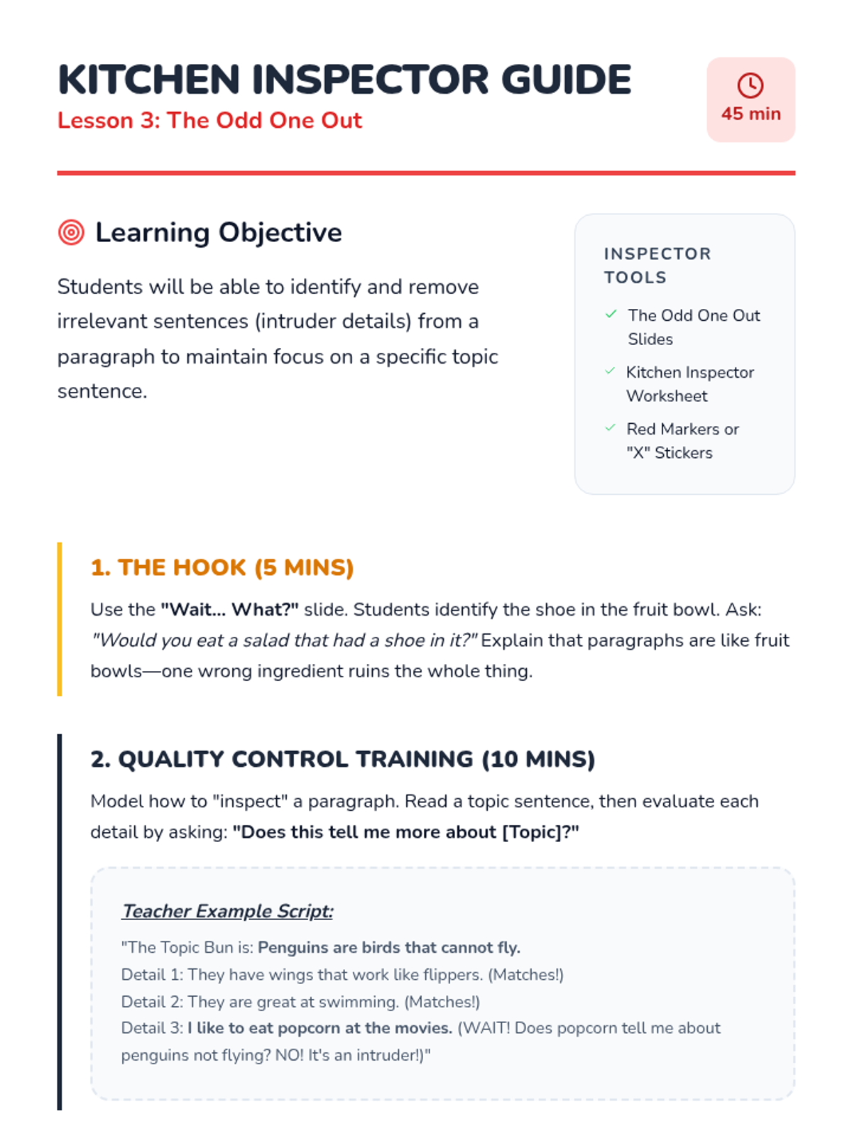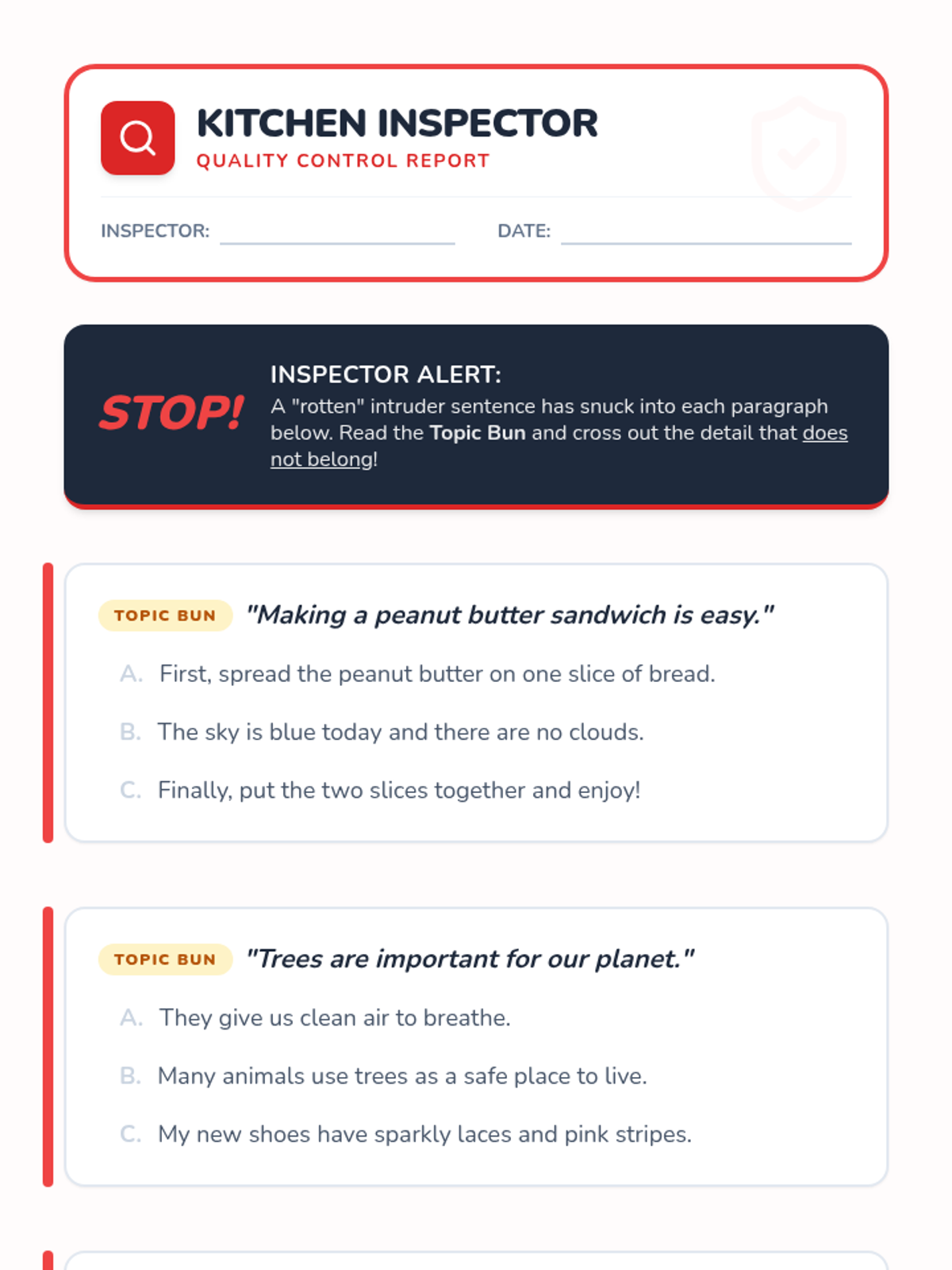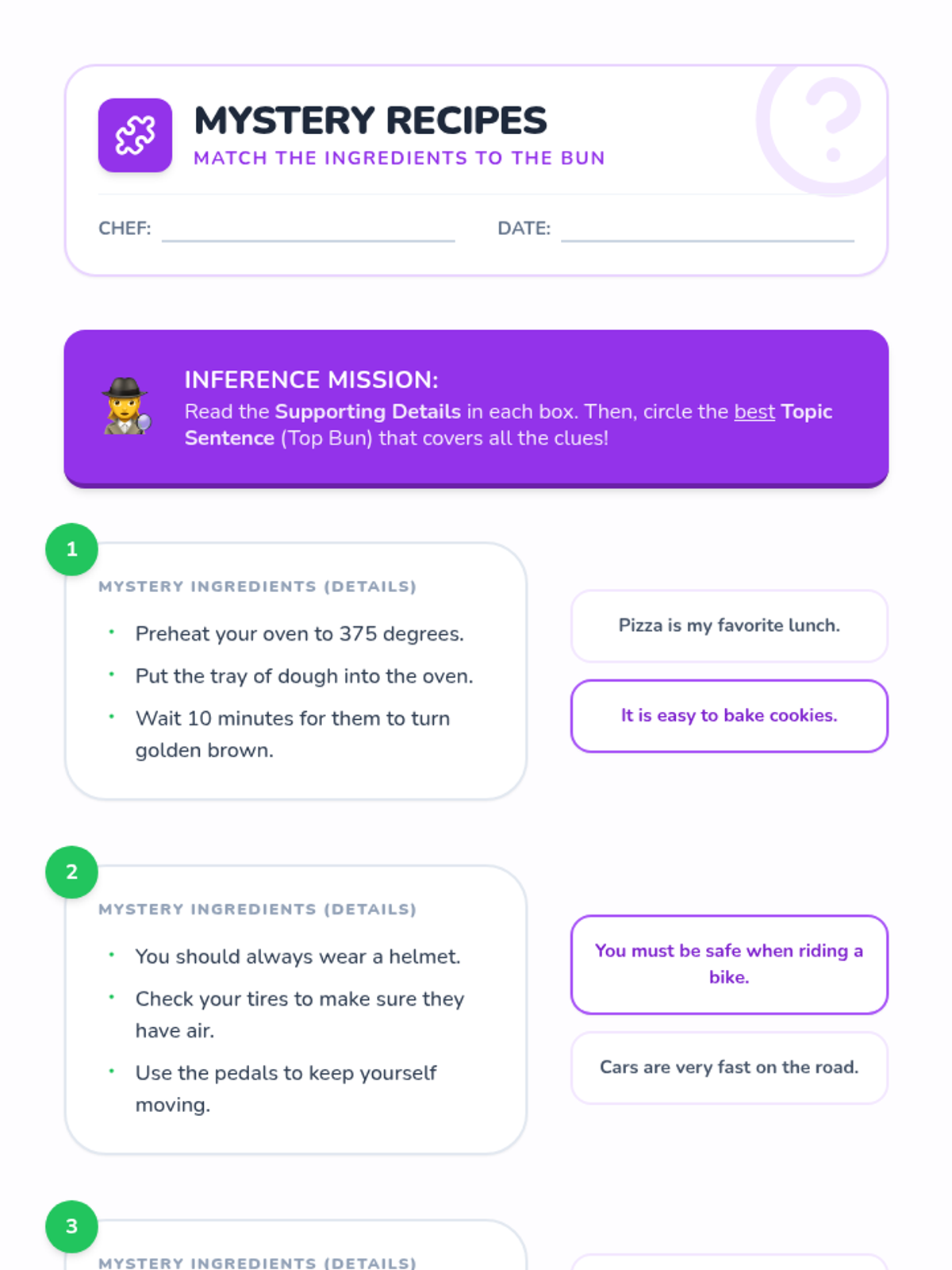 A game-based sequence for 2nd graders to master topic sentences and supporting details through a 'Chef's Kitchen' theme. Students progress from identifying sentence types to building full 'burger' paragraphs and identifying irrelevant details.