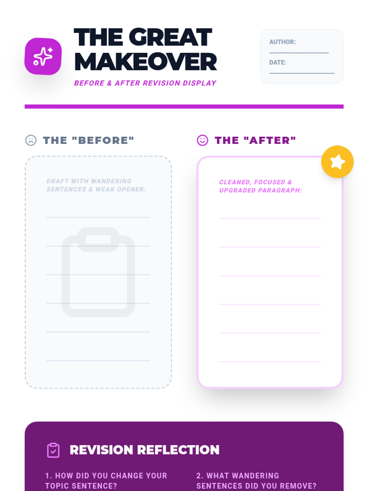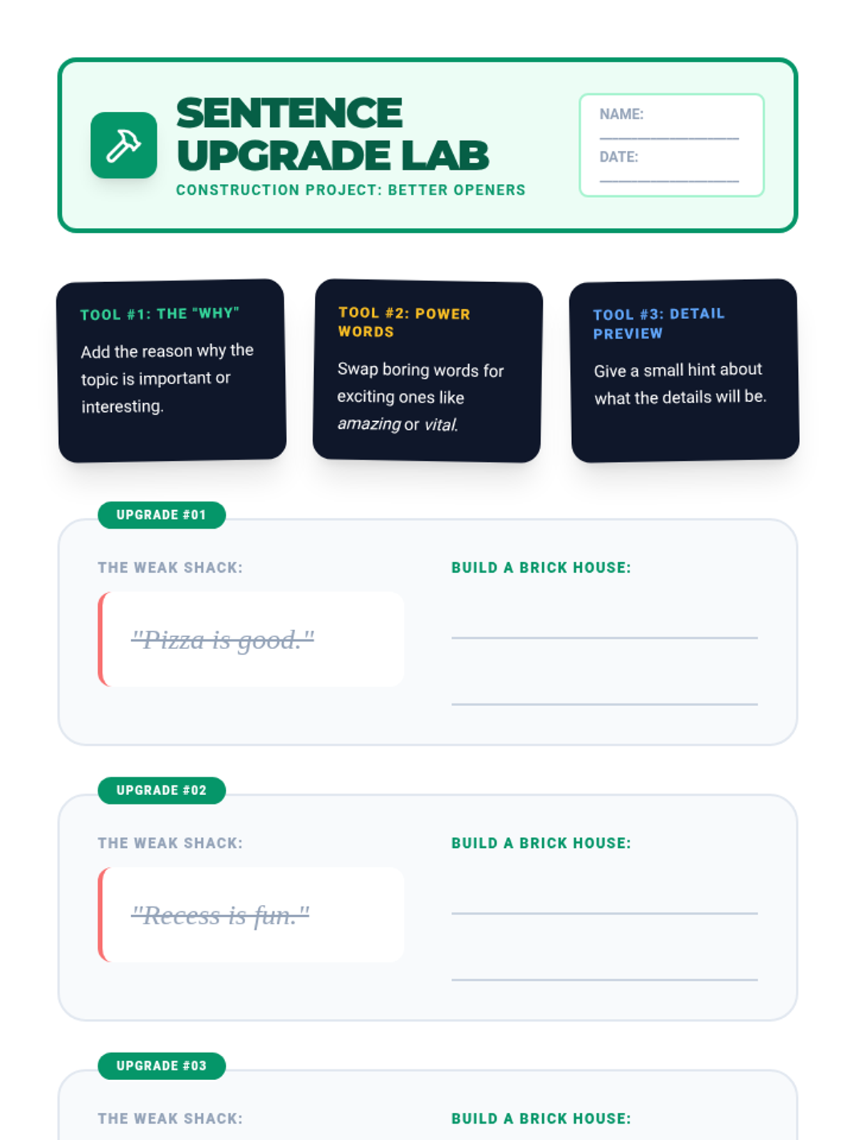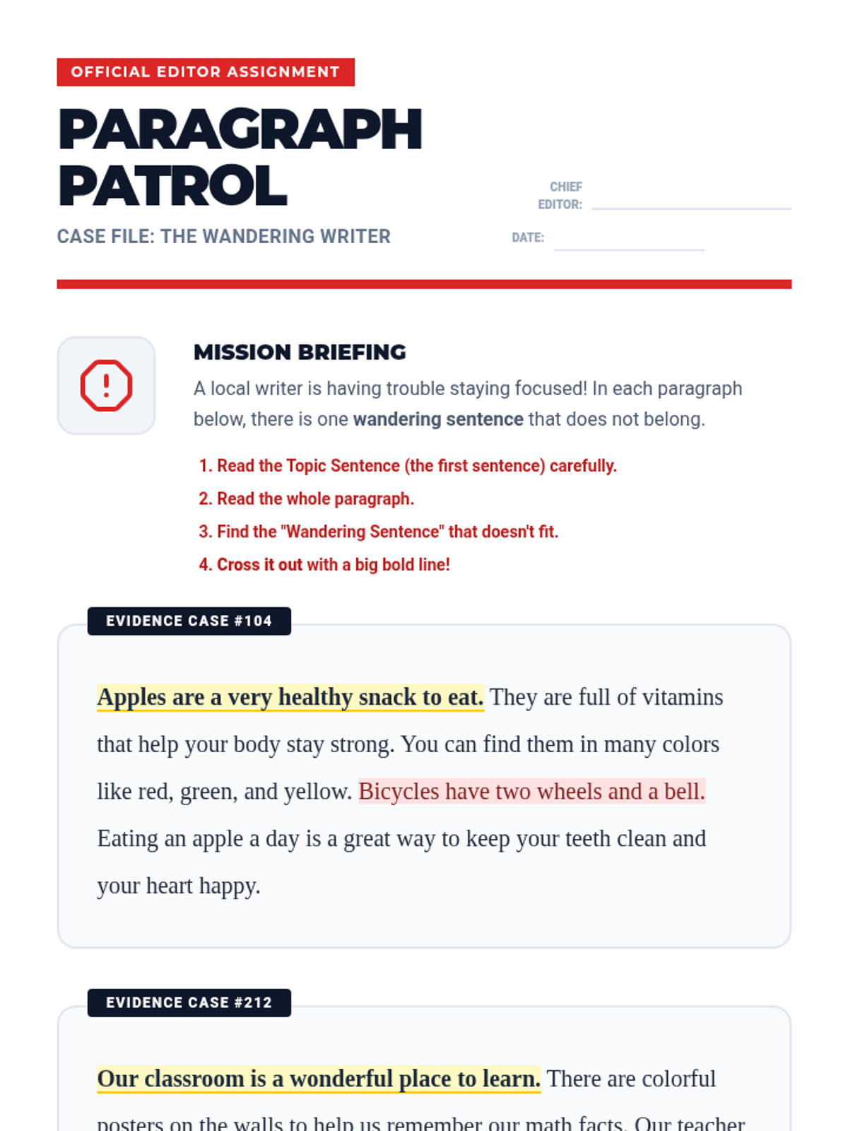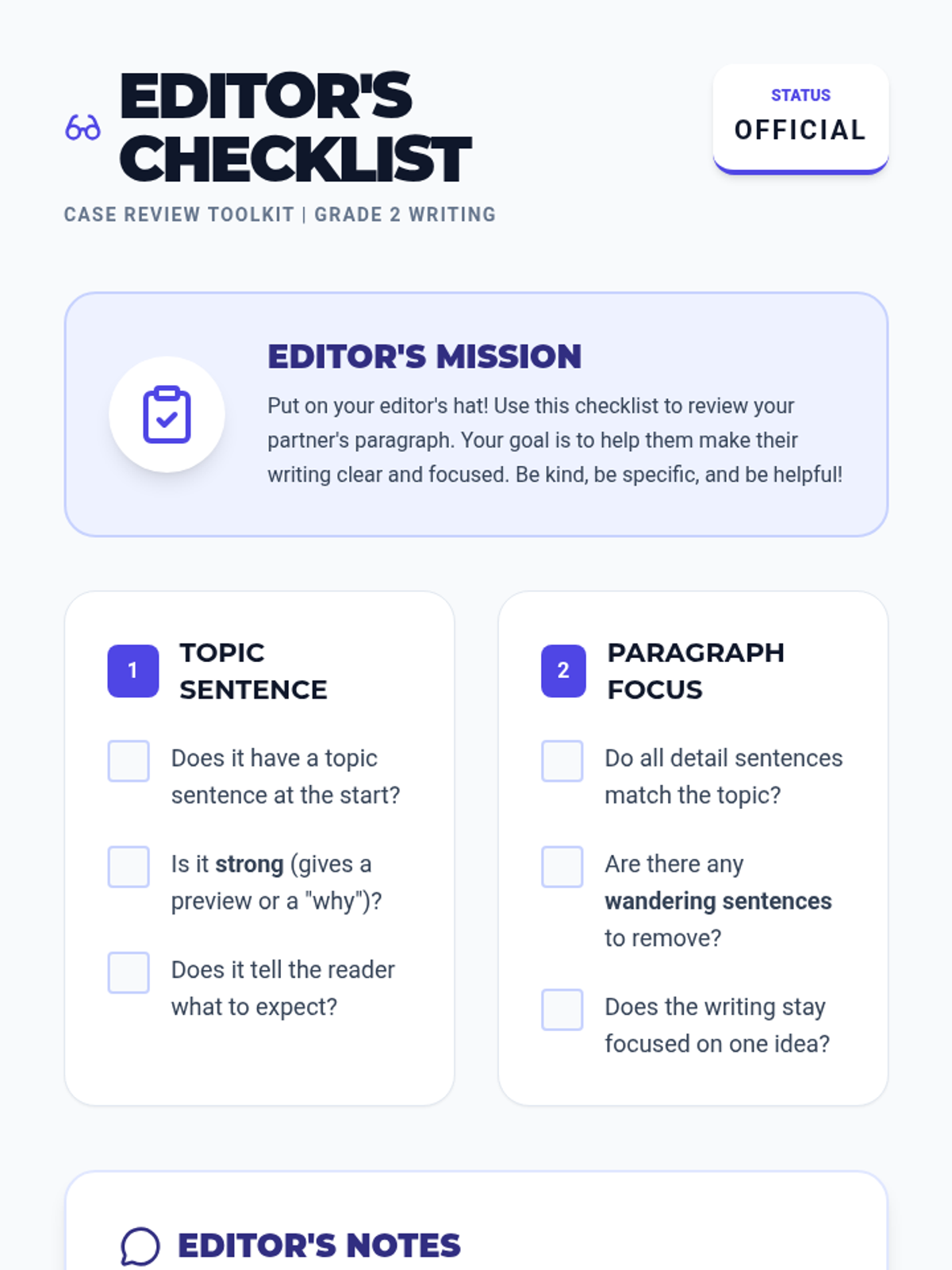 A 2nd-grade writing sequence focused on identifying, evaluating, and revising topic sentences using a 'Writing Detective' and 'Editor' theme. Students progress from finding missing main ideas to strengthening weak openers and performing peer reviews.