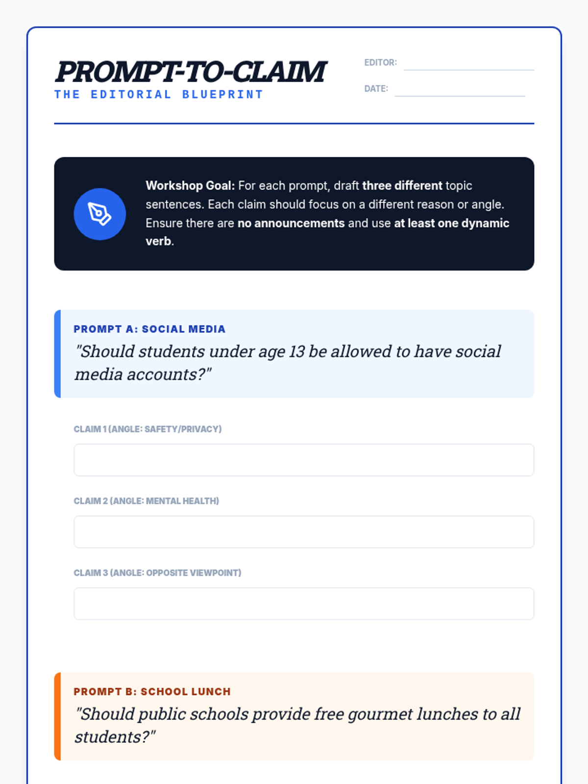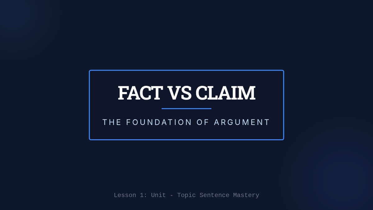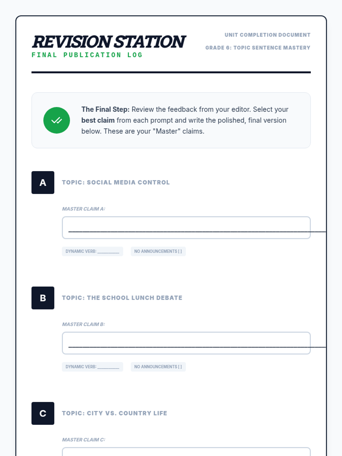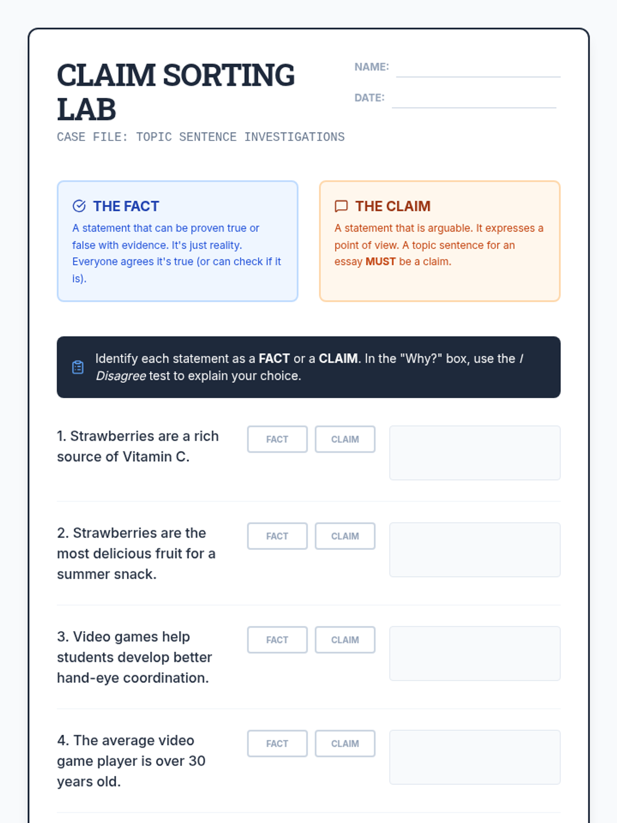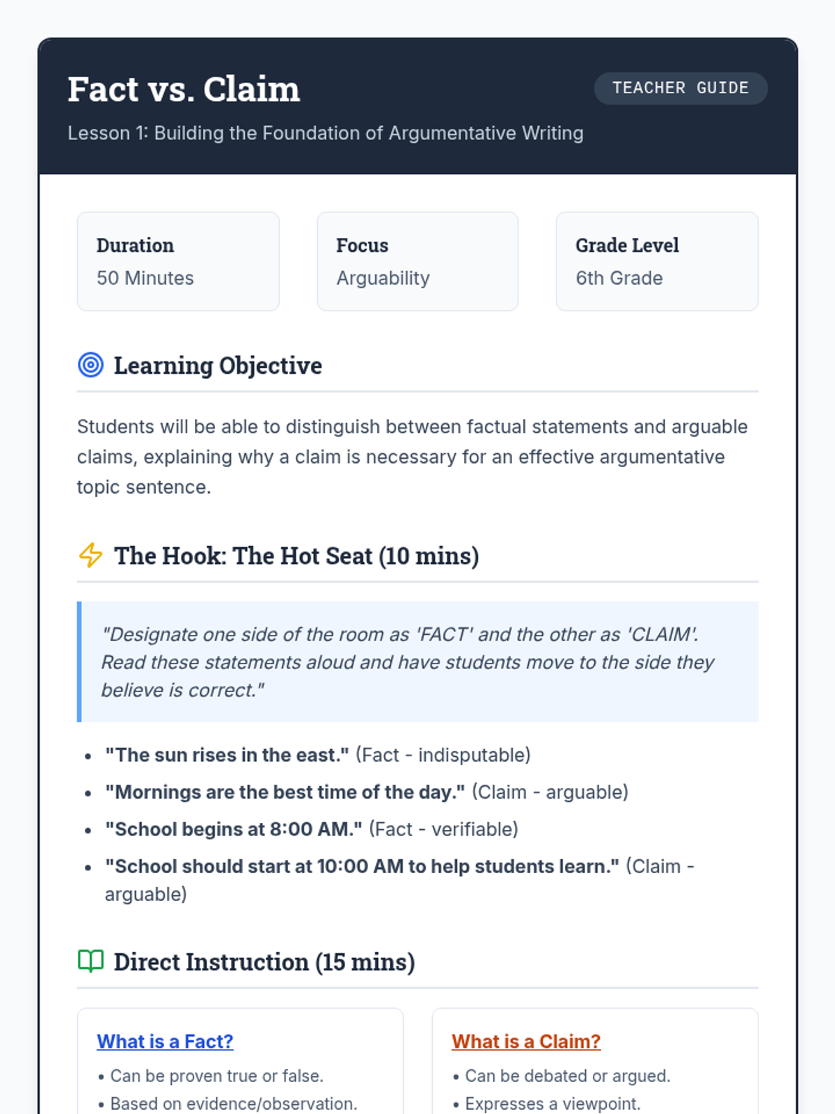 This 5-lesson unit teaches 6th-grade students how to craft strong, arguable topic sentences for persuasive essays, moving away from factual statements and first-person announcements toward bold, verb-driven claims. Students progress from distinguishing facts from claims to drafting and refining their own argumentative topic sentences through workshop-style activities.