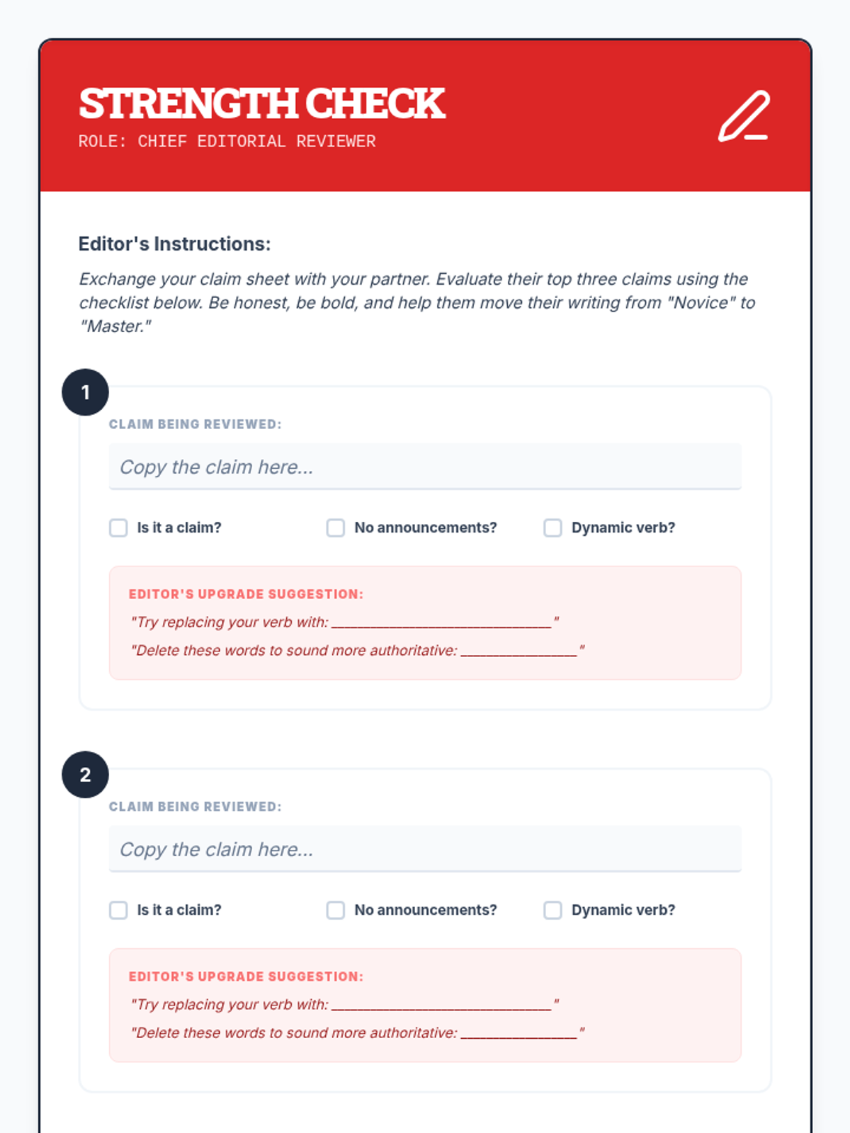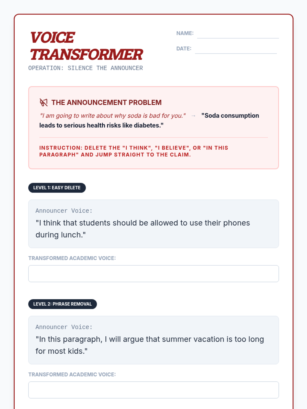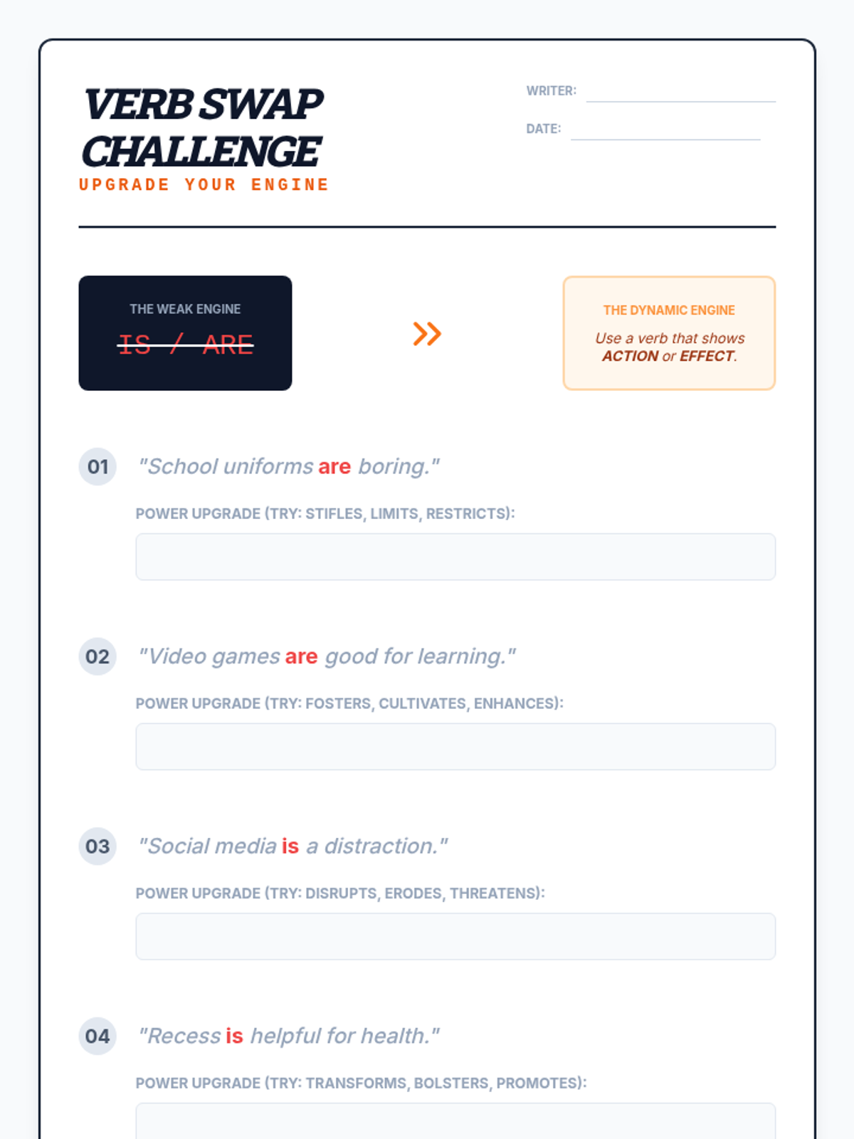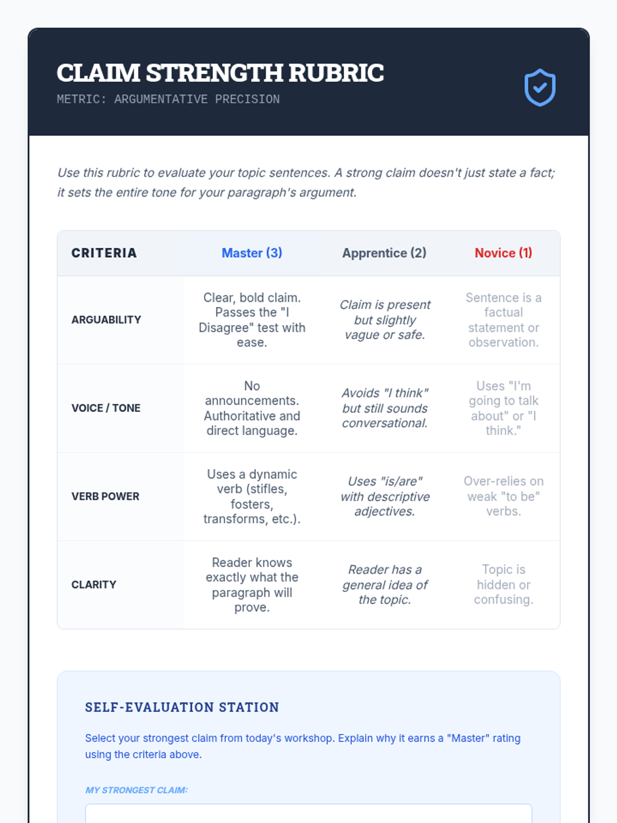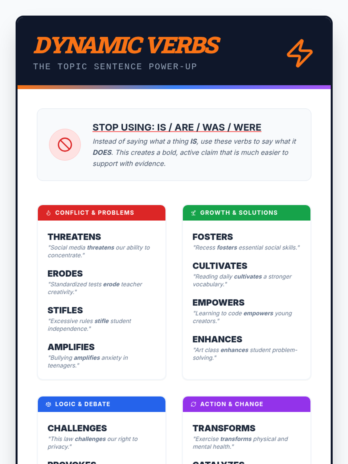 This 5-lesson unit teaches 6th-grade students how to craft strong, arguable topic sentences for persuasive essays, moving away from factual statements and first-person announcements toward bold, verb-driven claims. Students progress from distinguishing facts from claims to drafting and refining their own argumentative topic sentences through workshop-style activities.