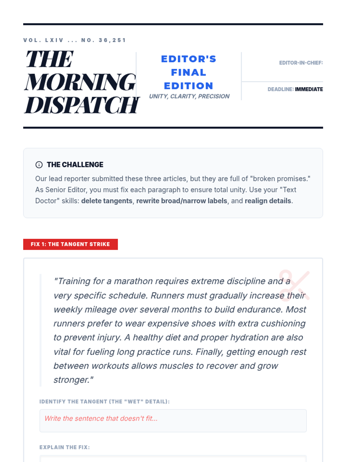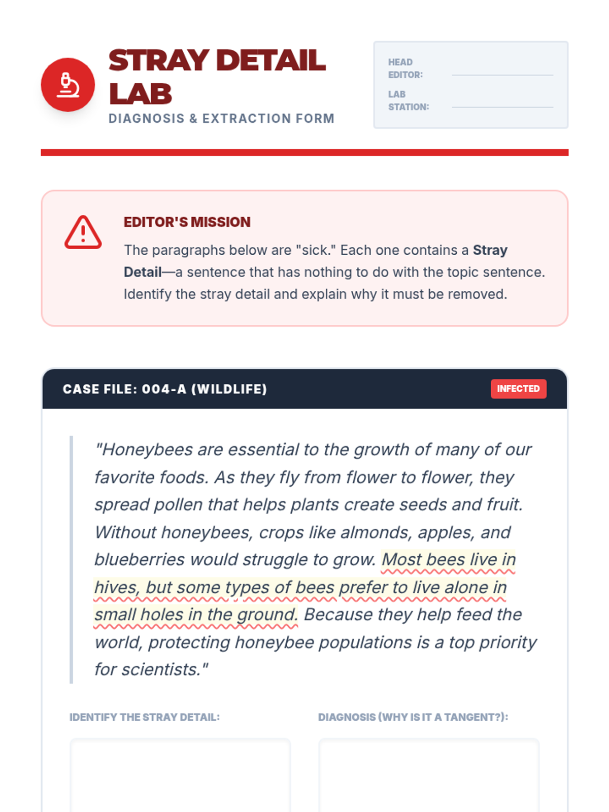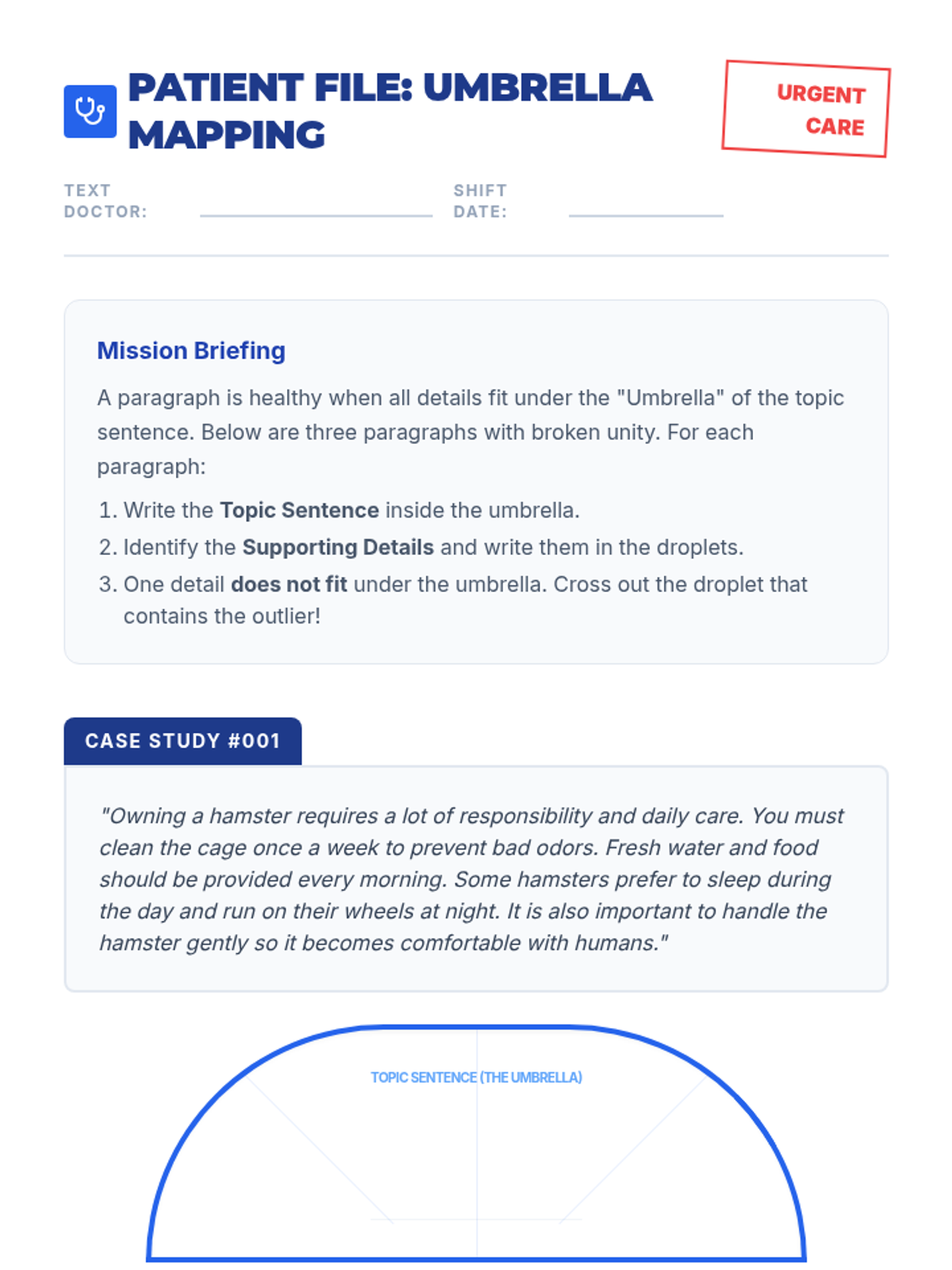 A game-based simulation for 6th-grade students to master paragraph unity and topic sentences through the lens of 'Text Doctors' and 'Editors'. Students learn how a topic sentence acts as a contract, ensuring all evidence aligns with the central claim.