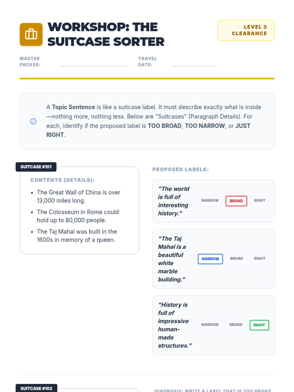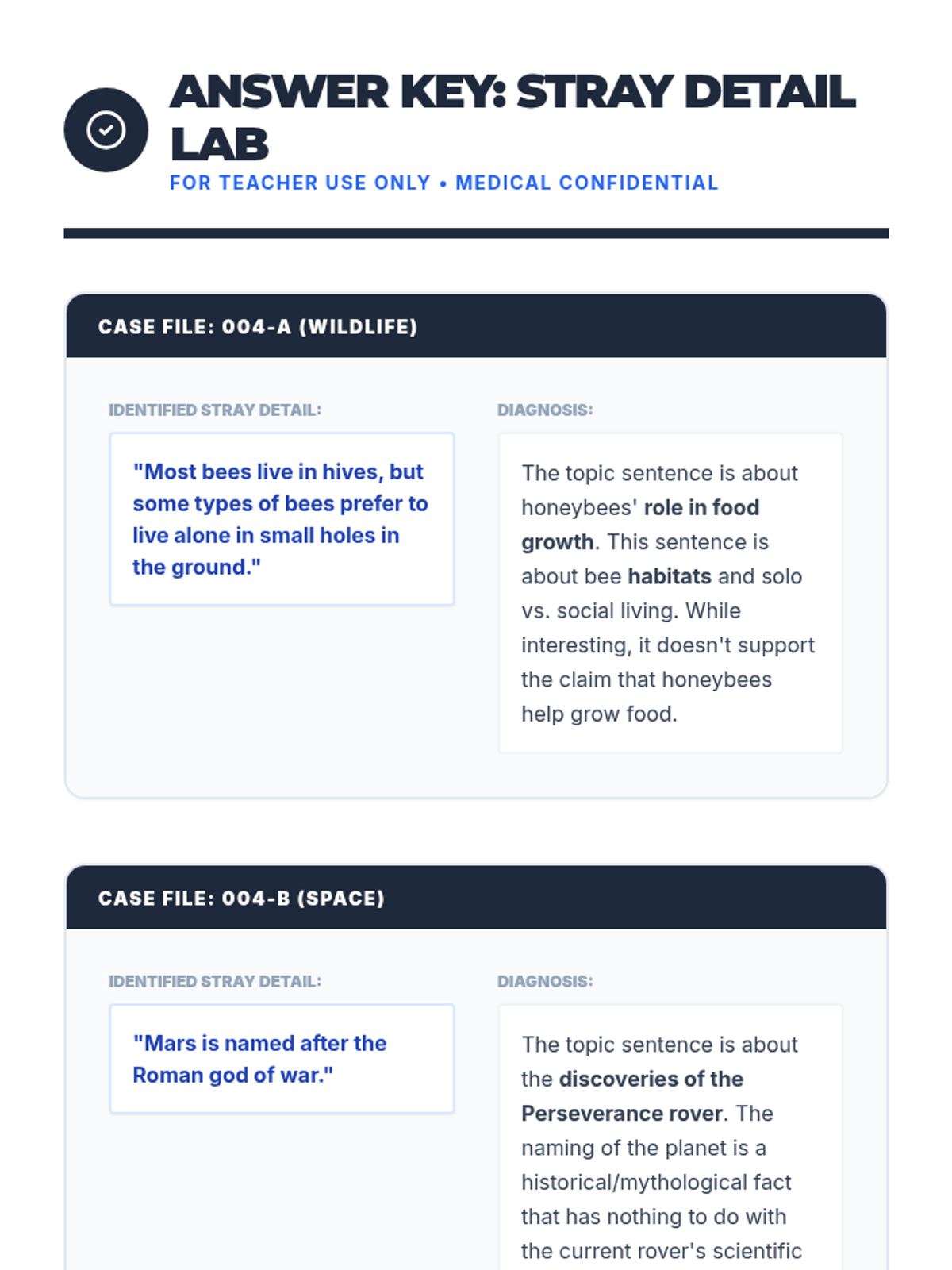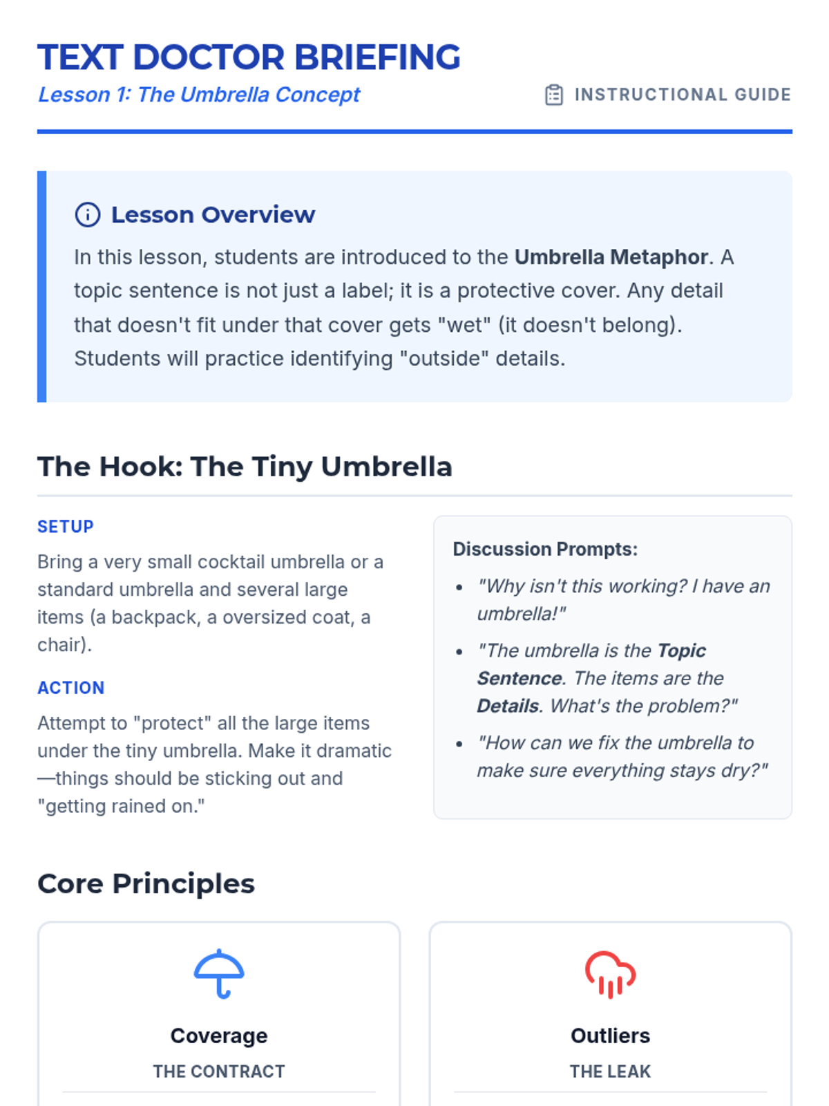 A game-based simulation for 6th-grade students to master paragraph unity and topic sentences through the lens of 'Text Doctors' and 'Editors'. Students learn how a topic sentence acts as a contract, ensuring all evidence aligns with the central claim.