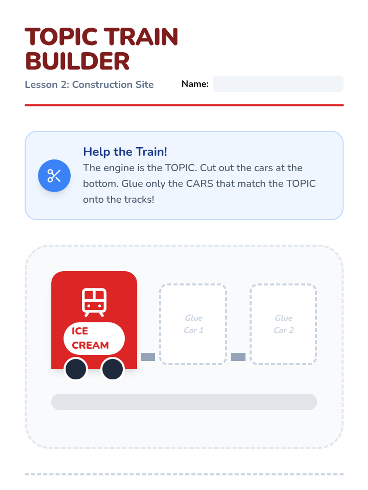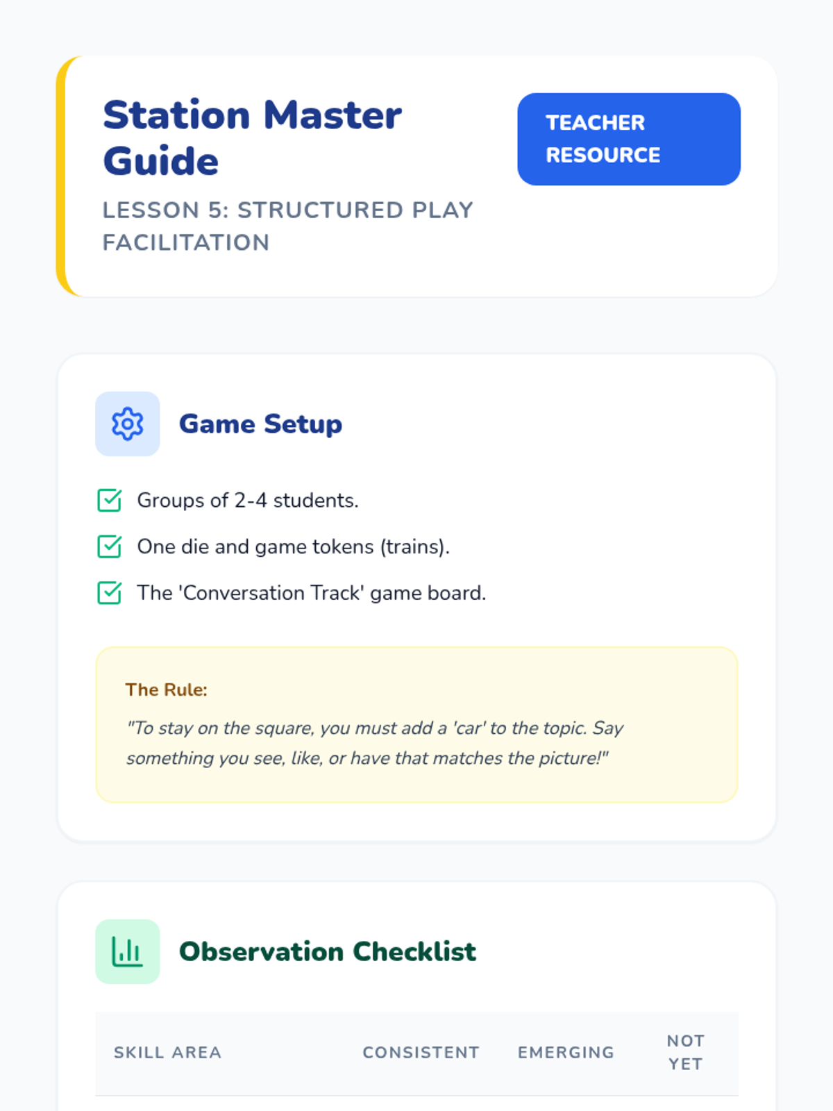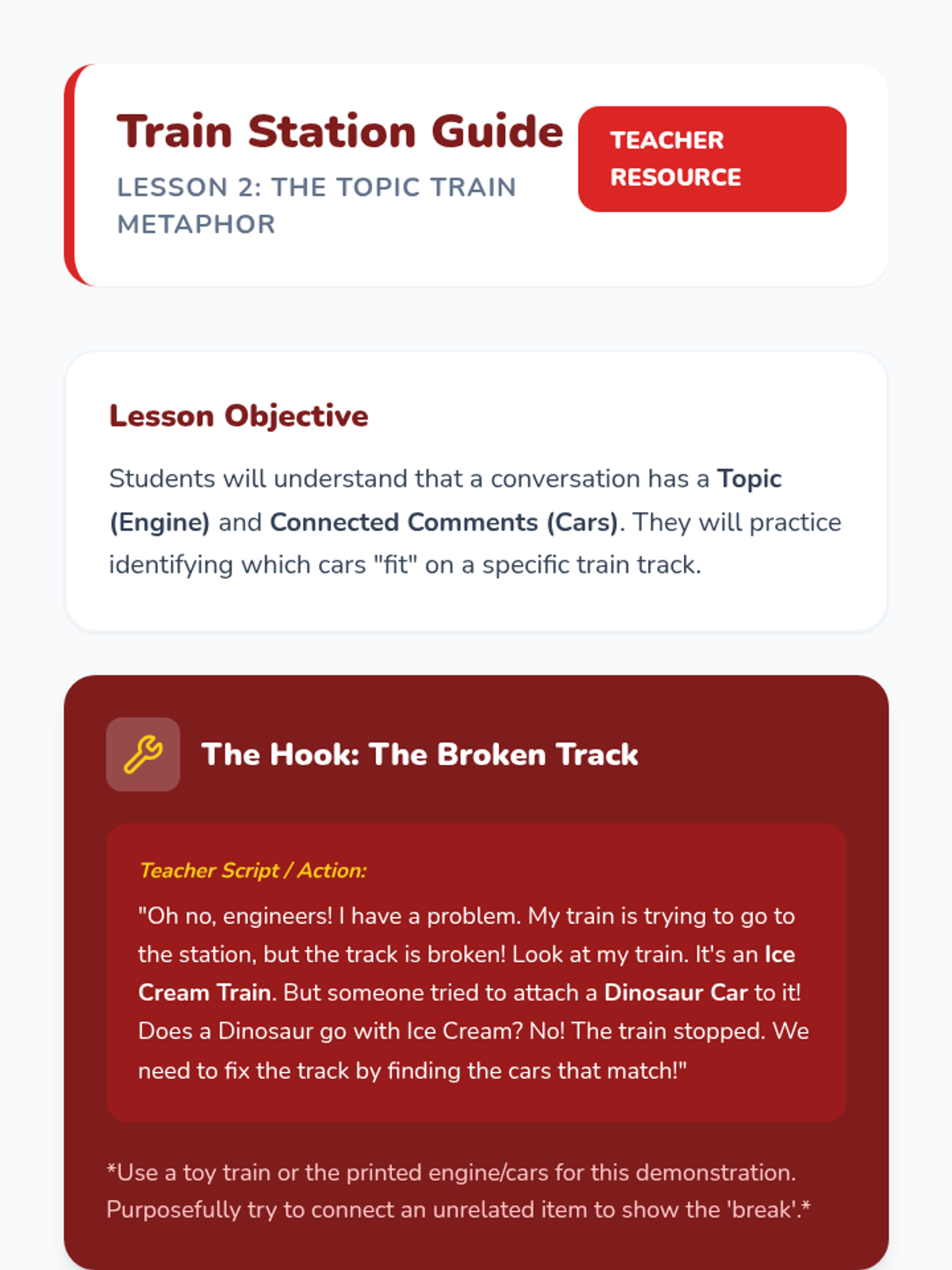 A Kindergarten Social Communication sequence that uses the 'Topic Train' metaphor to teach students how to identify, maintain, and contribute to conversational topics. students progress from basic categorization to generating connected comments in peer play.