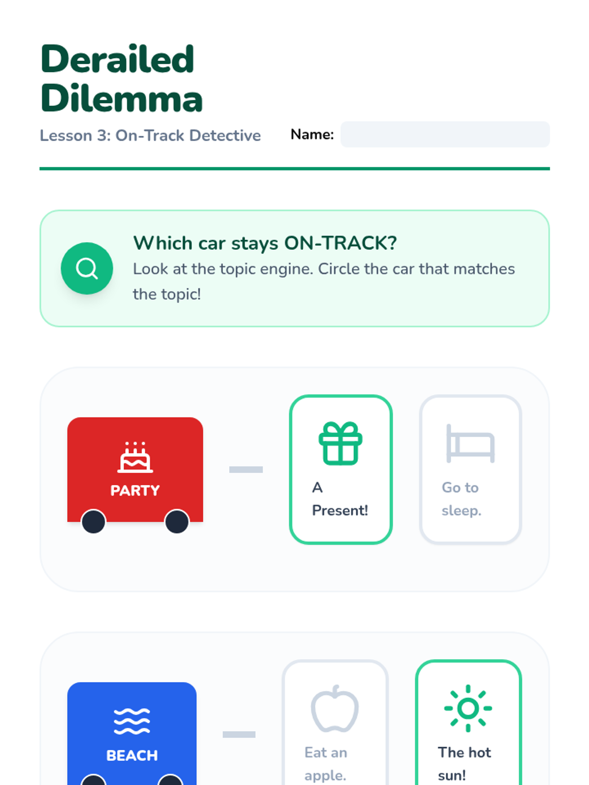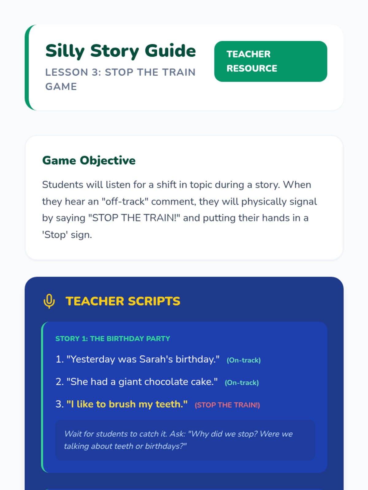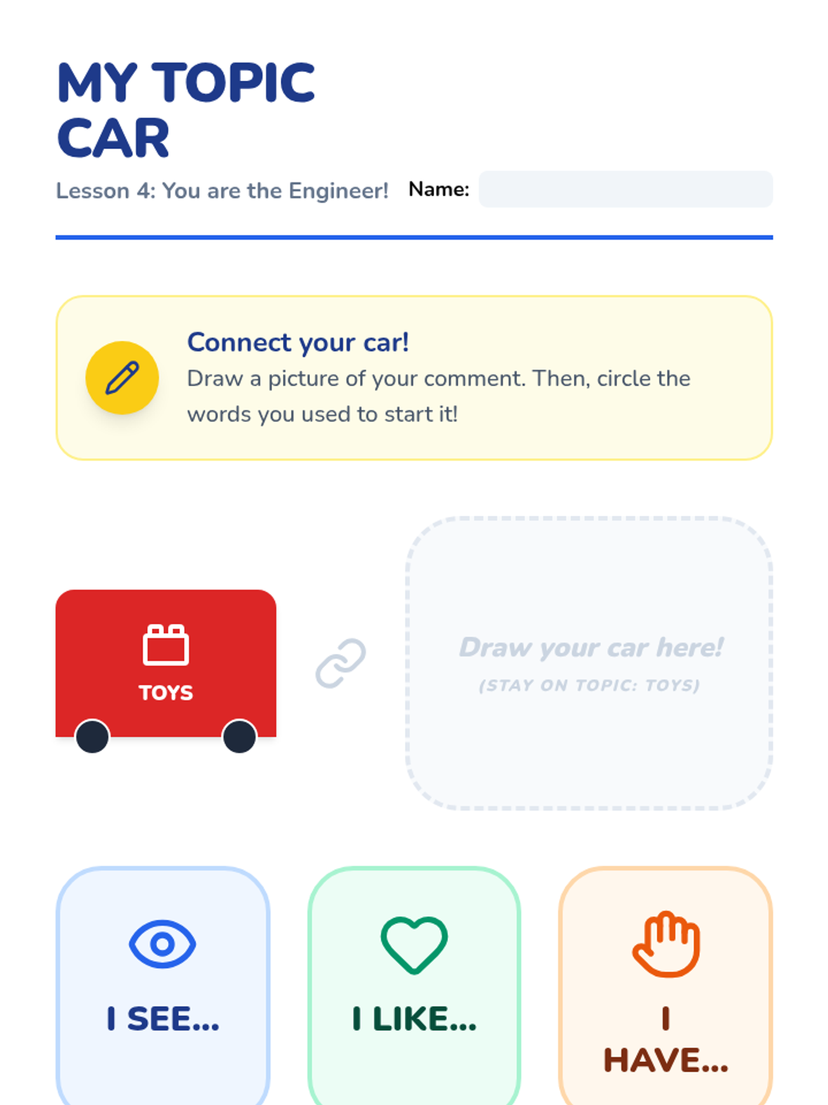 A Kindergarten Social Communication sequence that uses the 'Topic Train' metaphor to teach students how to identify, maintain, and contribute to conversational topics. students progress from basic categorization to generating connected comments in peer play.