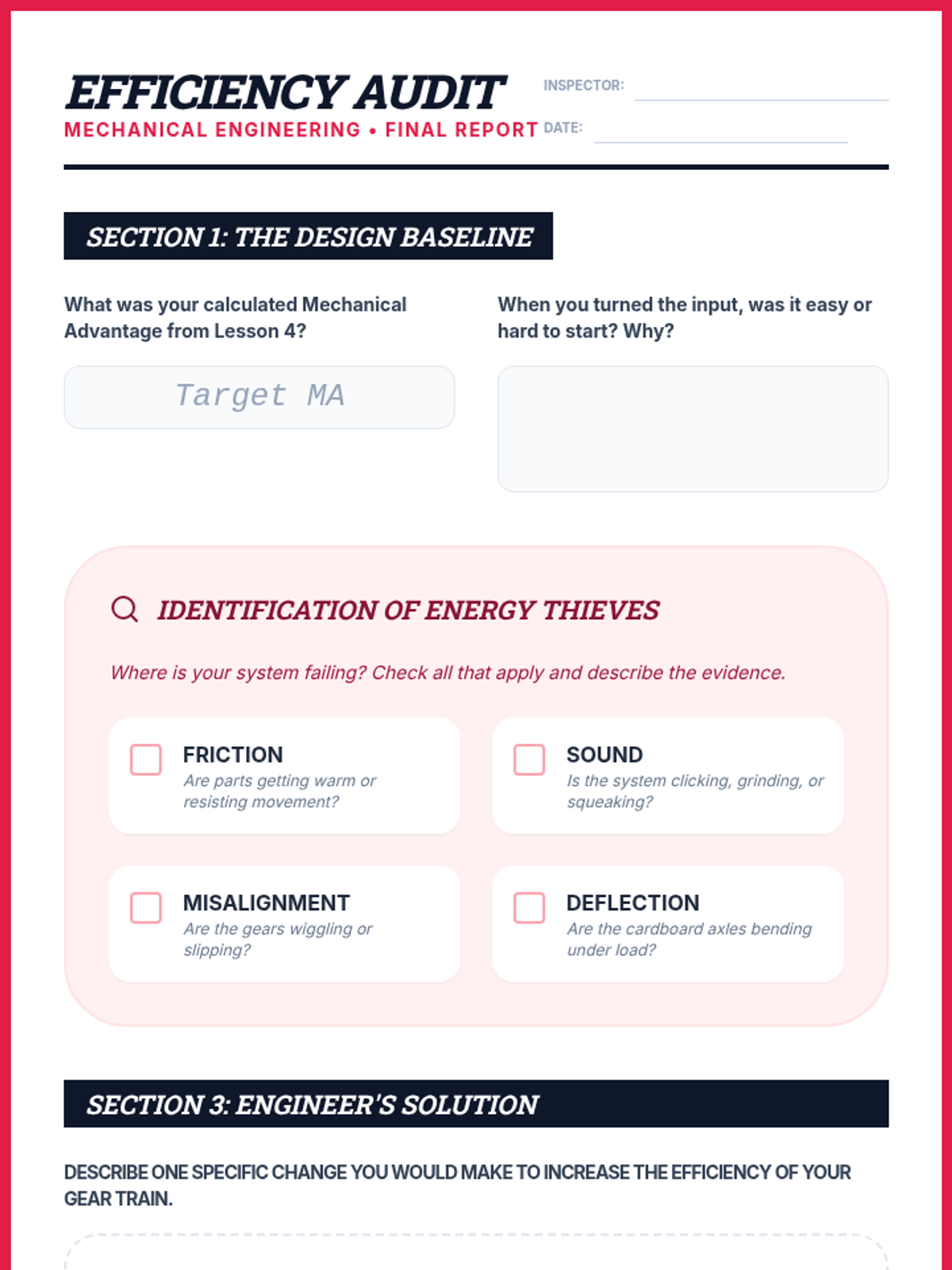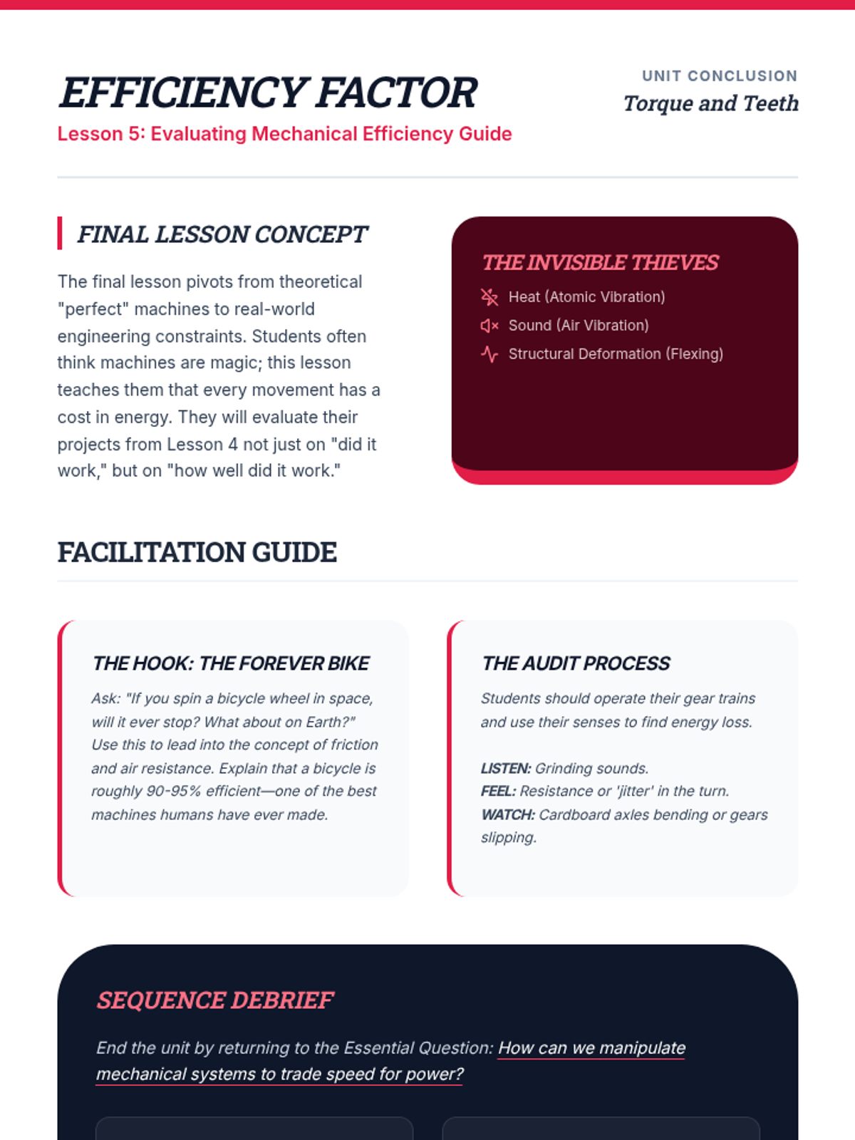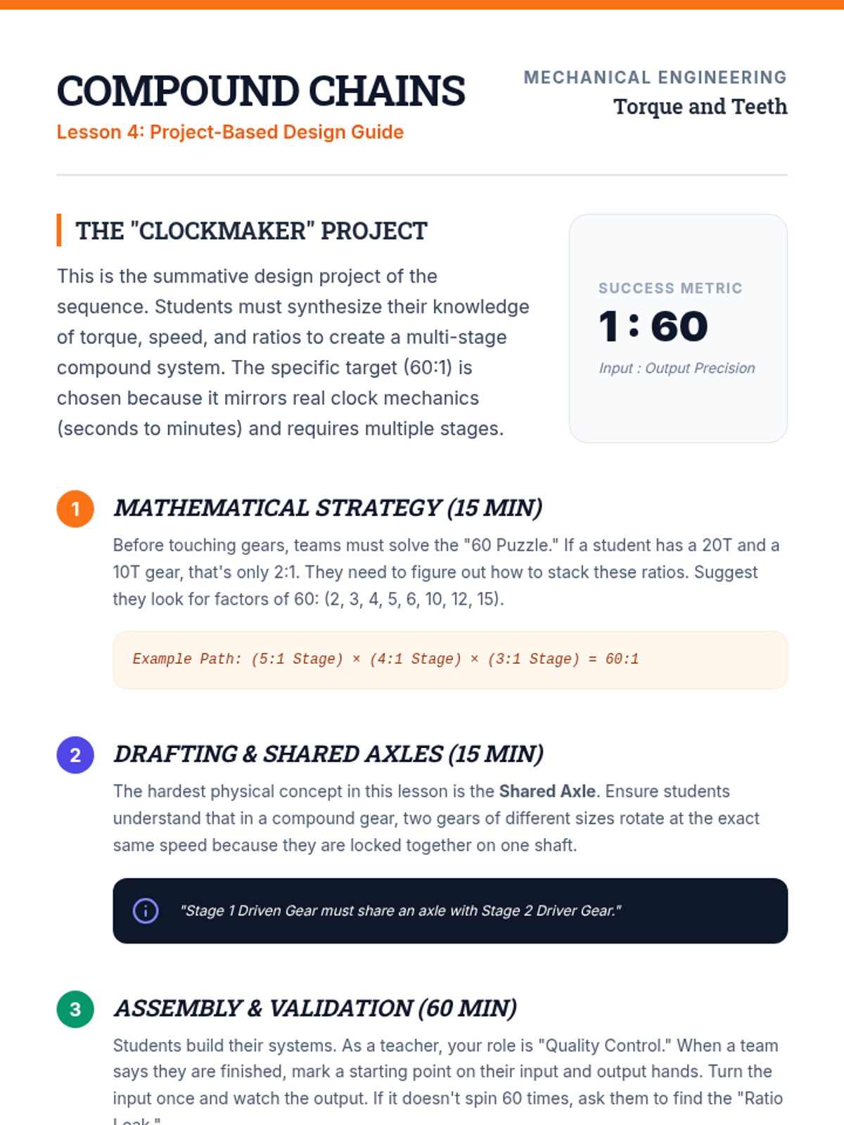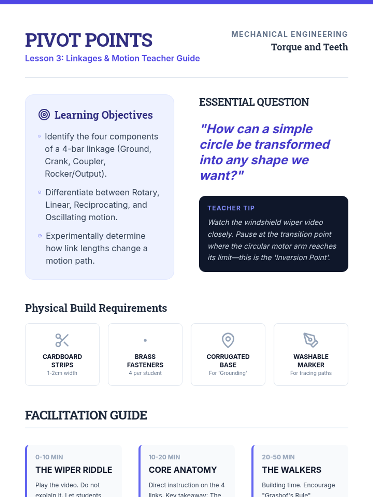 Students explore kinematics by dissecting how machines transform energy into motion using gears and linkages. They investigate mechanical advantage through experimentation and apply this knowledge to design mechanisms, emphasizing the mathematical relationship between input and output forces.
