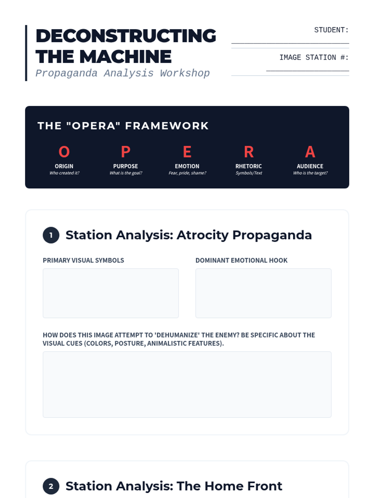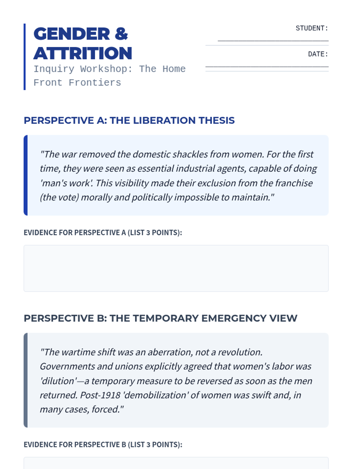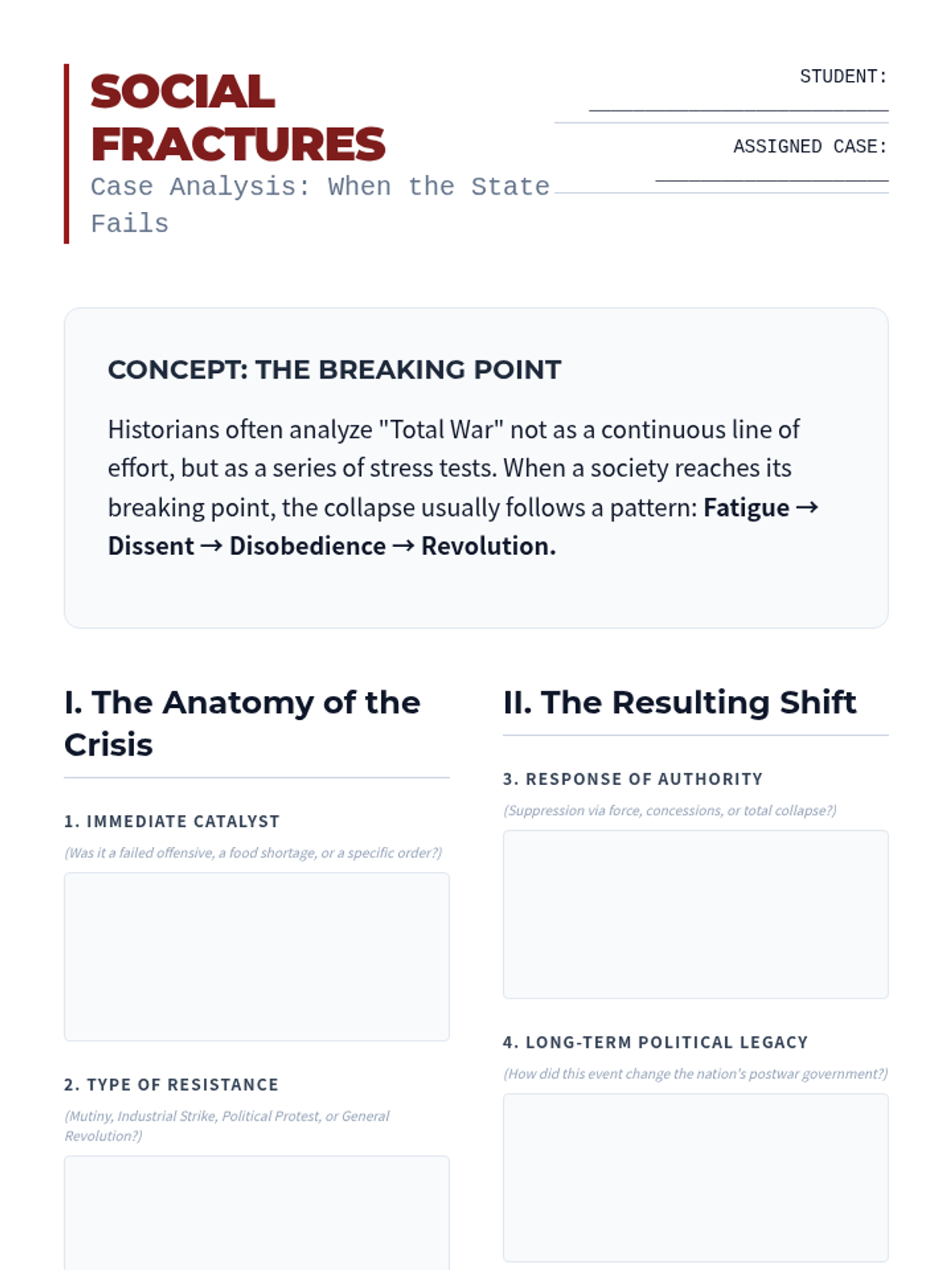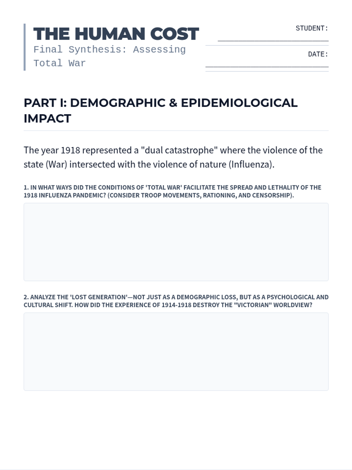 This sequence analyzes the concept of 'Total War' and its impact on civilian populations, economies, and social structures during World War I. Students explore government expansion, propaganda, the role of women, and the suppression of dissent, moving from initial enthusiasm to social fracturing and exhaustion by 1918.