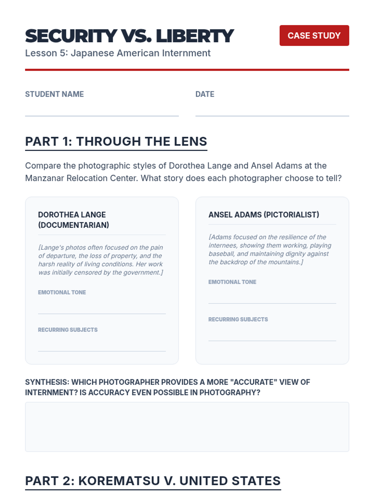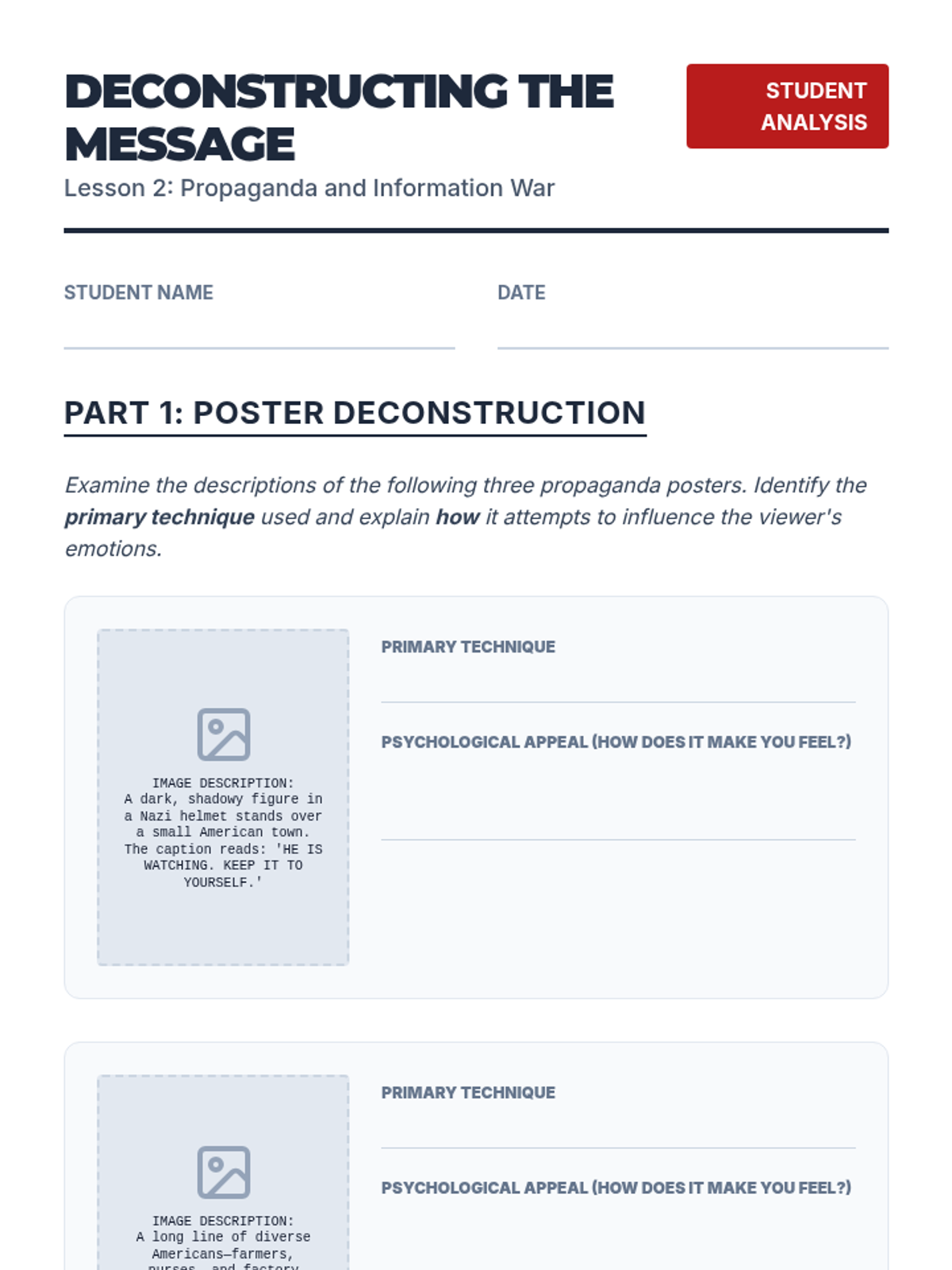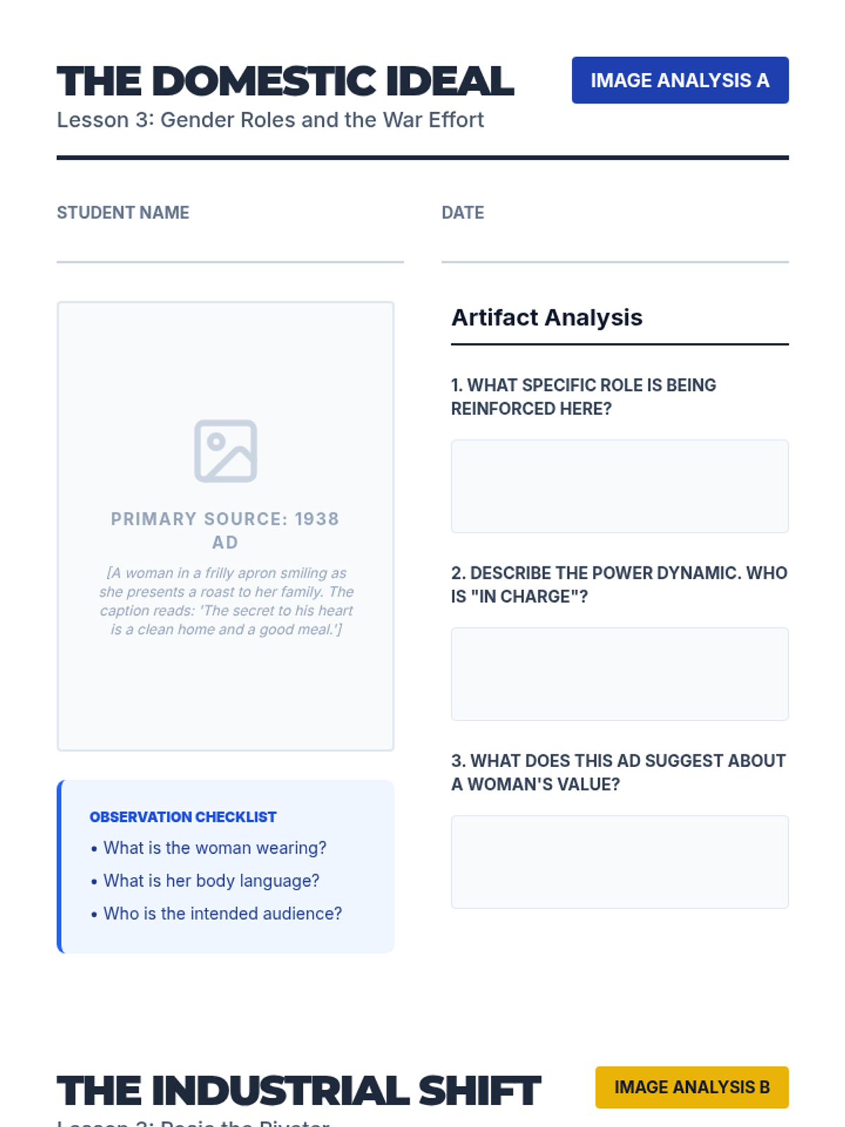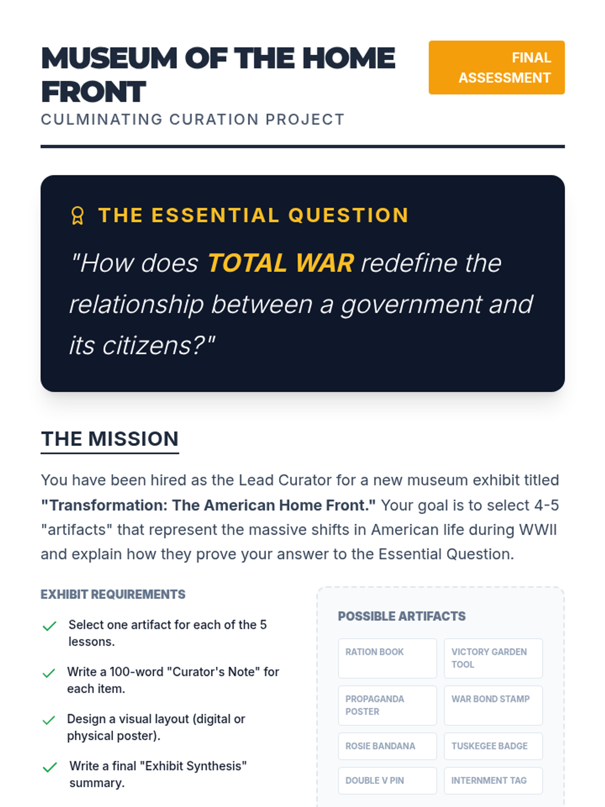 A project-based unit exploring the concept of 'Total War' and its transformative effect on civilian life, social roles, and civil liberties during WWII. Students analyze economic mobilization, propaganda, and the shift in societal norms for women and minorities, culminating in a museum curation project.