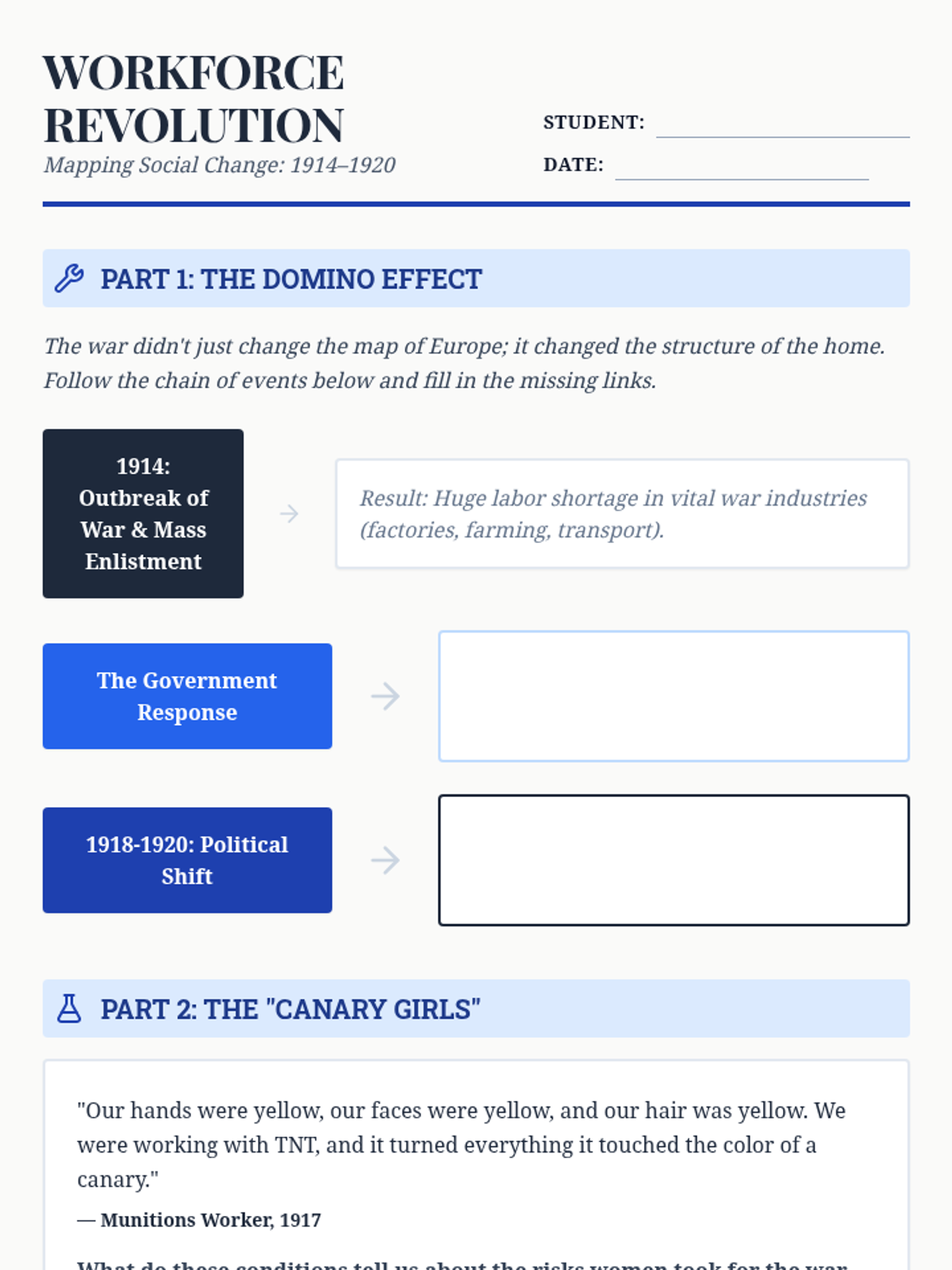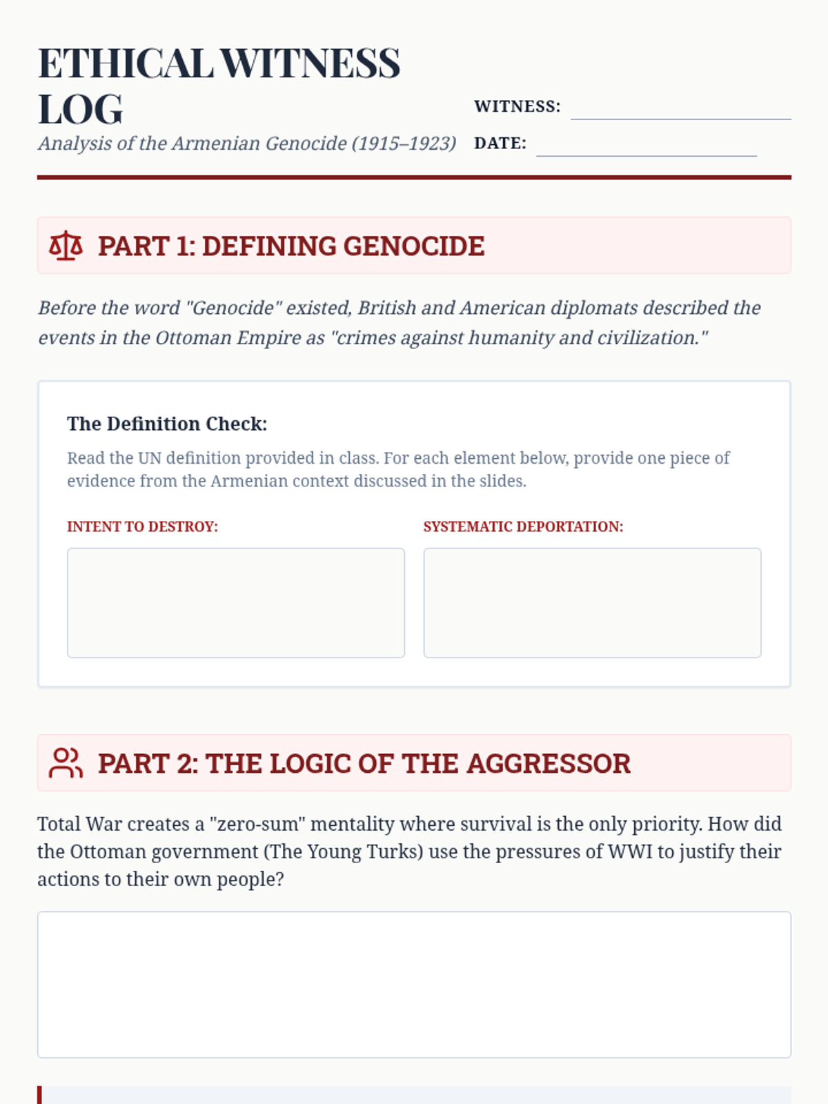 A comprehensive 5-lesson unit for 9th-grade students exploring the concept of Total War during WWI, focusing on the home front, propaganda, women's roles, colonial involvement, and the Armenian Genocide.