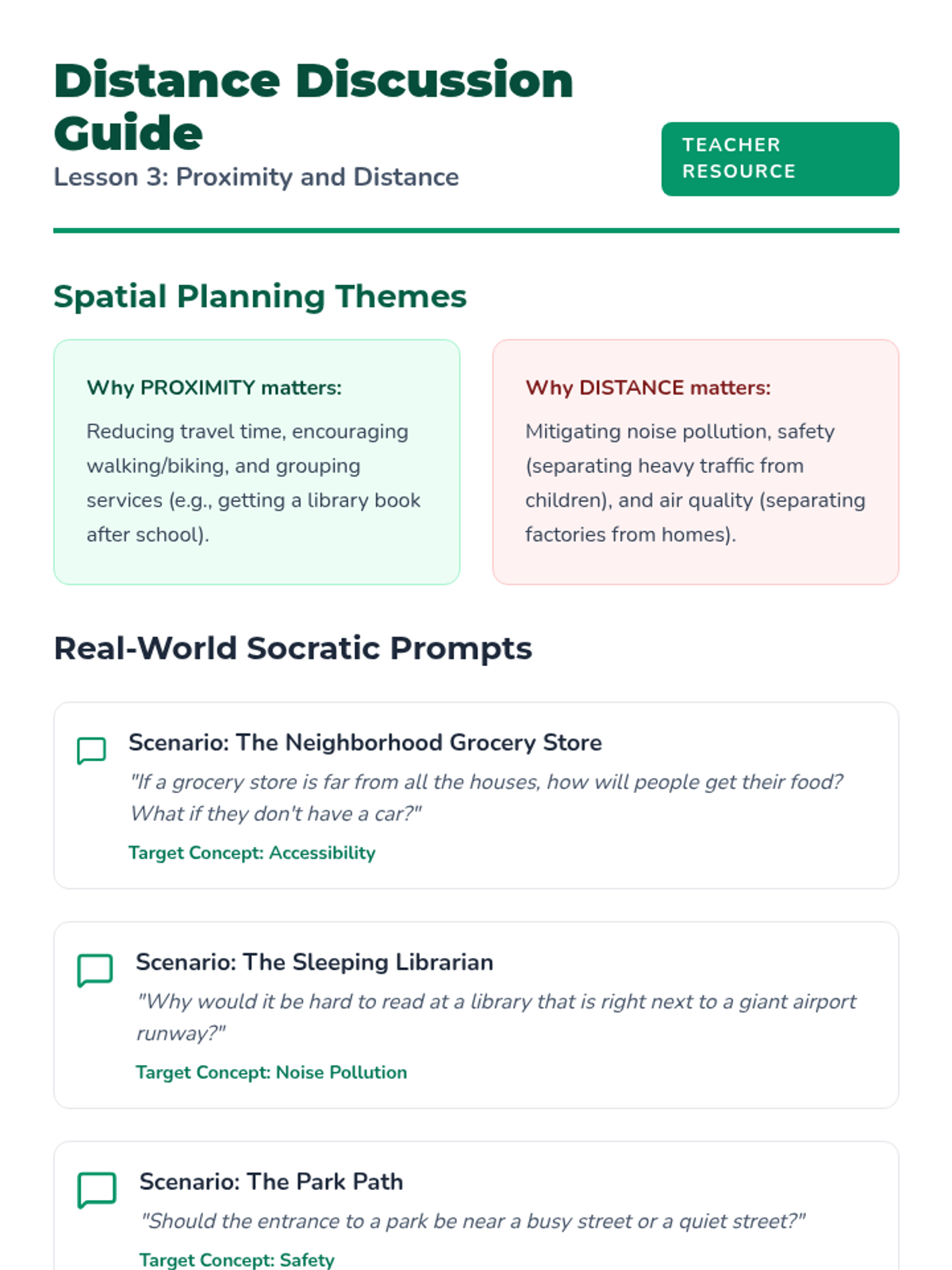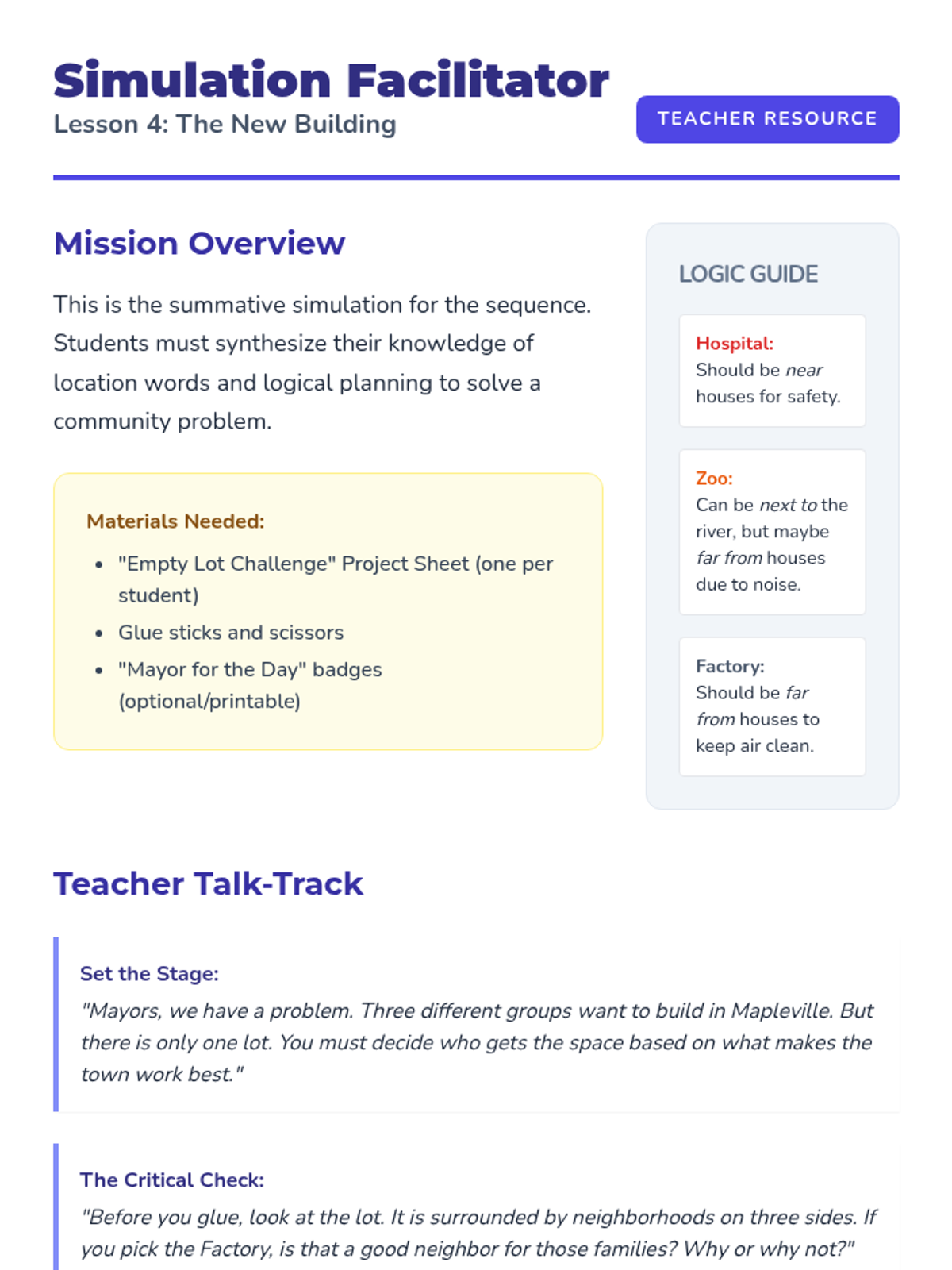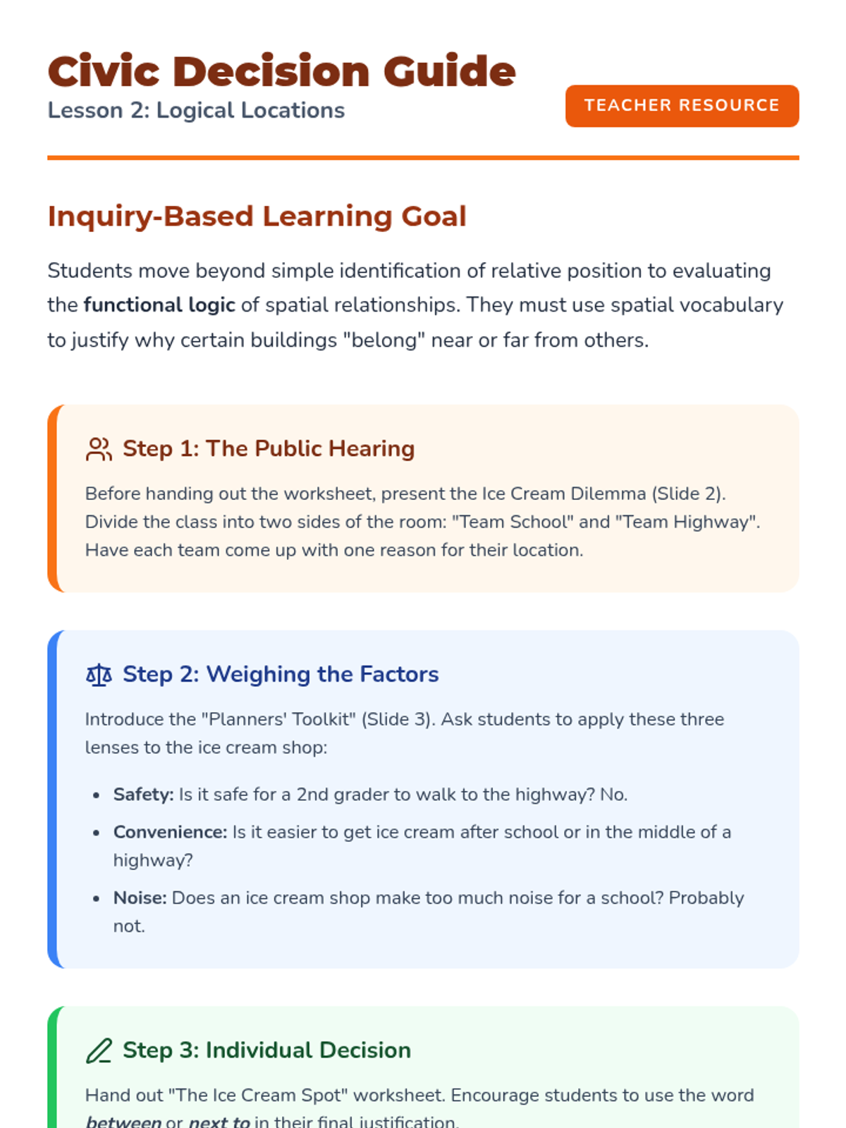 A 5-lesson sequence for 2nd grade students exploring spatial relationships and community planning. Students learn to use location words (next to, between, far from) to analyze and design functional town layouts through a case-study and simulation approach.