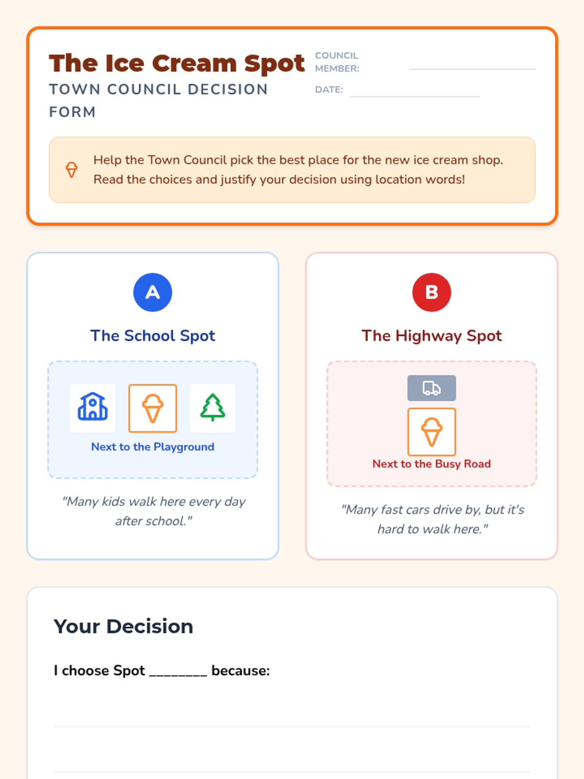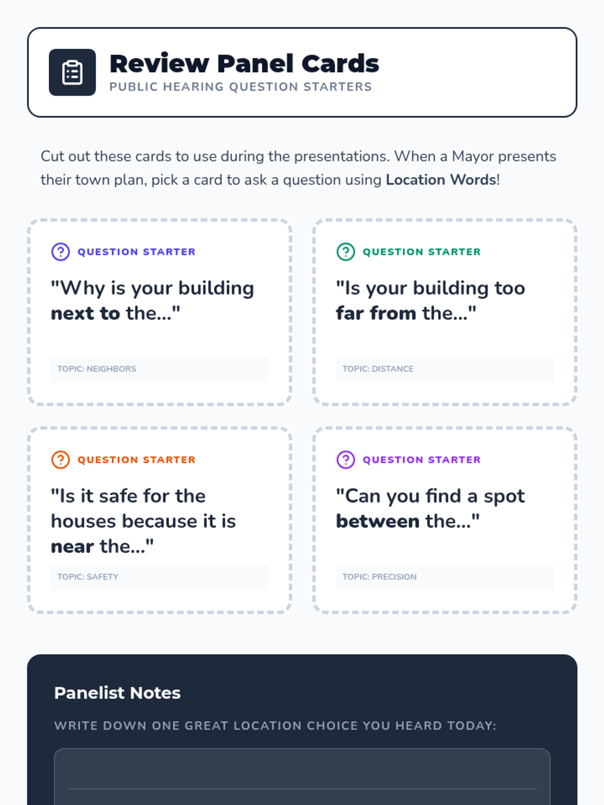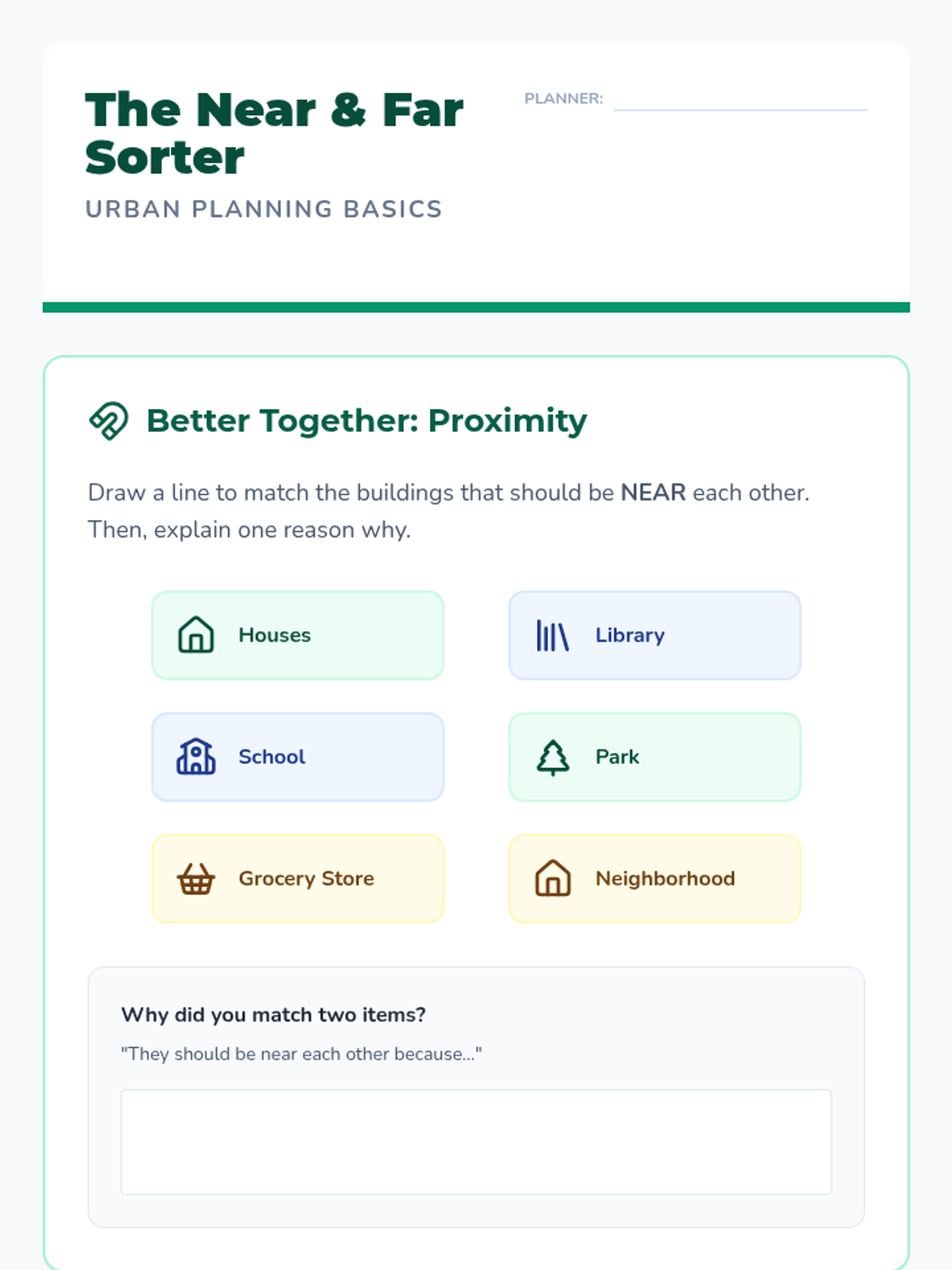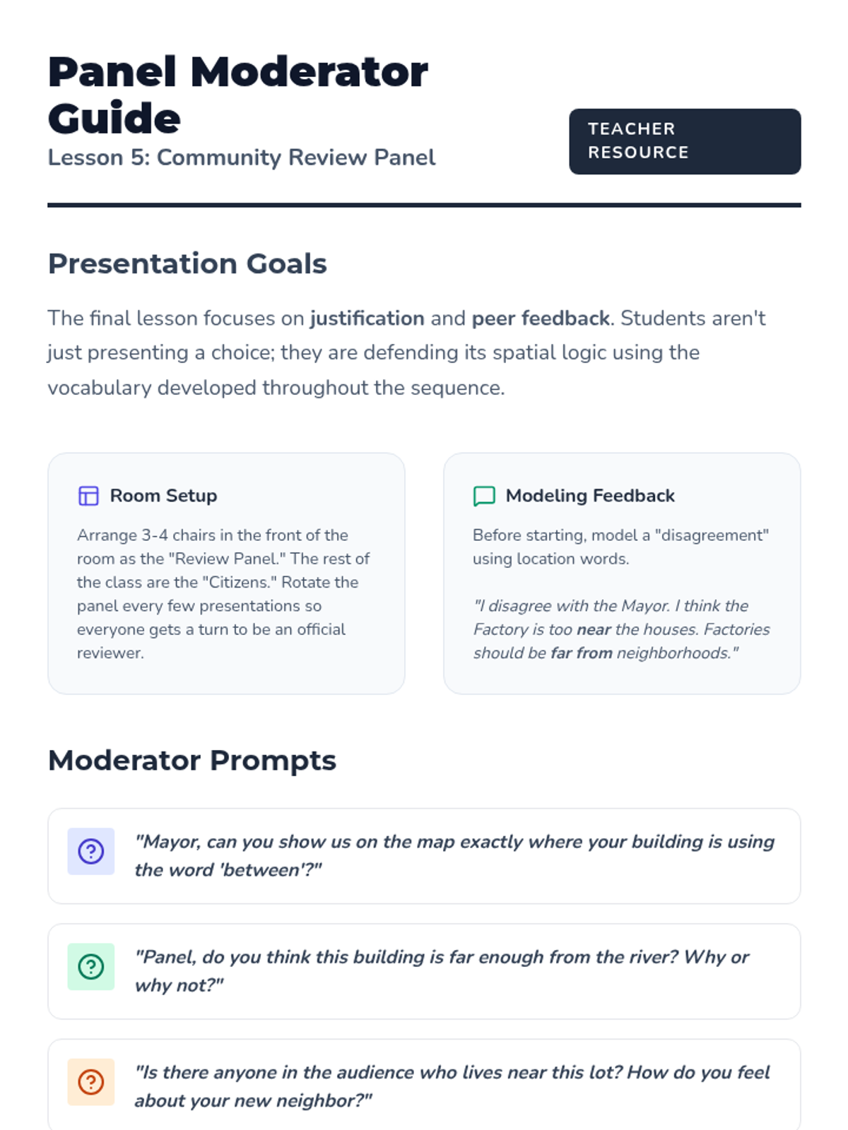 A 5-lesson sequence for 2nd grade students exploring spatial relationships and community planning. Students learn to use location words (next to, between, far from) to analyze and design functional town layouts through a case-study and simulation approach.