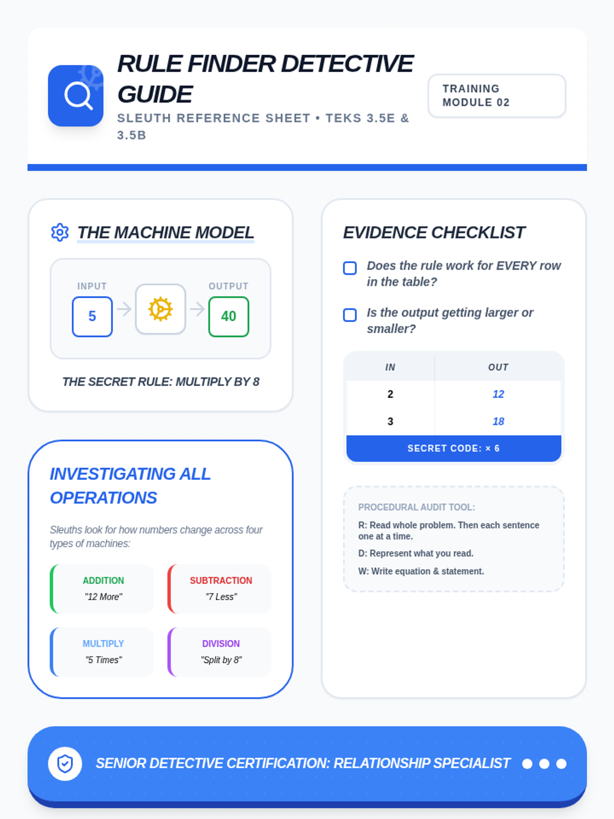 A math sequence focused on statistical analysis, data collection, and visualization through the lens of a detective agency. Students learn to create frequency tables and line plots using real-world data.
