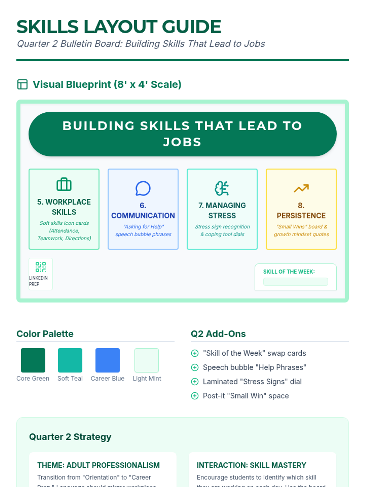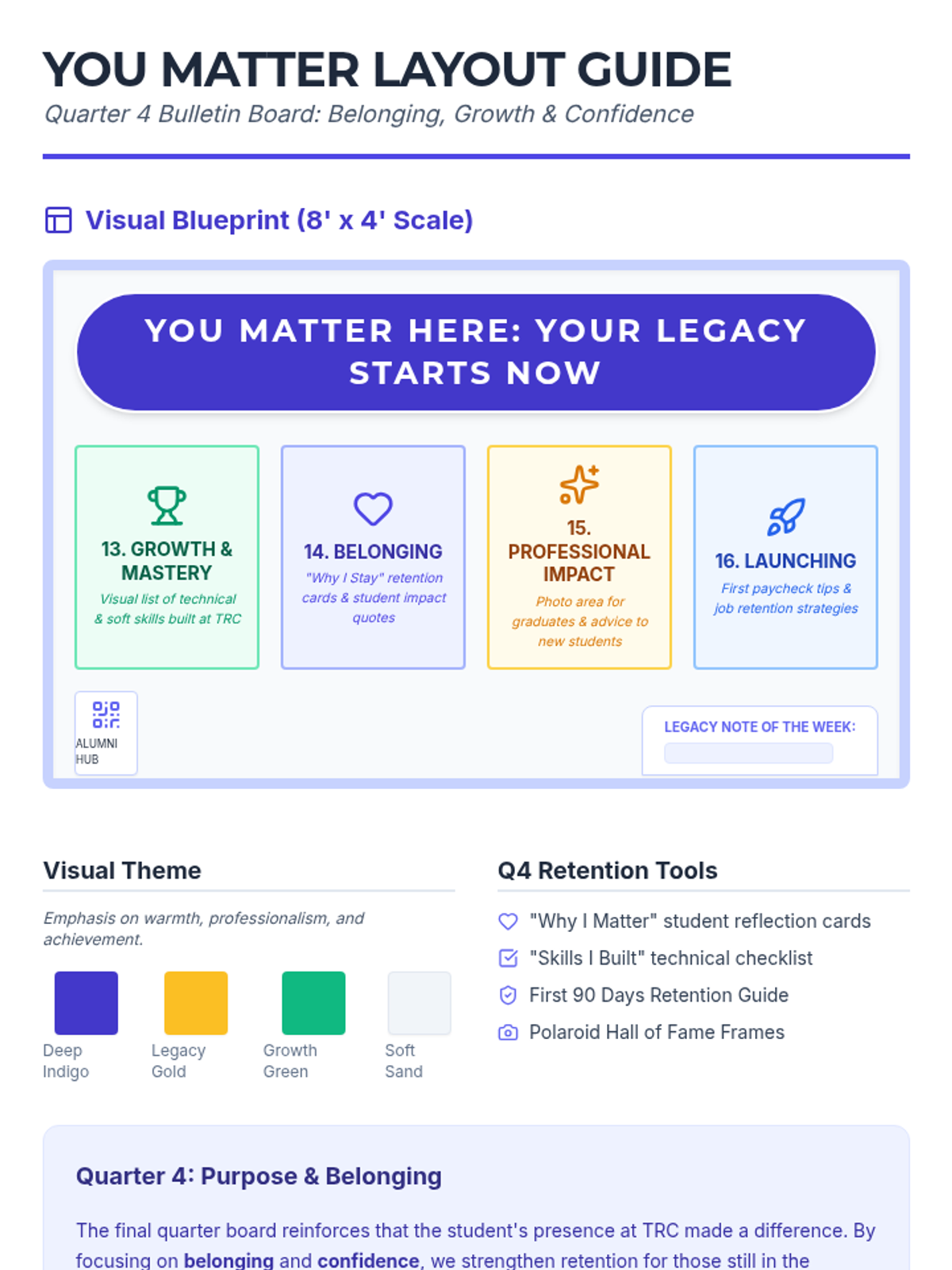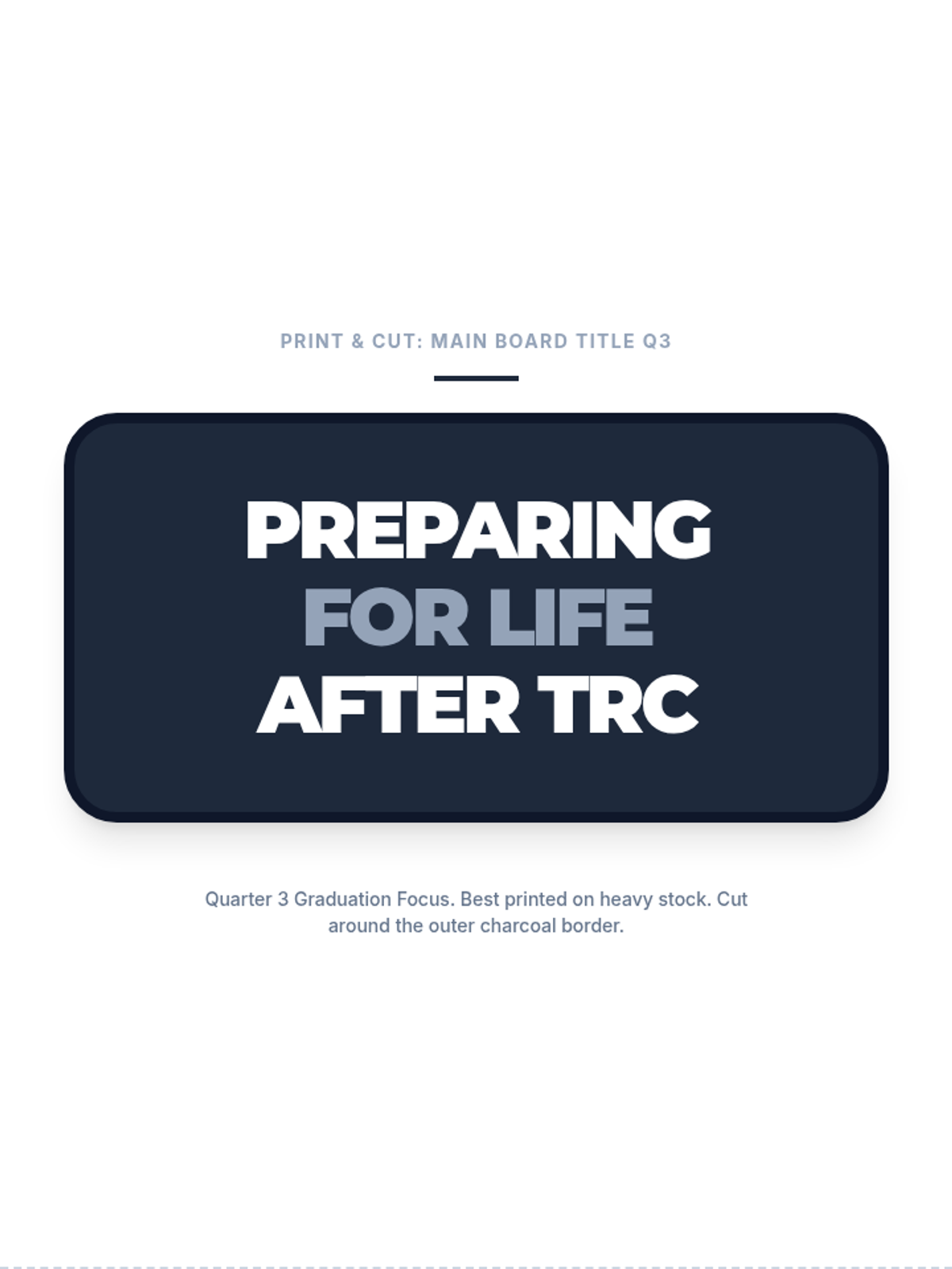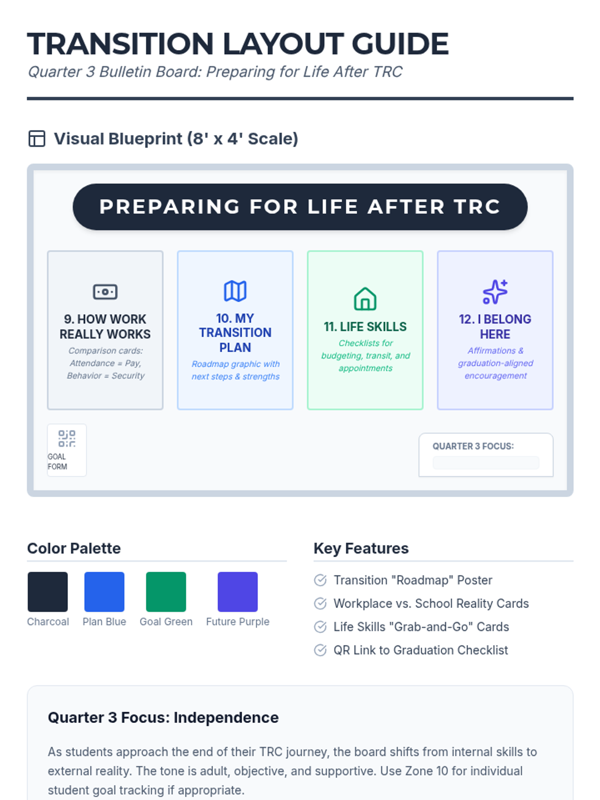 A collection of quarterly bulletin board designs for TRC, providing visual blueprints and printable components to help students navigate orientation, skill-building, and transition planning.