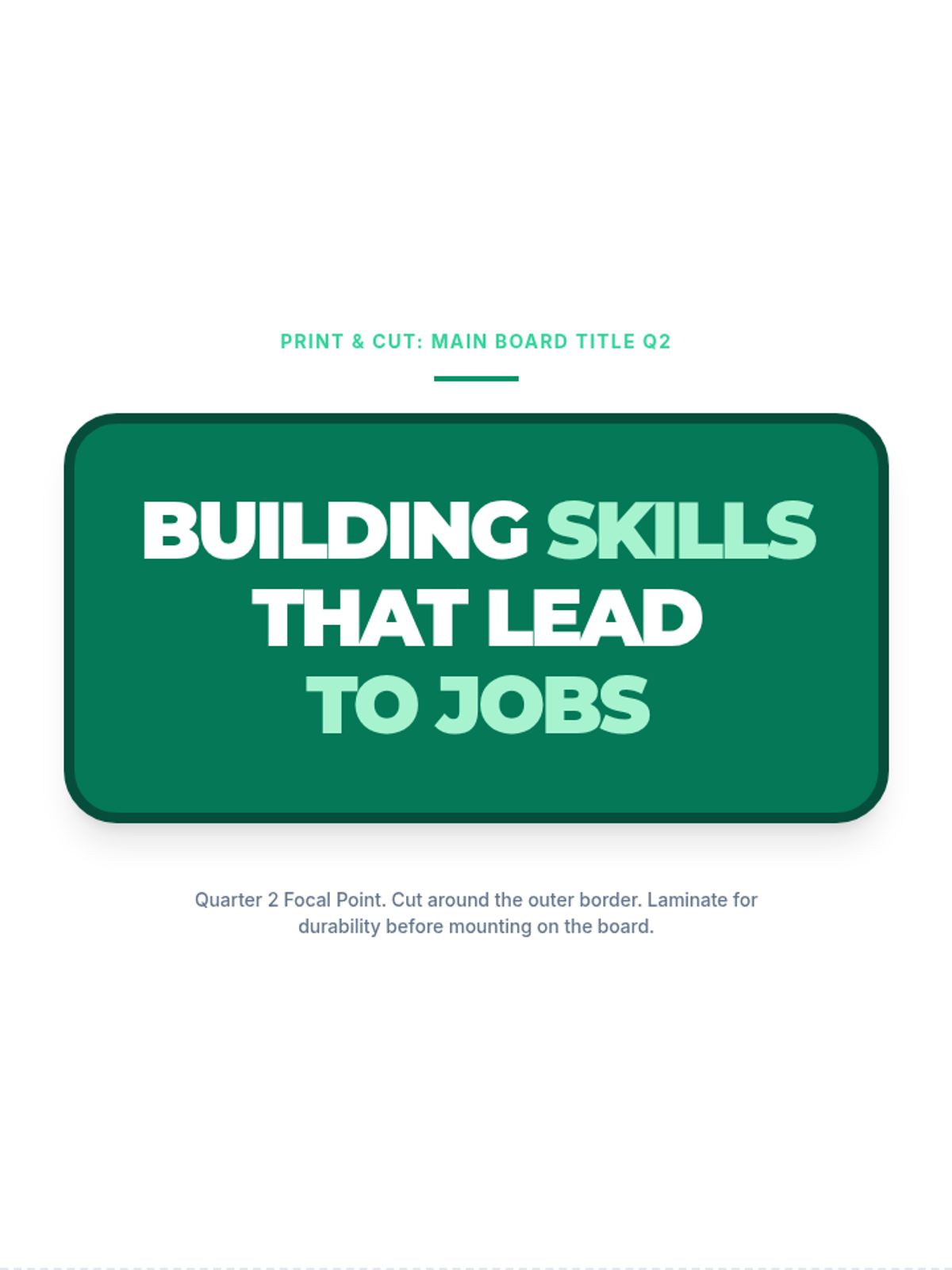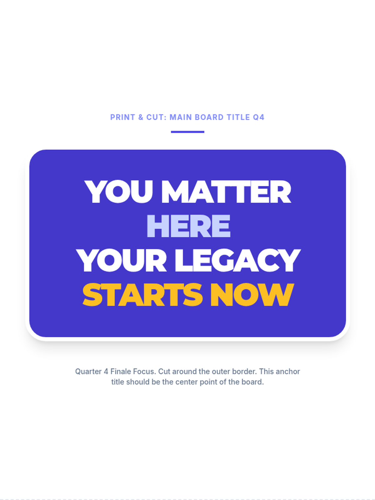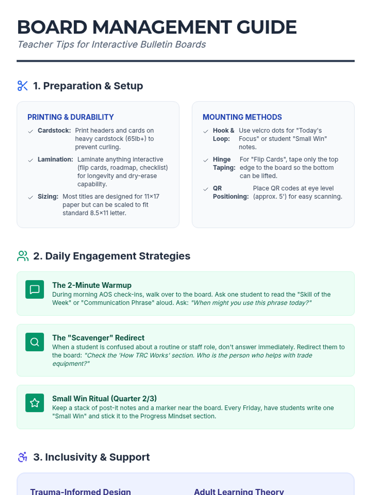 A collection of quarterly bulletin board designs for TRC, providing visual blueprints and printable components to help students navigate orientation, skill-building, and transition planning.
