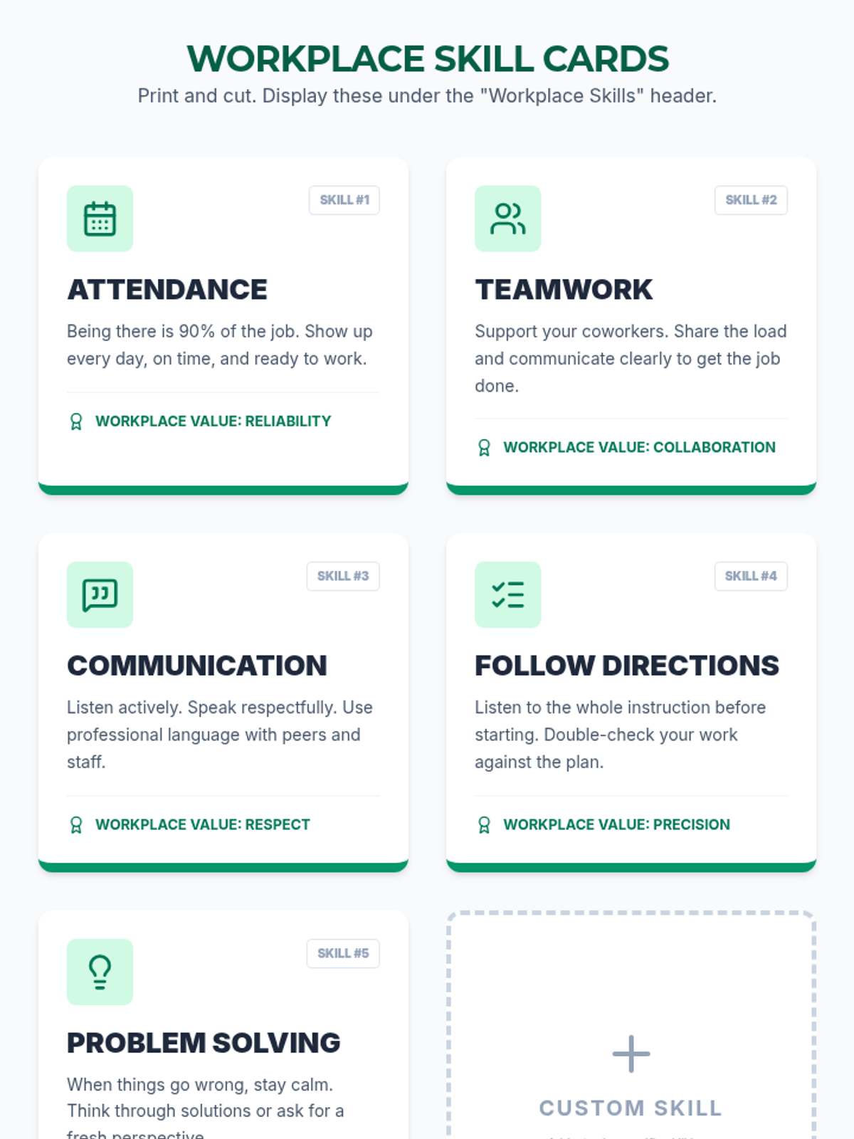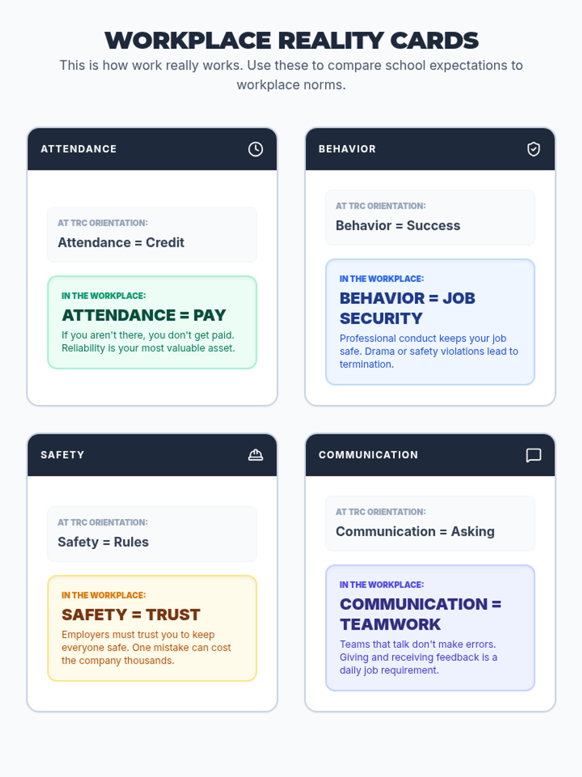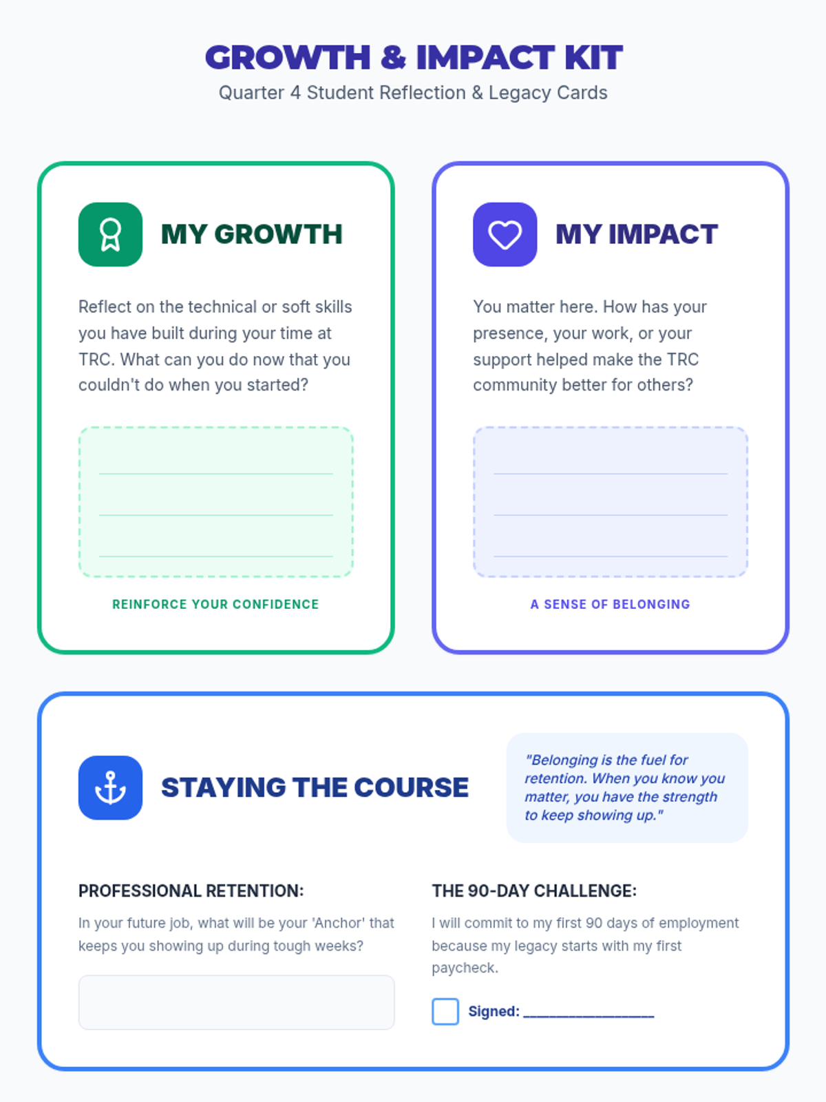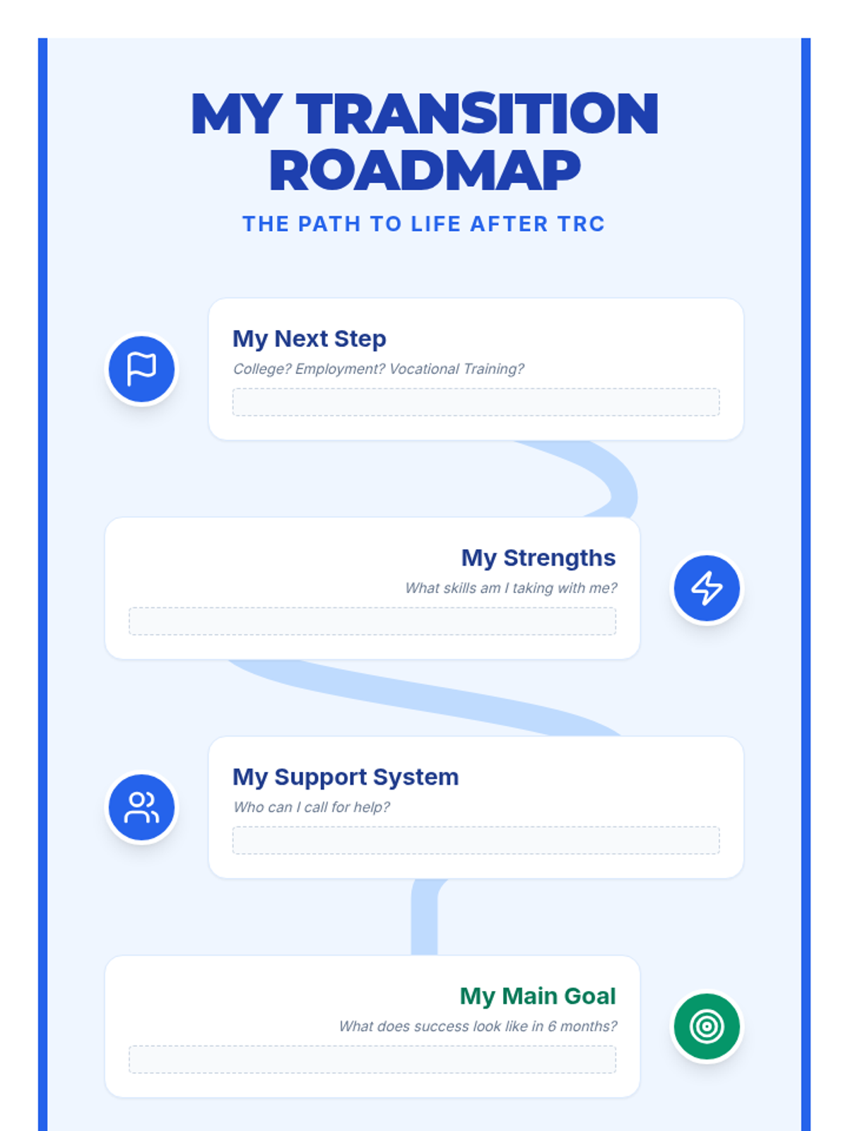 A collection of quarterly bulletin board designs for TRC, providing visual blueprints and printable components to help students navigate orientation, skill-building, and transition planning.