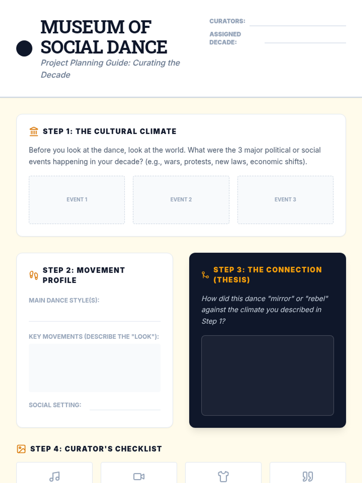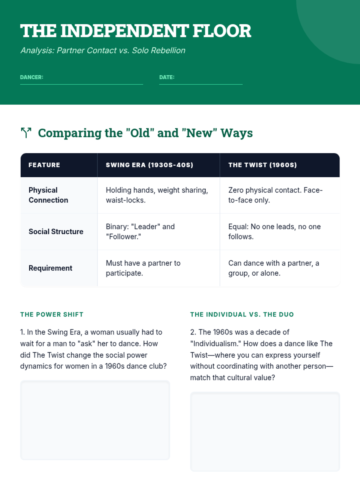 This 8th-grade sequence explores American social dance from the 1920s to the 1960s, analyzing how movement reflected racial struggles, youth rebellion, and shifts in individualism. Students will build a 'Museum of Social Dance' timeline project to synthesize their learning.