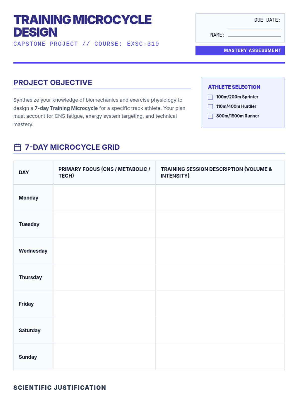 A comprehensive undergraduate sequence analyzing the biomechanical and physiological foundations of track events, from sprint mechanics to endurance energy systems and periodized training design.