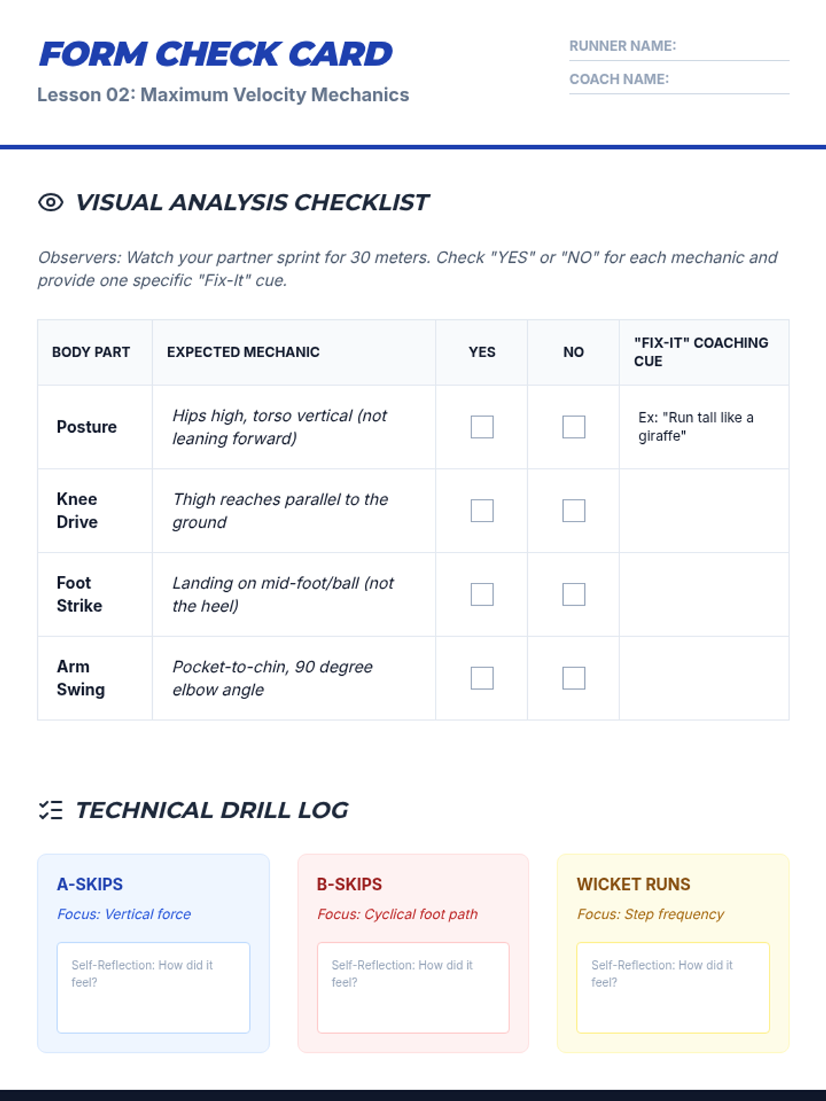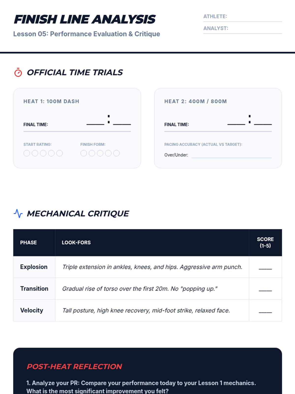 This 9th-grade physical education sequence deconstructs the biomechanics of track and field, covering explosive sprint starts, maximum velocity mechanics, relay coordination, and pacing strategies for endurance. Students transition from raw power to strategic efficiency, culminating in a performance analysis and time trial assessment.