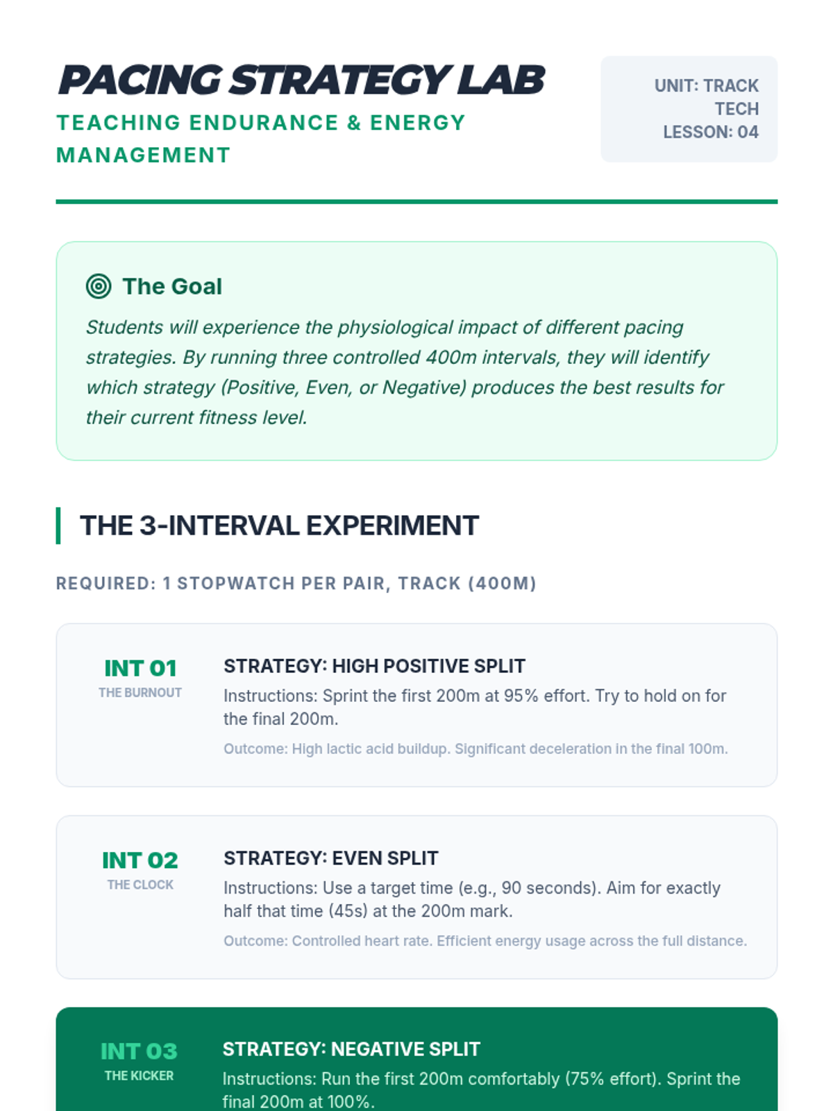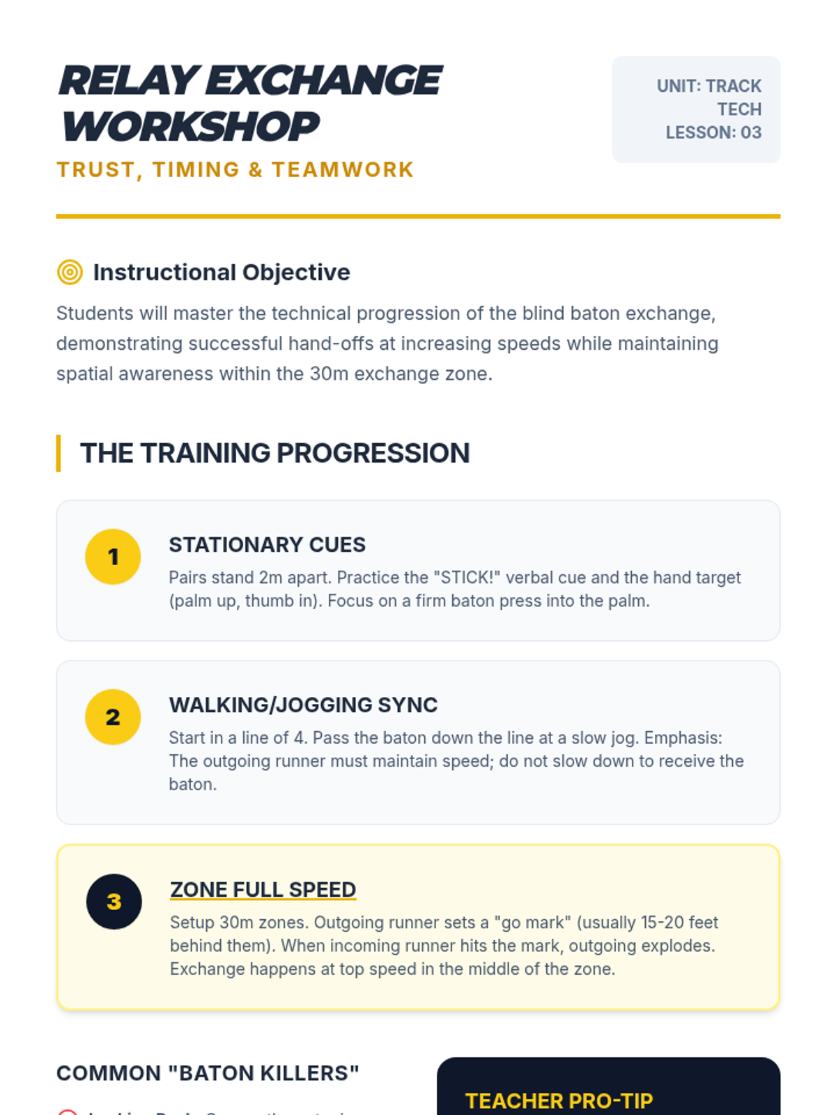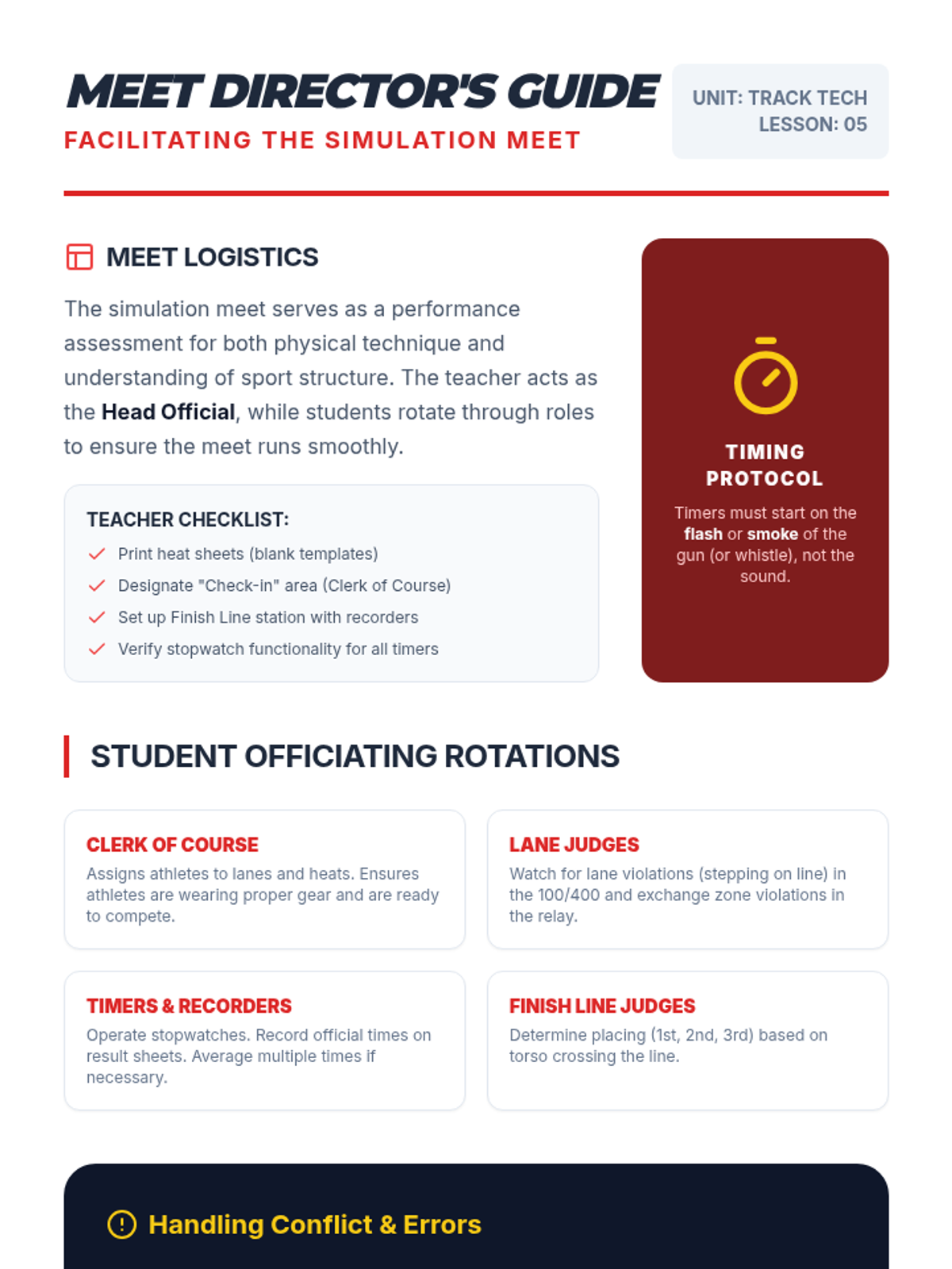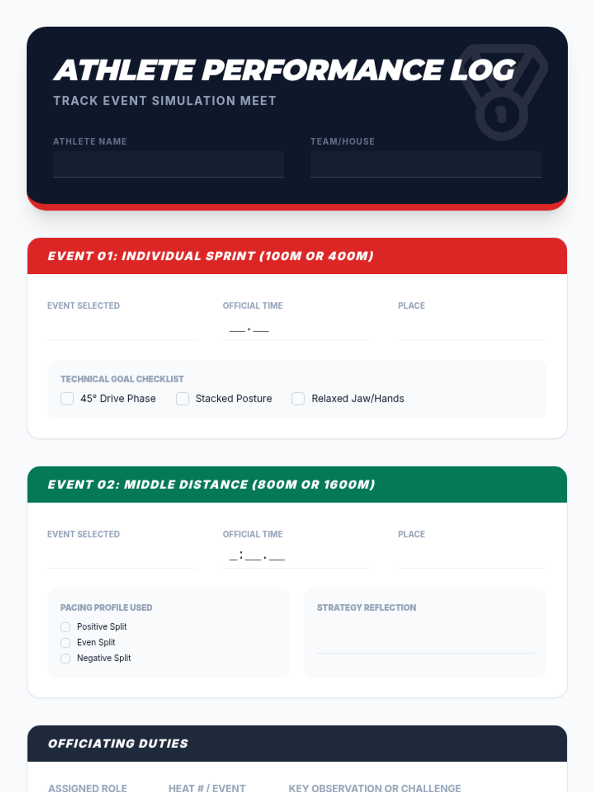 A comprehensive 10th-grade track and field unit focusing on the biomechanics of sprinting, technical relay exchanges, and strategic pacing for middle-distance events. Students analyze acceleration angles, stride efficiency, and energy system usage through video review and data collection.