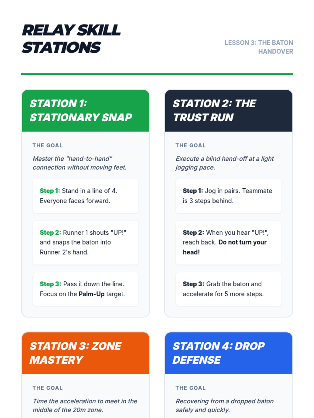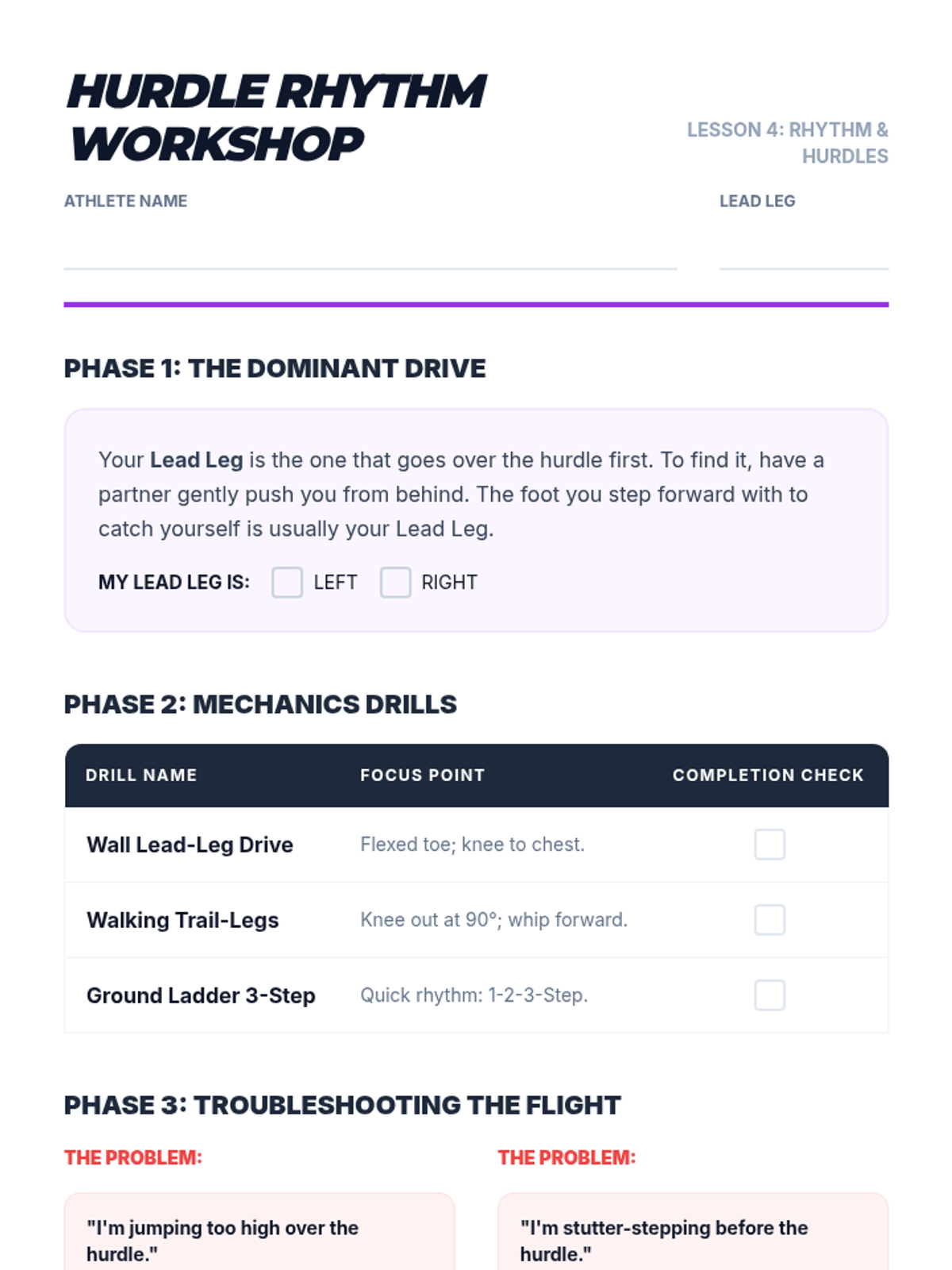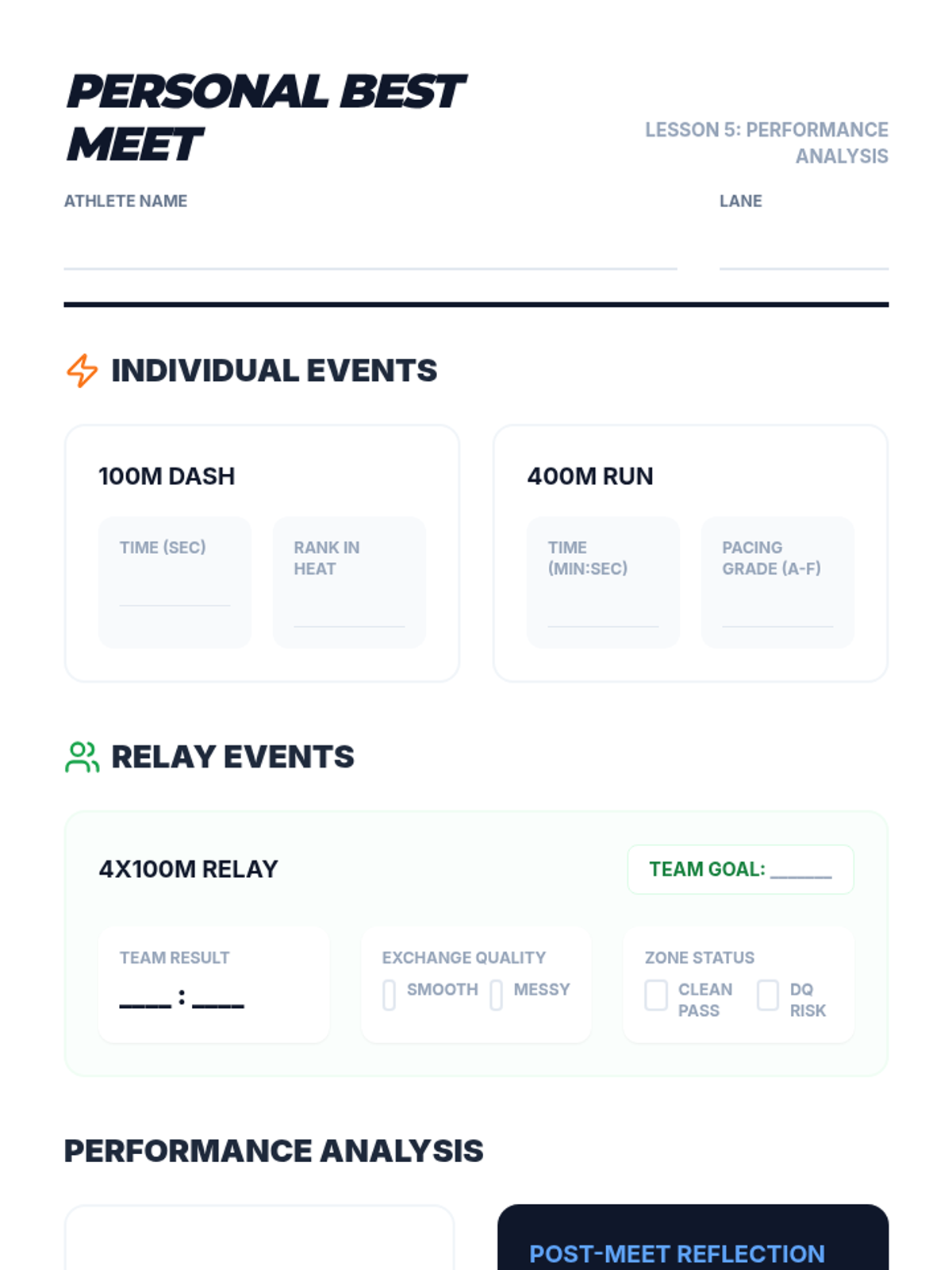 This 5-lesson sequence for 6th grade PE focuses on the biomechanics of sprinting, pacing strategies for middle distance, relay coordination, and hurdle rhythm. Students progress from individual form to collaborative teamwork, culminating in performance analysis and goal setting.